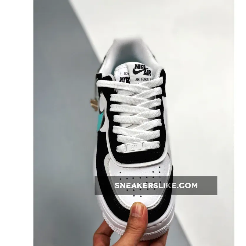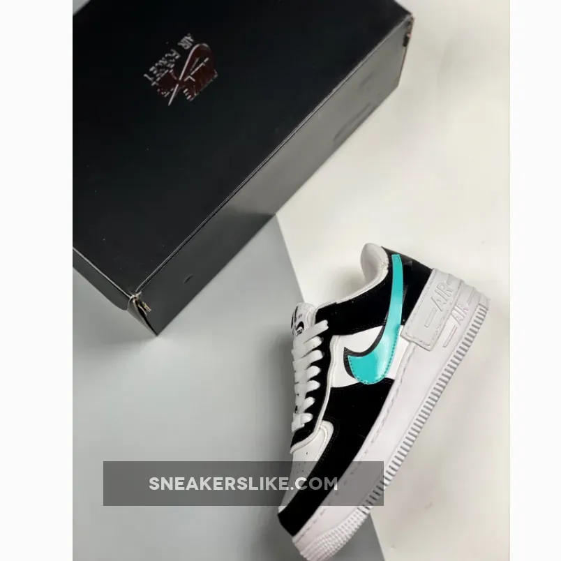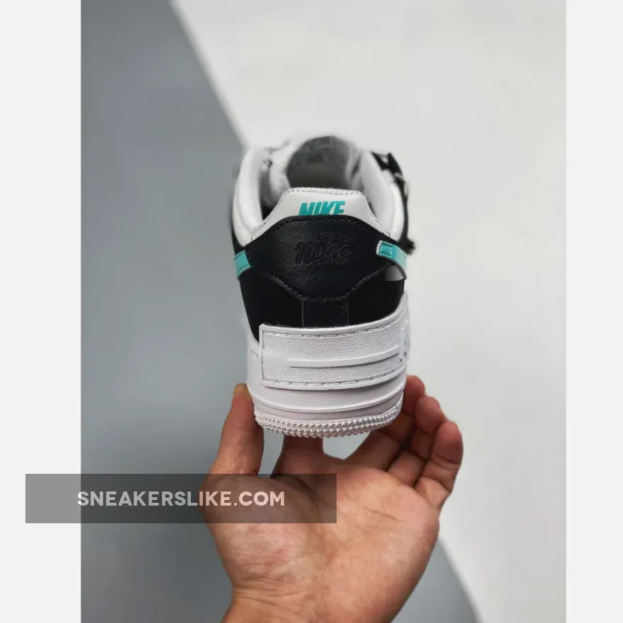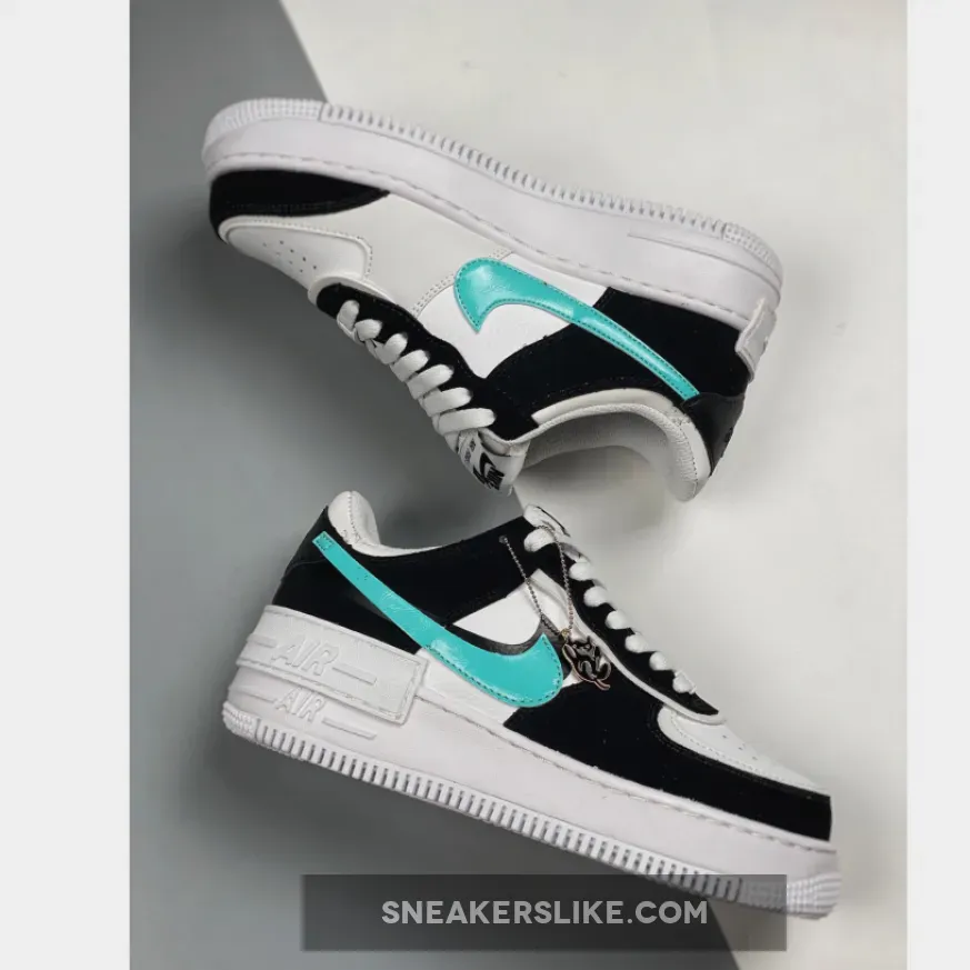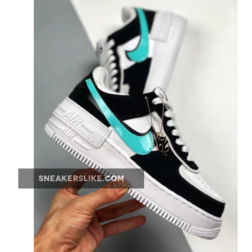 Luminous blue Swooshes light up the sidewalls with the deconstructed Swoosh across the lateral side stretching back to the overlayed panel across the heel. Doubled-up details take this white black blue AF1 Shadow to the next level, with a script logo embroidered on to the heel layered over a bright blue ‘NIKE’ motif.