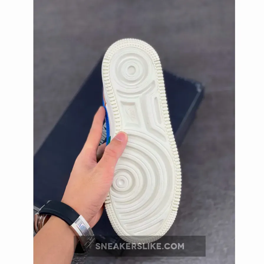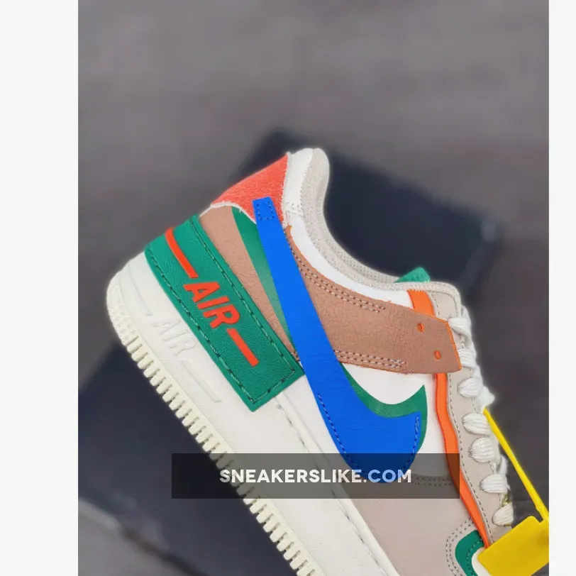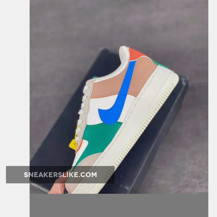 This Nike Air Force 1 Shadow comes constructed in a mix of smooth and tumbled leather with suede materials. Bold Green, Blue, and Orange contrasting accents highlight the shoe along with its signature double-layered aesthetic.