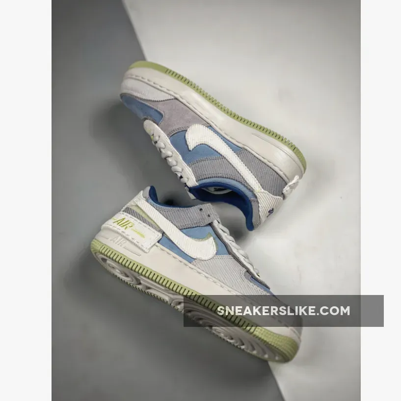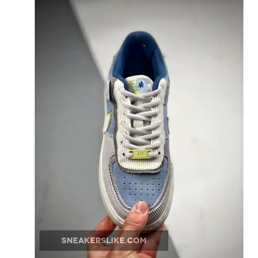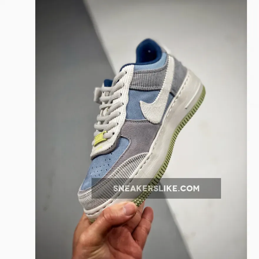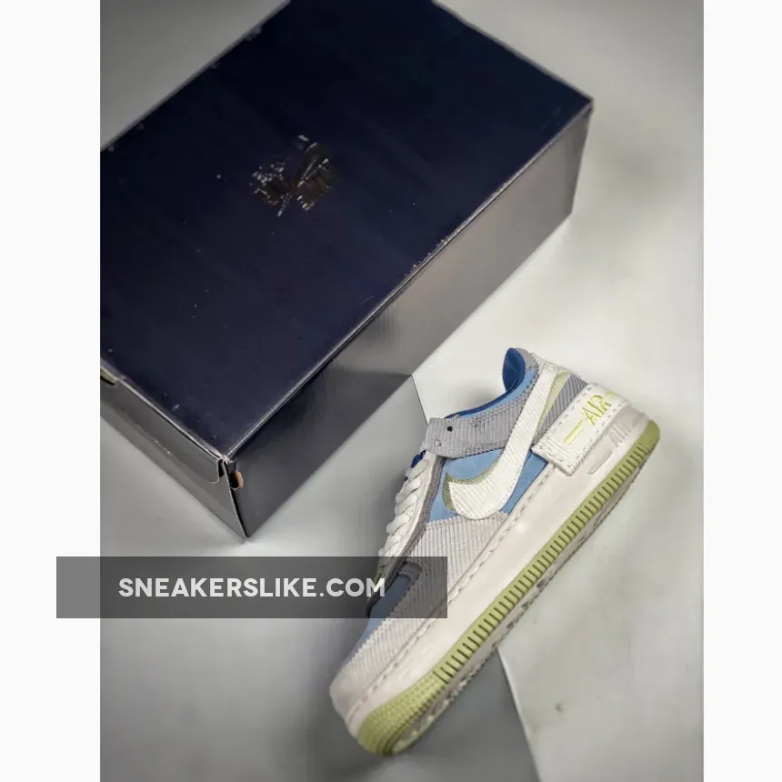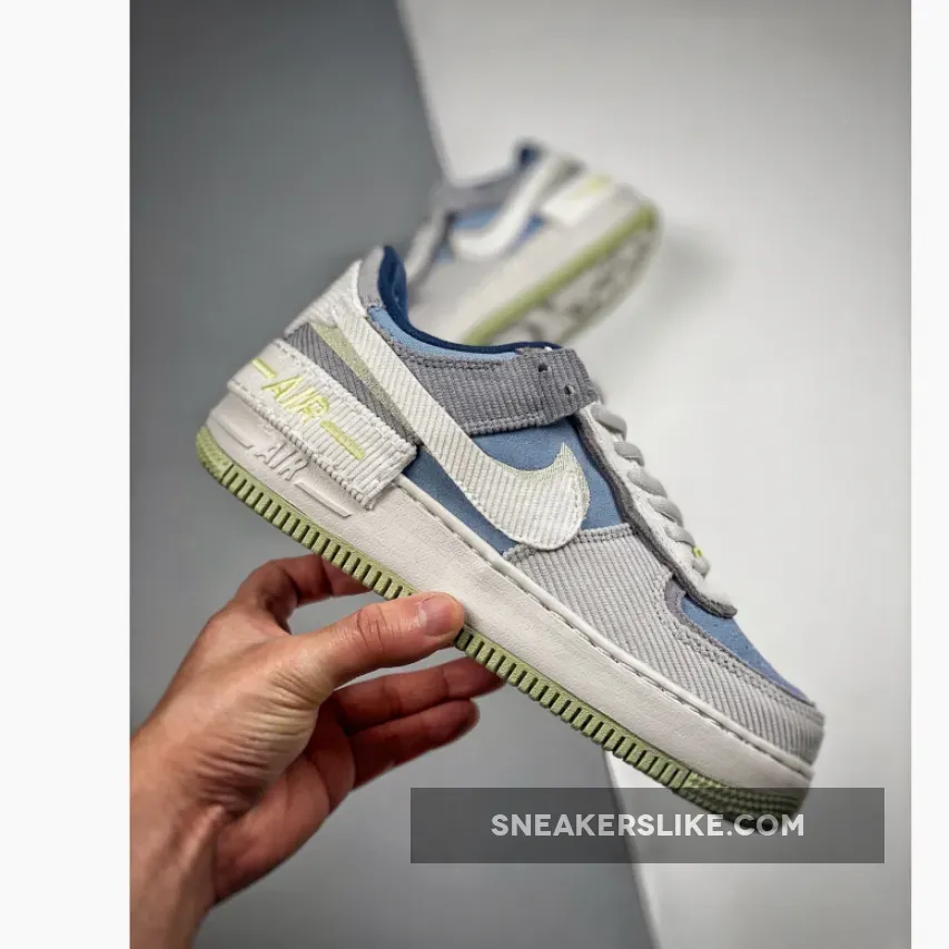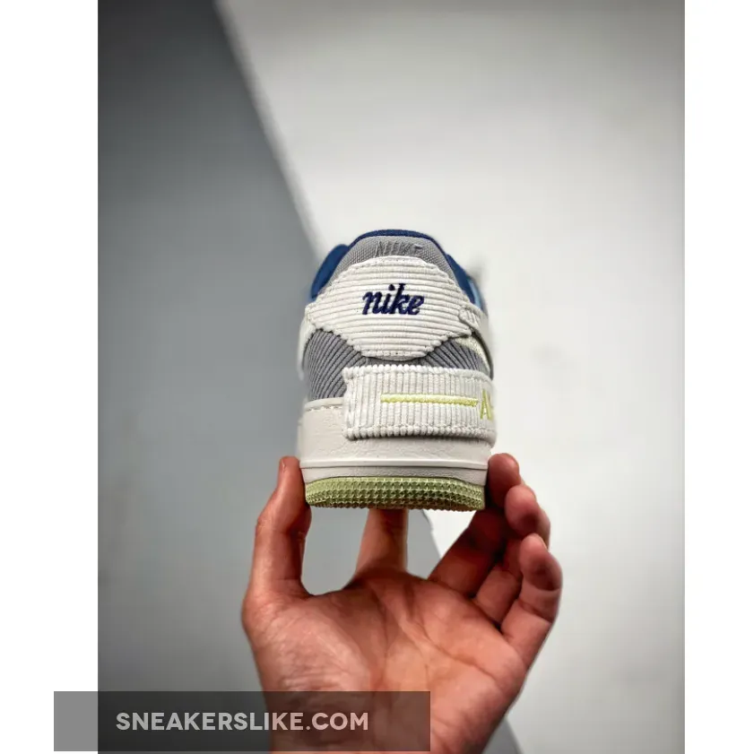 The Bruce Kilgore-designed Nike Air Force 1 Shadow is the latest silhouette to fall under the banner of Nike’s newest “Bright Side” collection. Check out the Nike Air Force 1 Shadow Bright Side Blue. This AF1 has a light greyscale colour scheme, complemented by varying shades of blue and green. Suede and corduroy panels cover the upper in sky blue on the base and grey and white on the overlays. The signature profile Swooshes show off a stacked treatment on the lateral side, a creamy embroidered first layer is patched over with a second layer in white corduroy. An embroidered Air patch is sewn right above the Air brand embossed on the midsole. A cream-coloured AF1 metallic lace deubré caps off the shoe’s style.