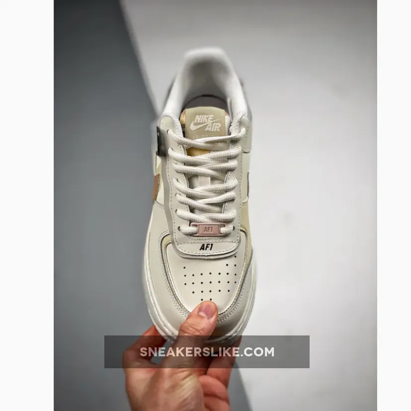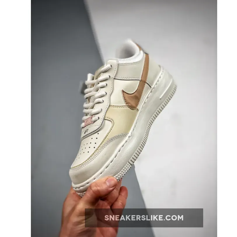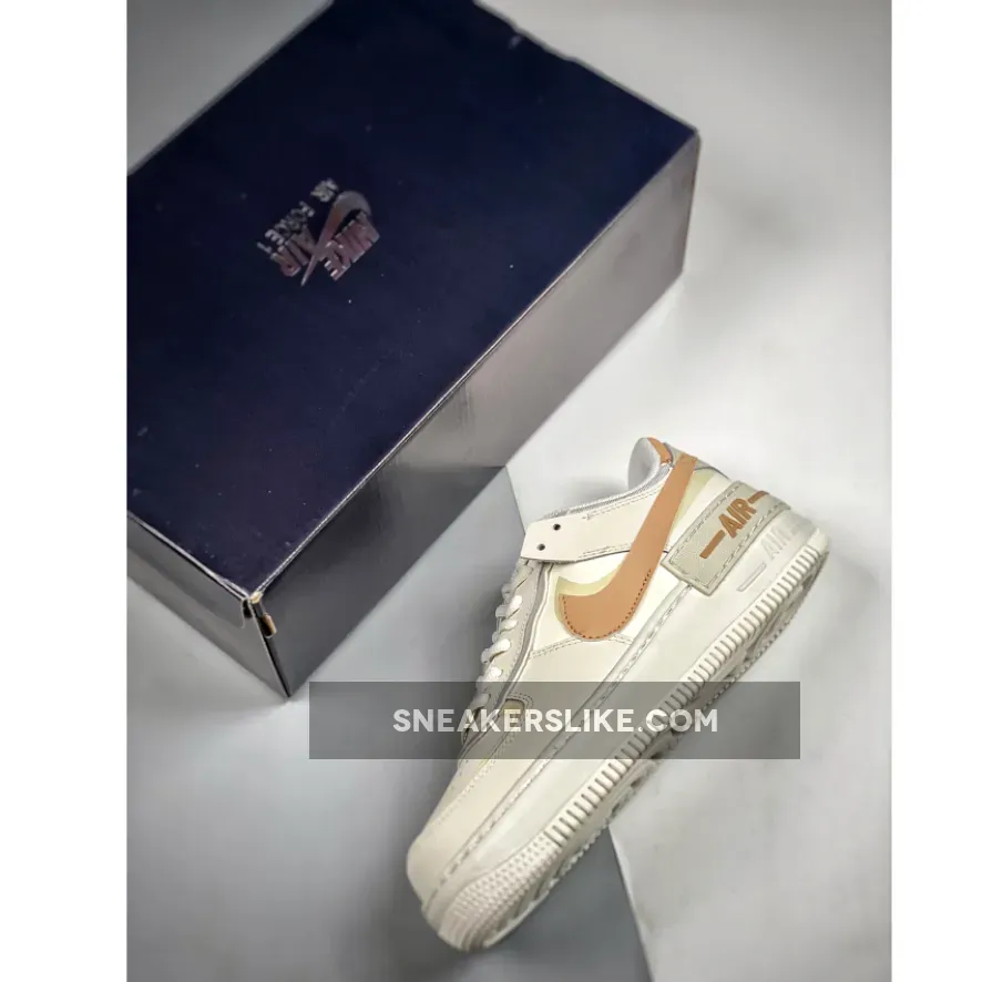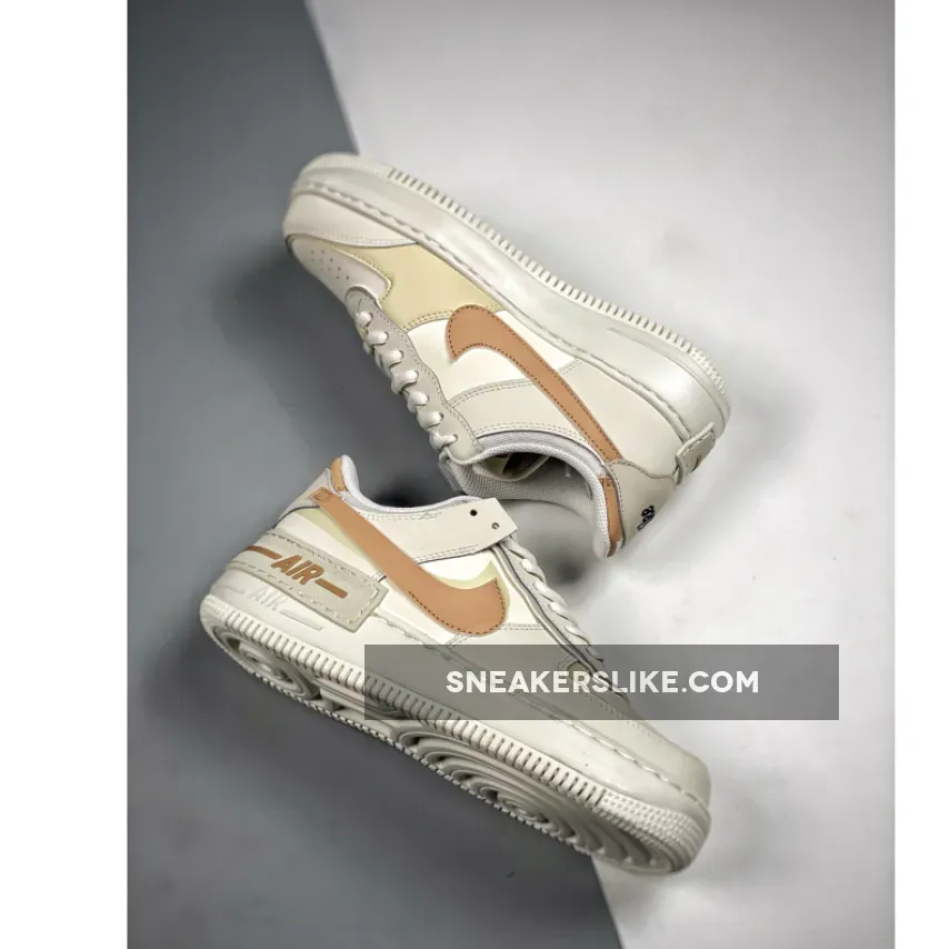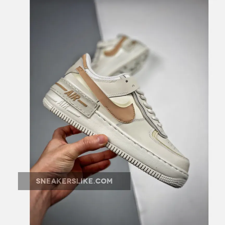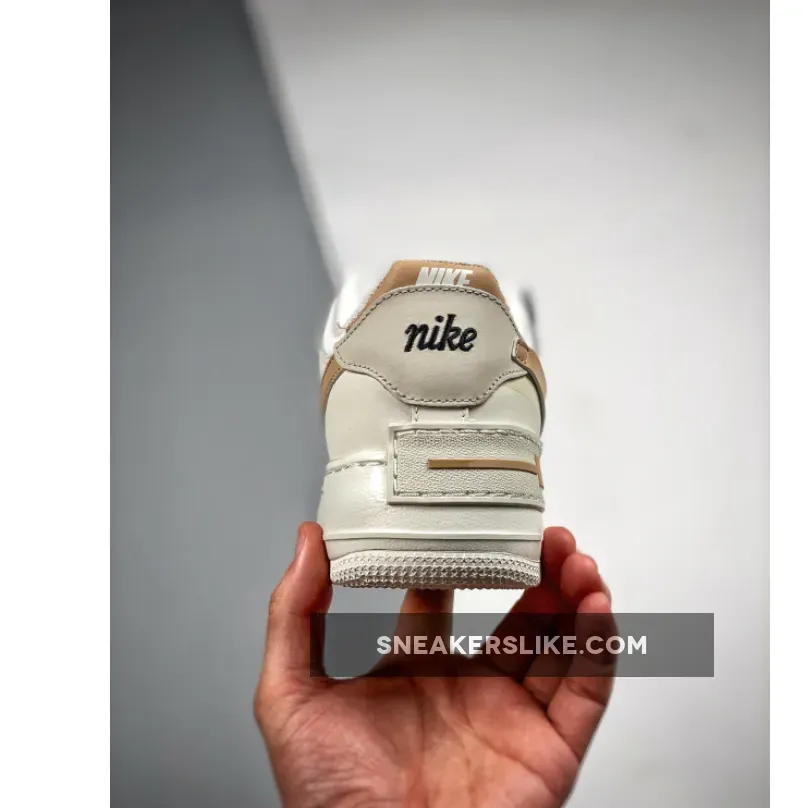 The Nike Air Force 1 Shadow Sail Hemp reveals a base in beige leather which is enhanced by brown details on signature brandings such as the side swoosh on the layered look.