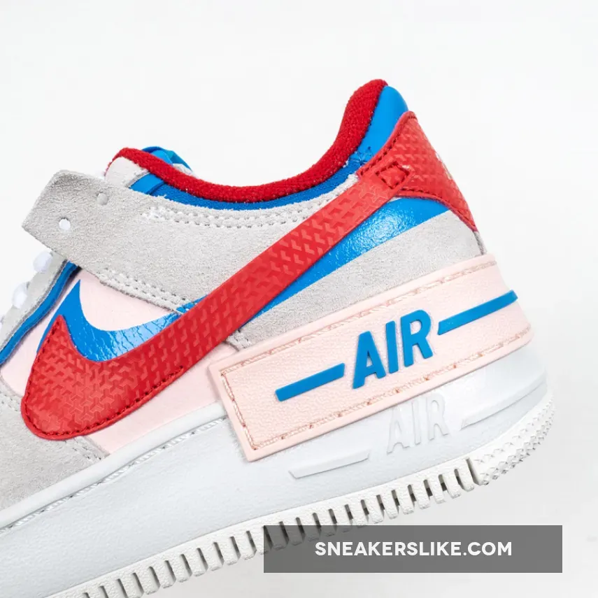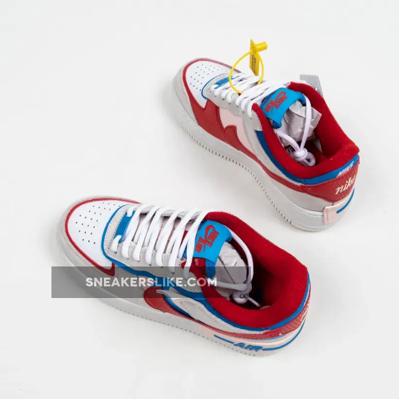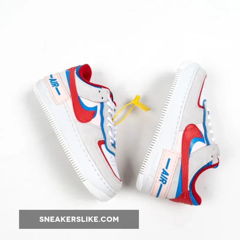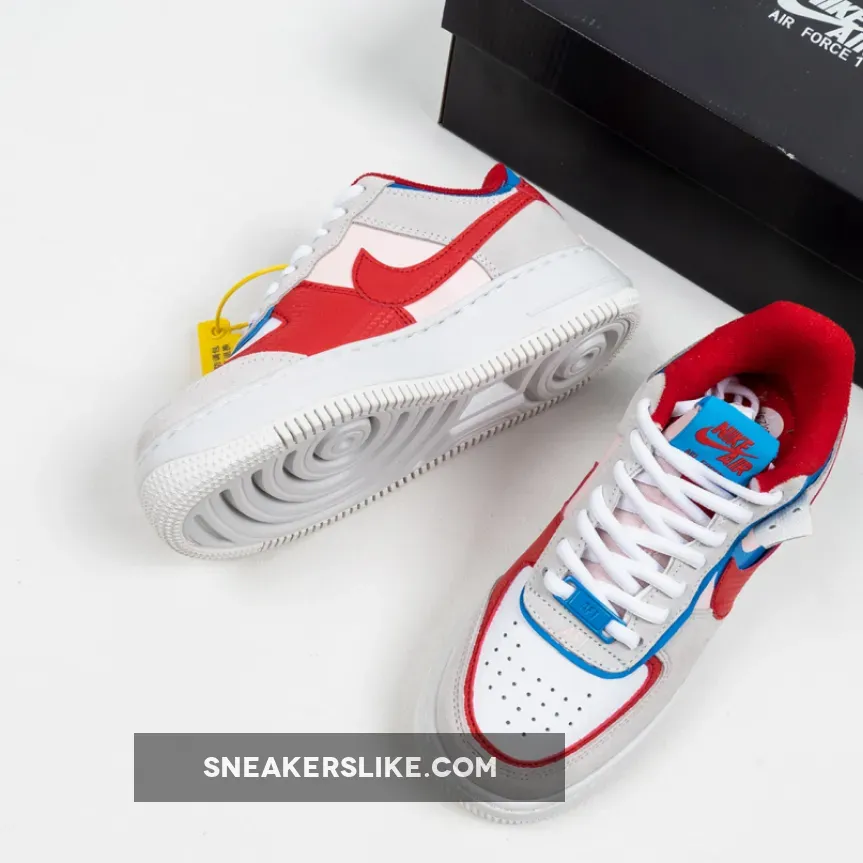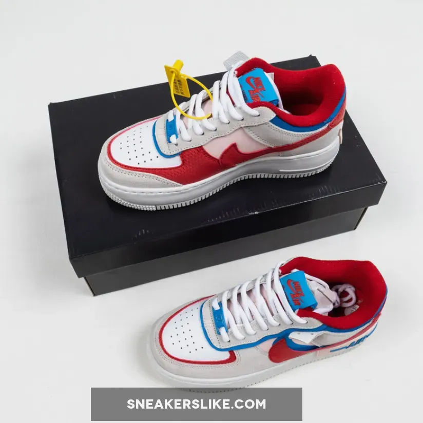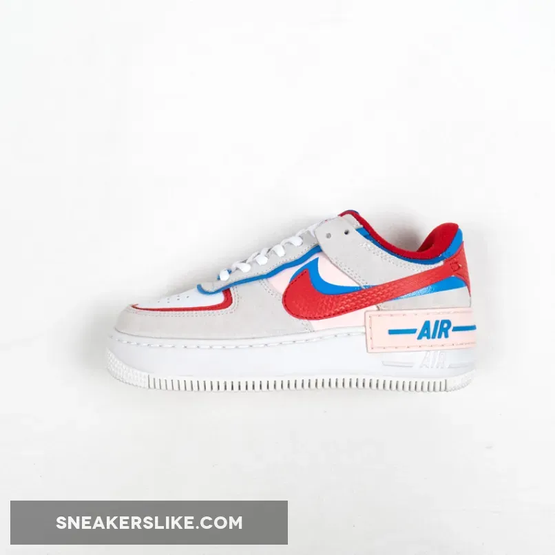 Dressed in a Sail, University Red and Photo Blue color scheme. This Nike Air Force 1 Shadow comes constructed in a mix of leather, mesh and suede highlighted with Red and Blue contrasting accents throughout.
