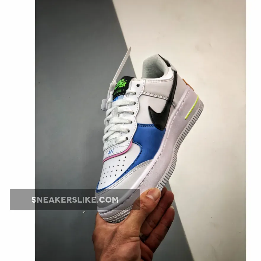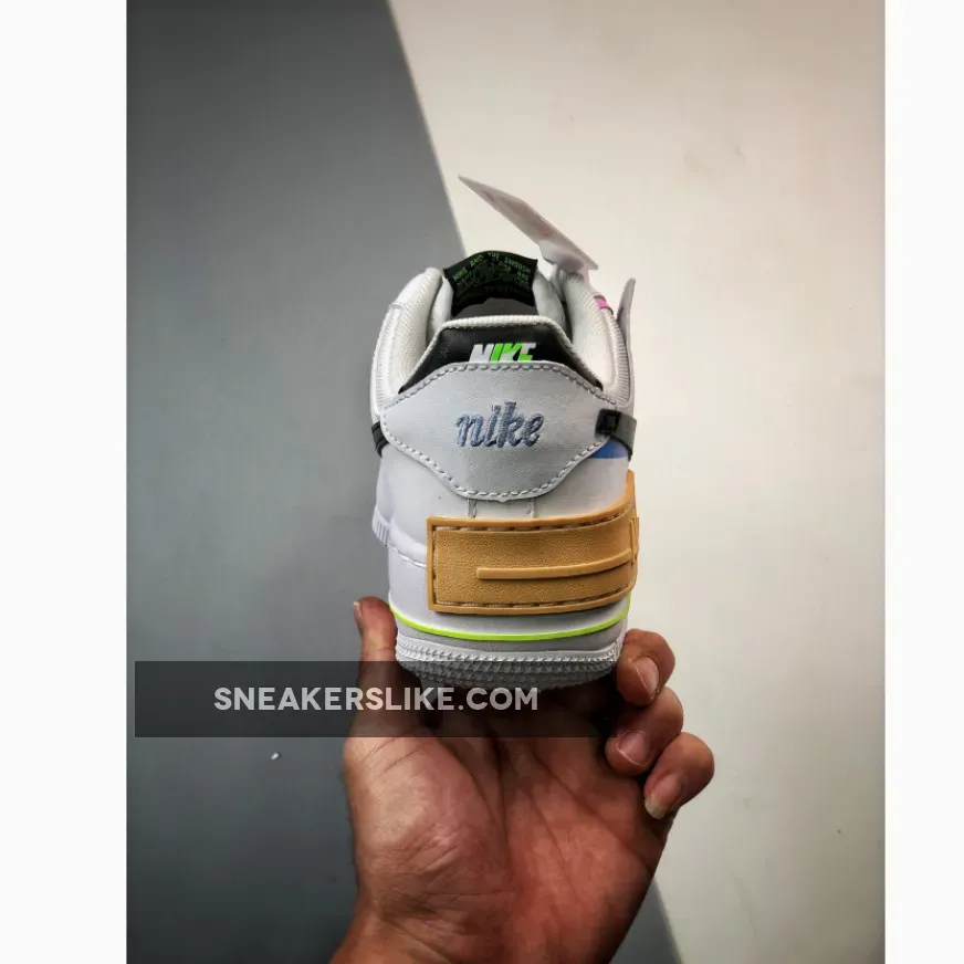 This offering of the Nike Air Force 1 Shadow comes constructed in a mix of leather and mesh materials featuring a White base detailed with pastel contrasting accents. With 2 eyestays, 2 mudguards, 2 backtabs and 2 swoosh logos, you get a layered look with double the branding.Exploring its titular hues across a clad white base, crisp colorless shades further outfit the laces and sock liner before doubled-up overlays at the vamp and quarter render a cornflower blue and bright pink shadow, respectively. Contrasting the tonally lightened aesthetic, pitch-dark tongue tabs implore a seldom neon green accent before its glossy black leather back tabs and Swoosh follow suit. In keeping with its monicker, contoured embellishments feature a light grey midfoot Check and solid tan “AIR” panel wrapping along the heel whereas the heel counter’s added white tab concludes with baby blue branded embroidery.
