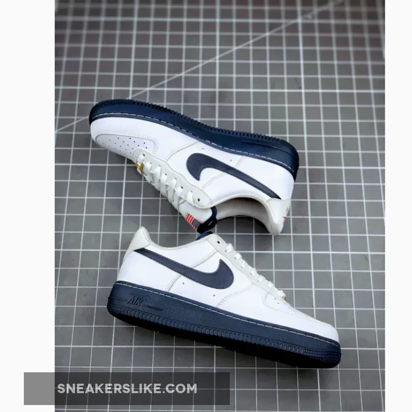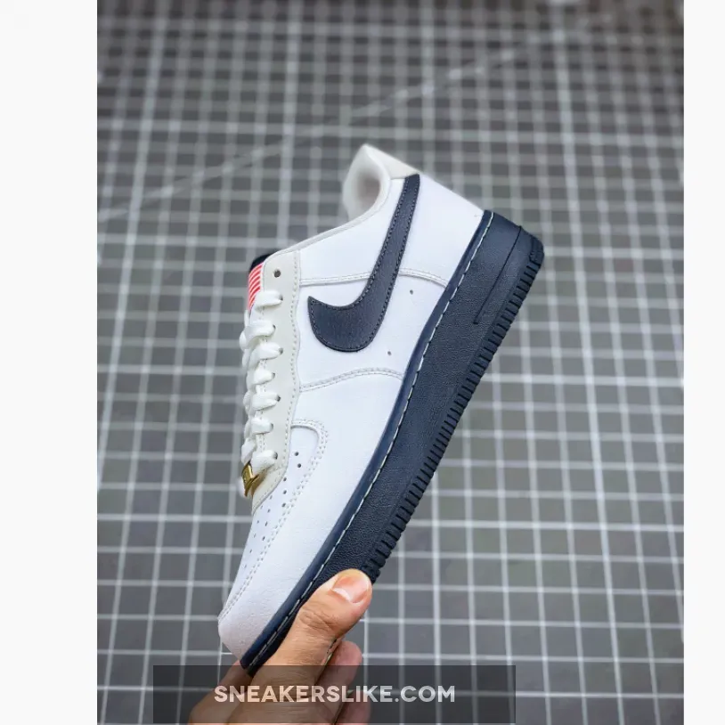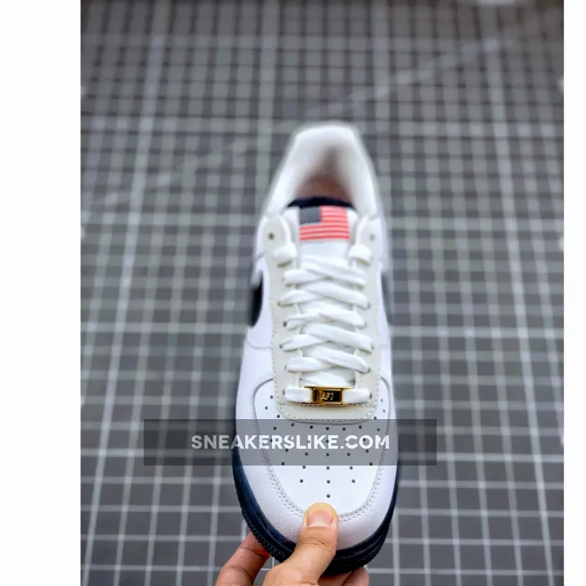 Dressed in a White, Sport Red, Metallic Gold, and Obsidian color scheme. This Nike Air Force 1 Low features a White tumbled leather upper paired with Obsidian Swoosh logos and rubber soles, along with Red contrasting accents throughout. An USA flag covers the tongue labels to complete the design.