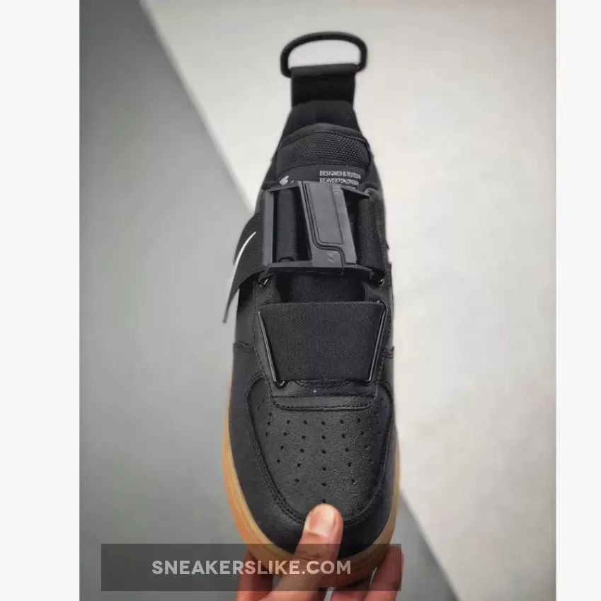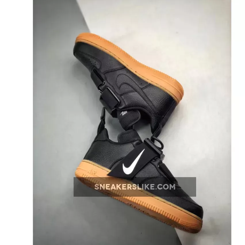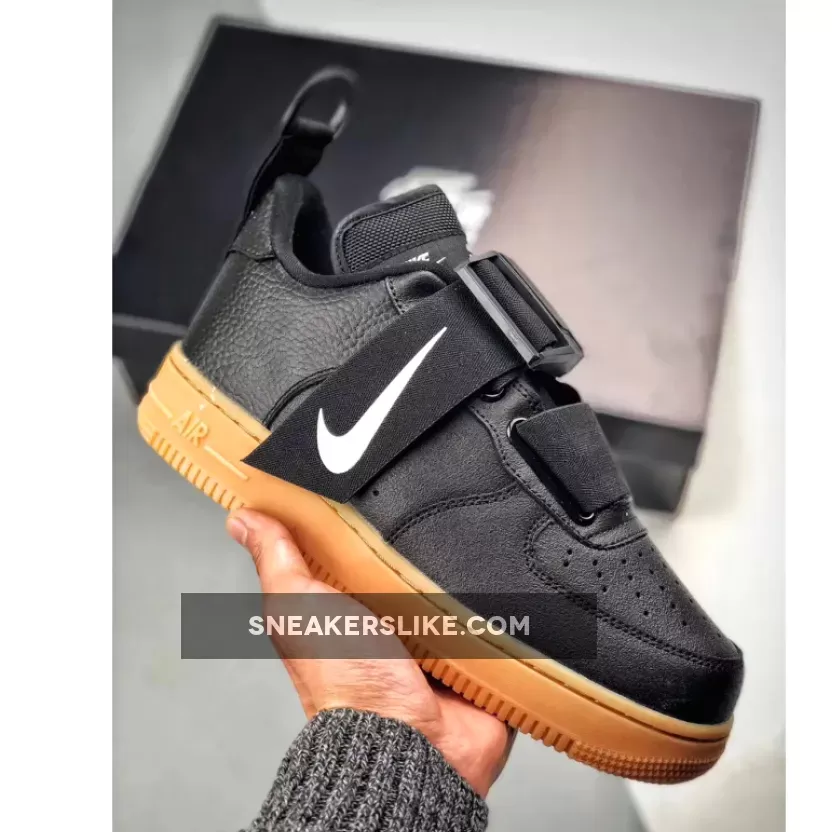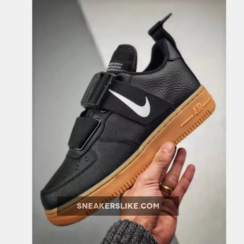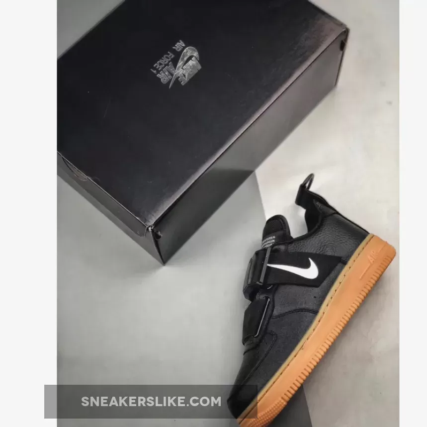 This Nike Air Force 1 Utility features a Black leather upper with ballistic nylon strap and a magnetic buckle closure for easy access atop a Gum rubber AF1 outsole. Adding for a nice contrast are White Nike Swoosh logos and branding throughout.