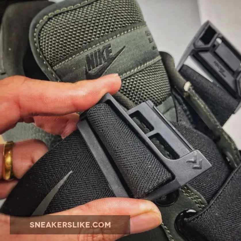 The military green leather upper provides an interesting mix of textures, as both the forefoot and the quarter panel feature a heavily textured leather while the heel opts for a more traditional tumbled pattern. The standard lacing system is nowhere to be found, replaced by two giant black straps and the elongated tongue features special factory-style branding. For a final rugged touch, the industrial-style heel tab rises well above the heel collar and adds a black metal D-ring.