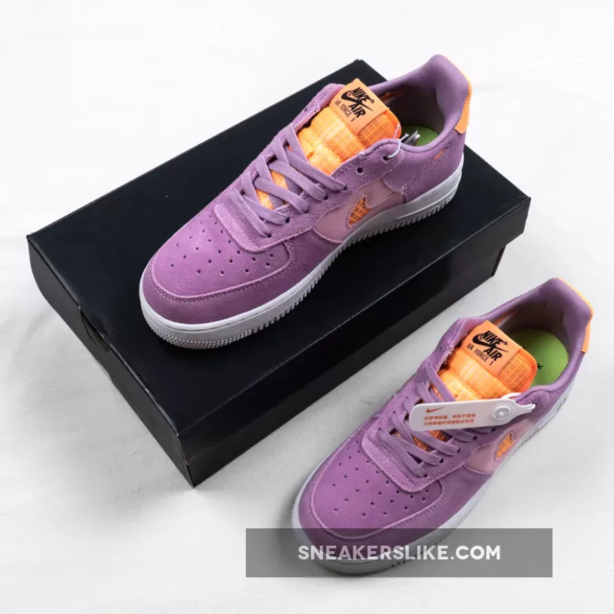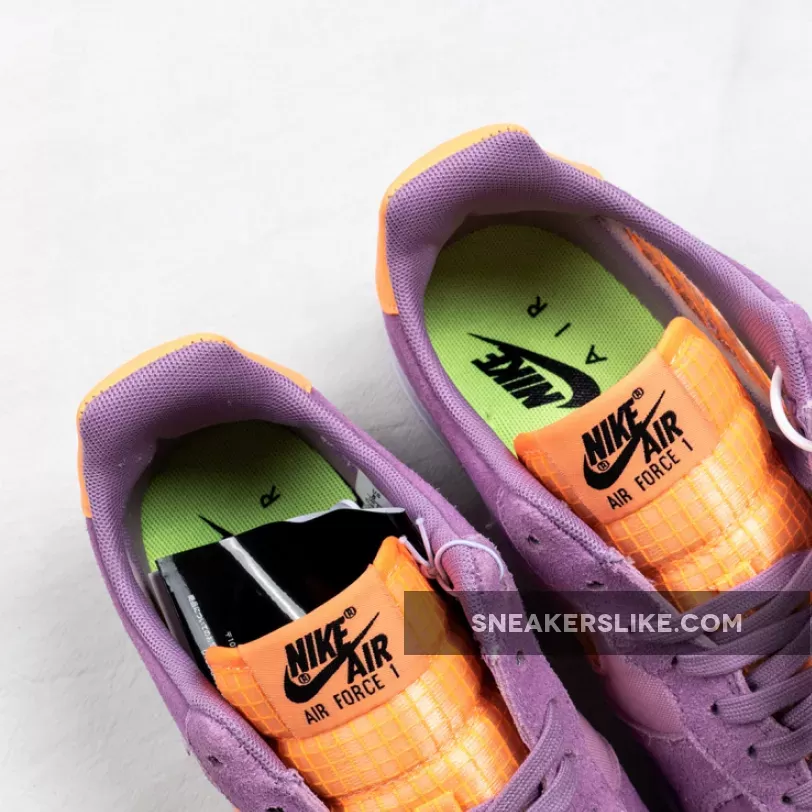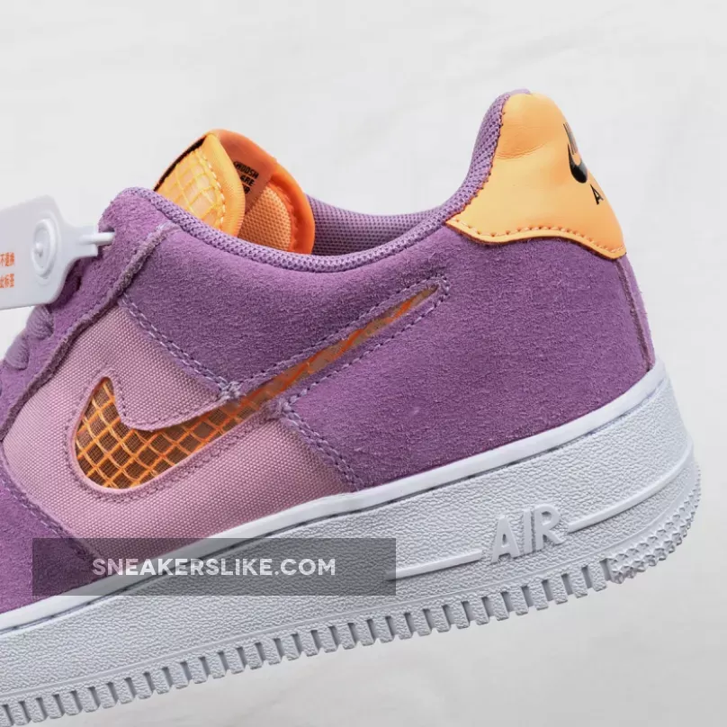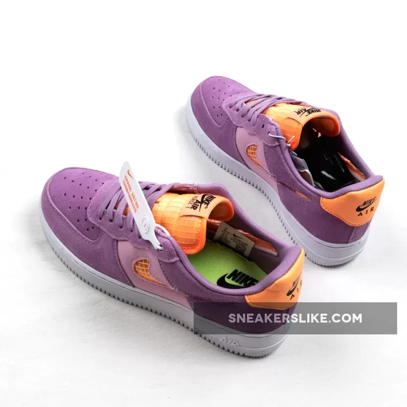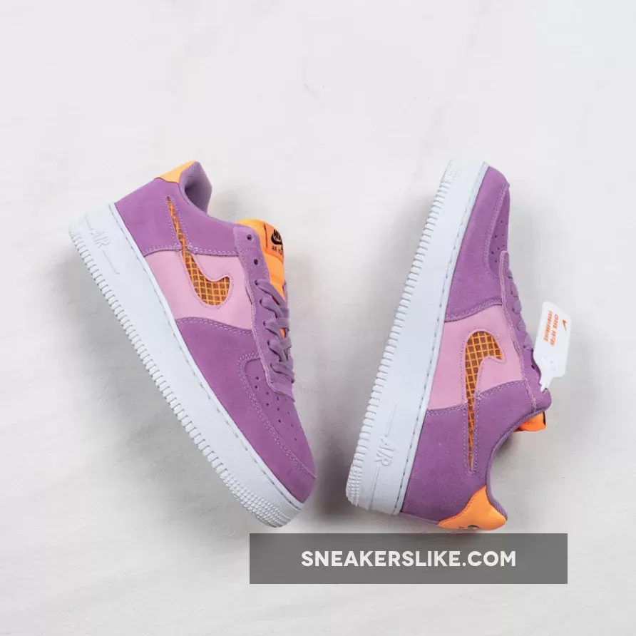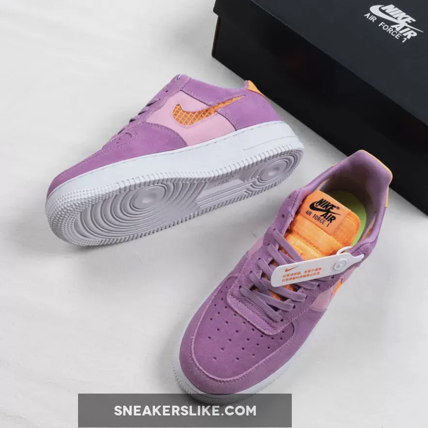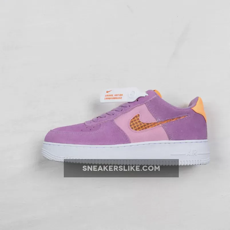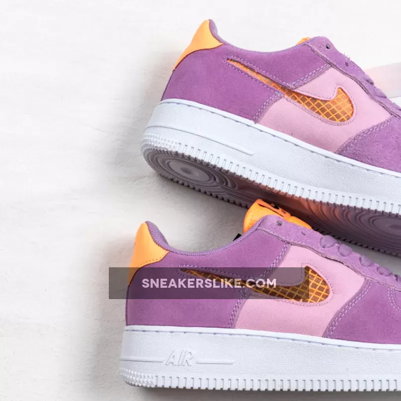 Dressed in a Violet Star, Orange Pulse, Light Arctic Pink, Black, and Ghost Green color scheme. This Nike Air Force 1 comes constructed with mesh panels, suede overlays, and leather heels.