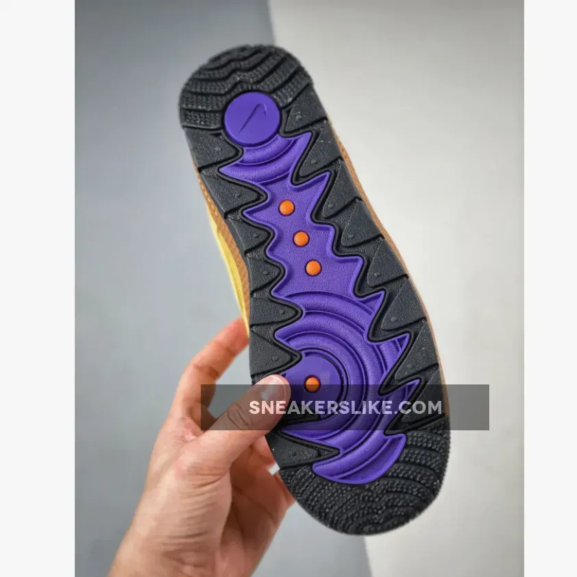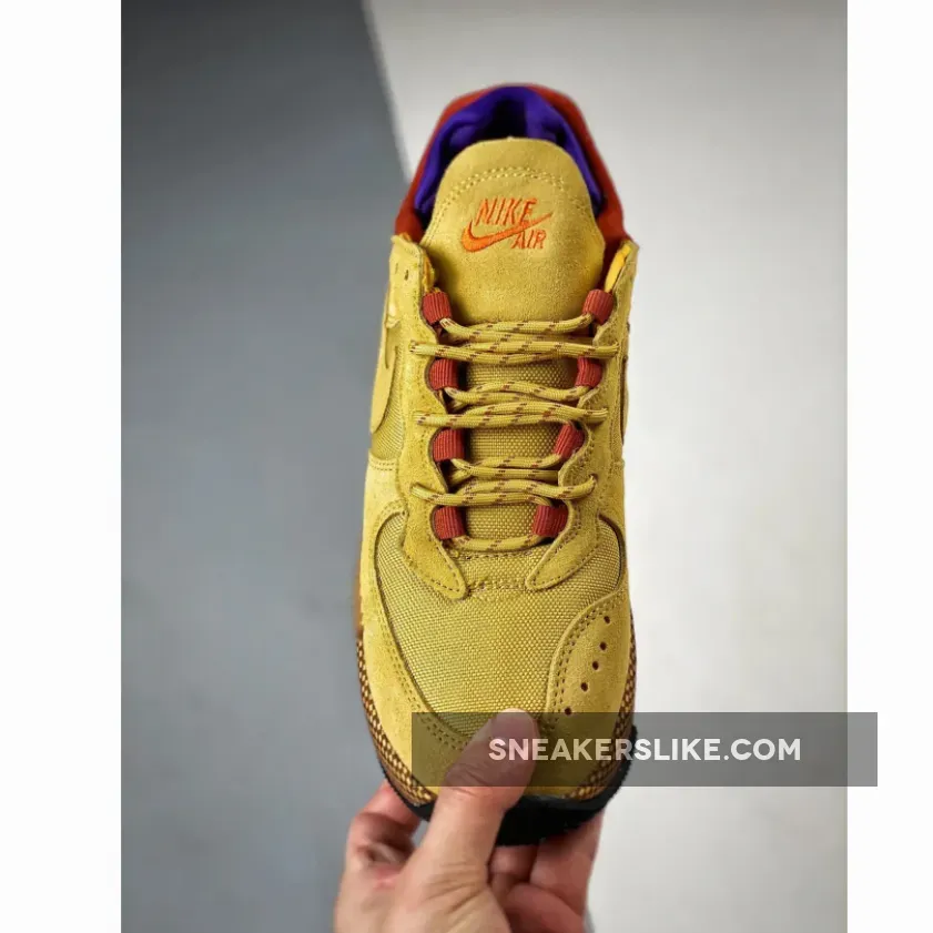 The Nike Air Force 1 Wild begins with a ballistic mesh base along with durable nubuck noted on the overlays. Additional standout details include pull tabs on the tongues, an added inner bootie for a snug fit, perforations and exposed stitching on the medial and lateral forefoot, a textile-wrapped midsole, and a trail-ready rubber outsole for optimum traction. This pair takes on a full Wheat Gold upper along with purple noted on the inner bootie and Rugged Orange hitting the heels ans tongue branding.