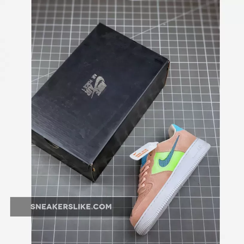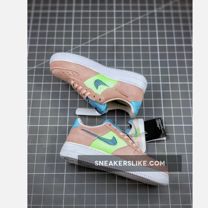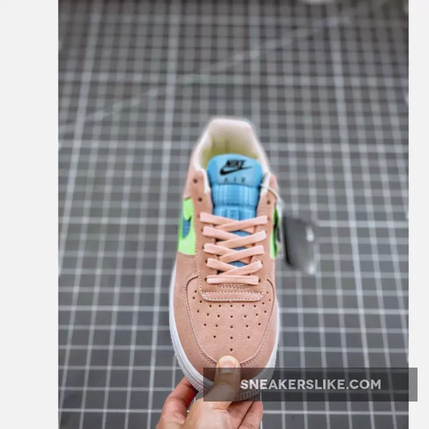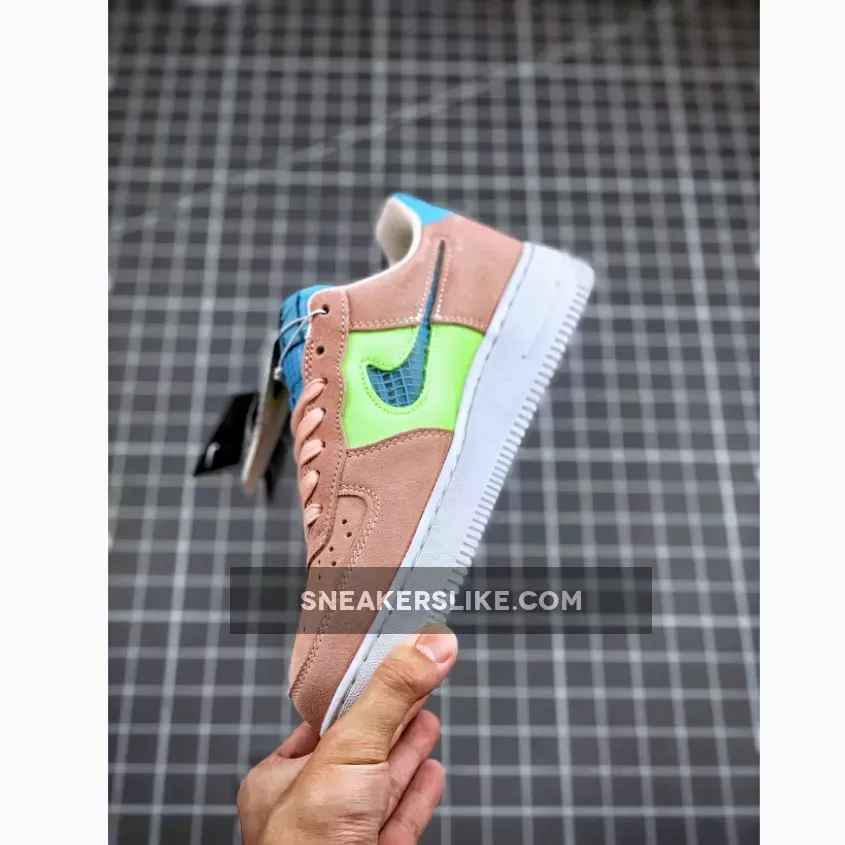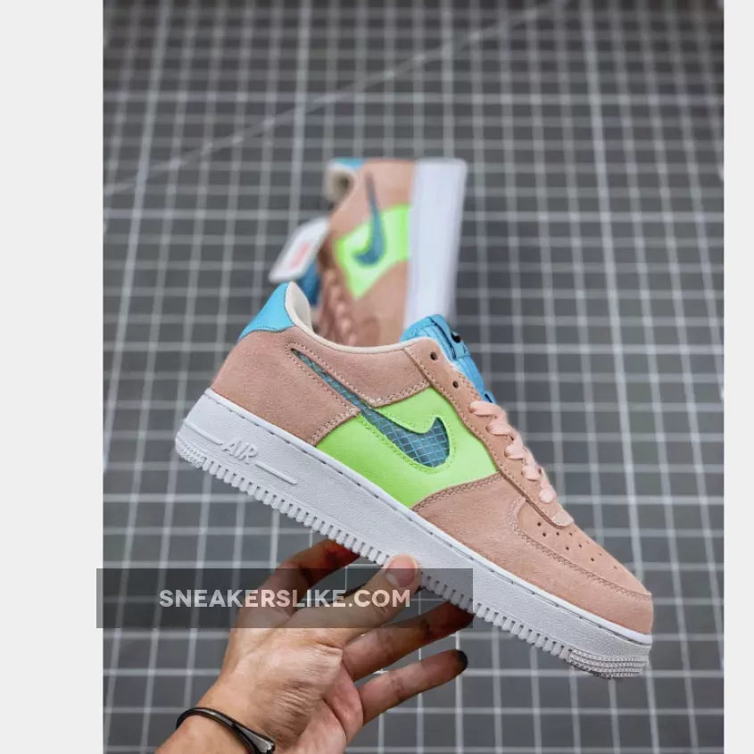 Dressed in a Washed Coral, Ghost Green, Black, and Oracle Aqua color blocking. This Nike Air Force 1 Low features a Coral suede base with Volt mesh on the sides highlighted with Blue detailing on the tongues, cut out translucent Swooshes, and heel. Finishing off the design is a clean White rubber AF1 sole.