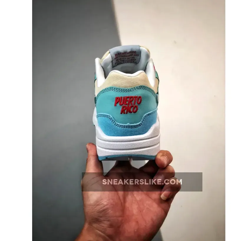 Red accents comprise the top lace loop and the co-branded Nike and Puerto Rico heel panels. Metallic silver lace dubraes spell out Puerto Rico. The tongue features an ice cream wearing a mismatched Air Max 1 in blue and red to match this colourway.