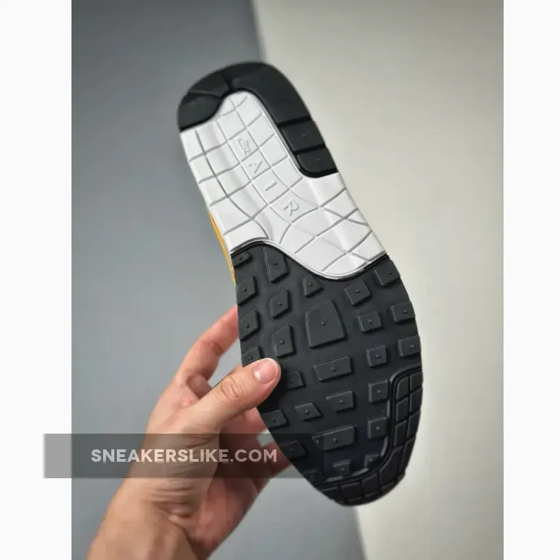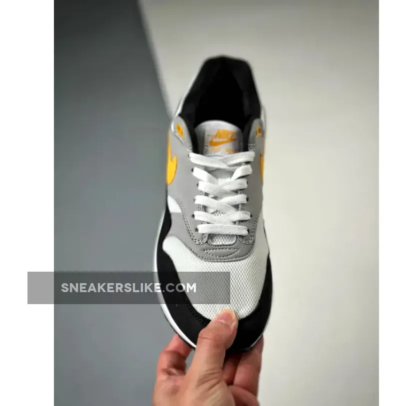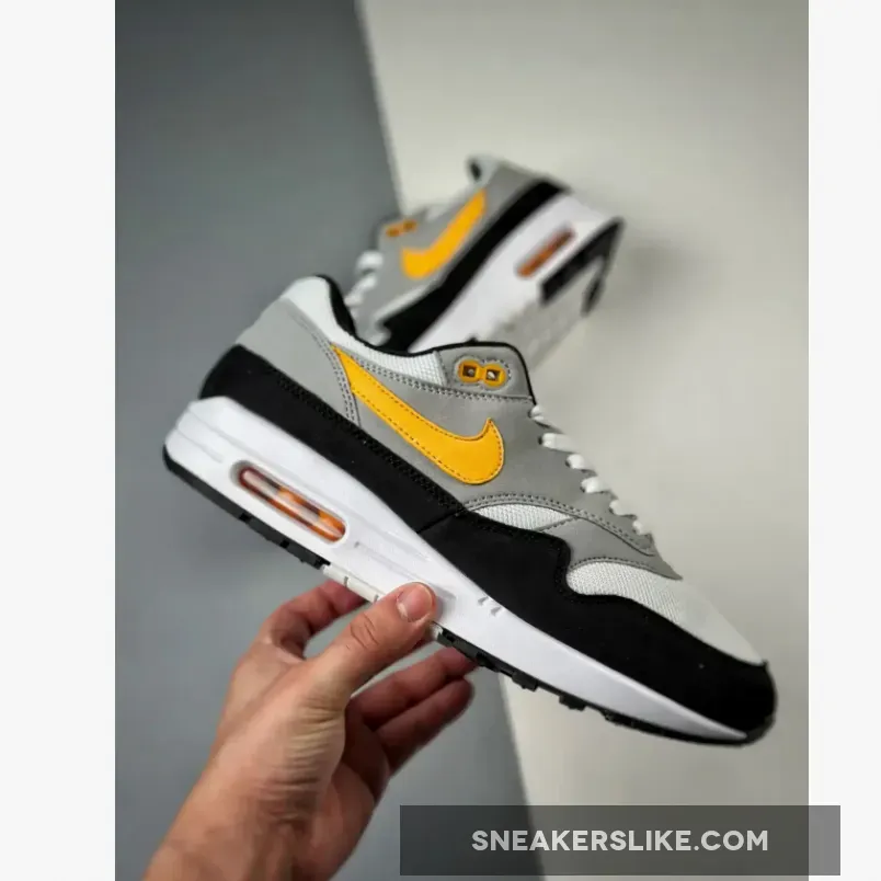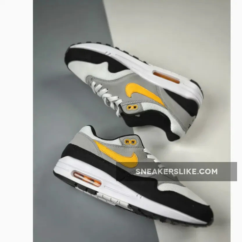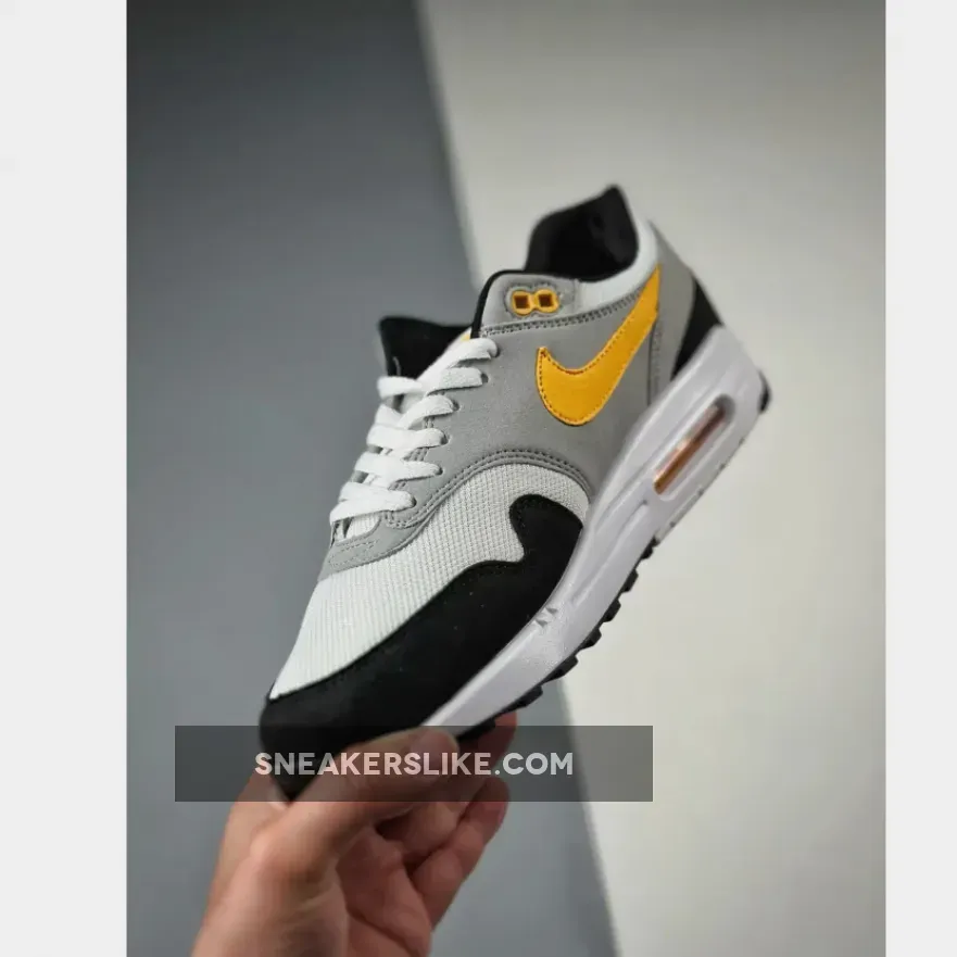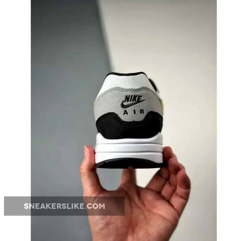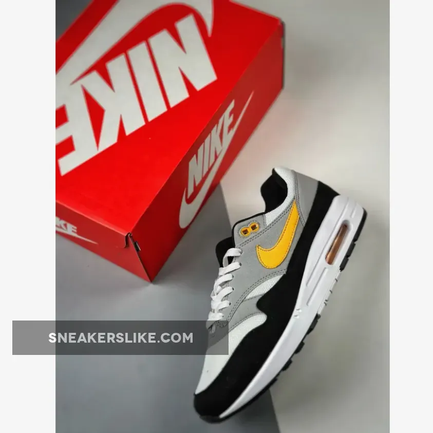 The Nike Air Max 1 showcases a White, University Gold, and Black color palette. Its construction combines breathable mesh and durable suede materials. The base is a crisp White, adorned with overlays in a soothing Neutral Grey shade. The heels are embroidered with the iconic Nike logo.