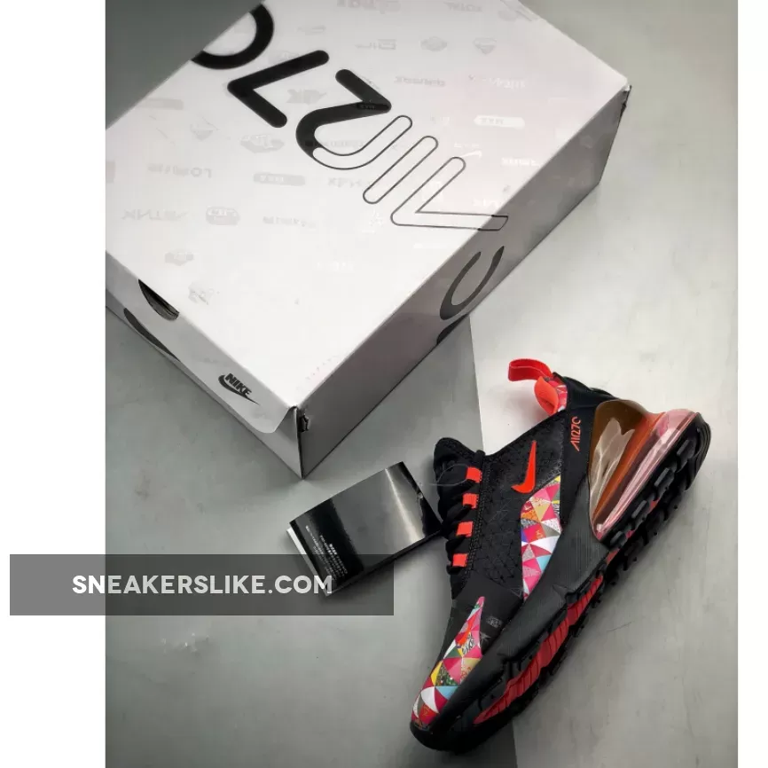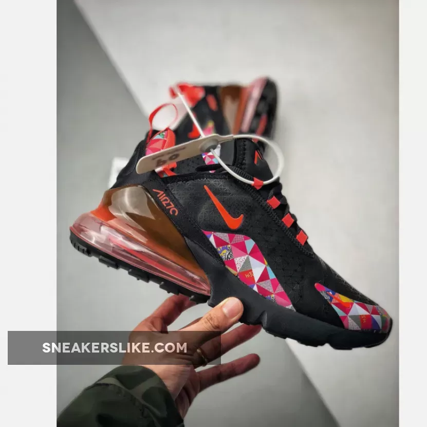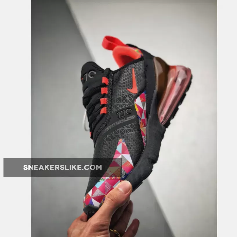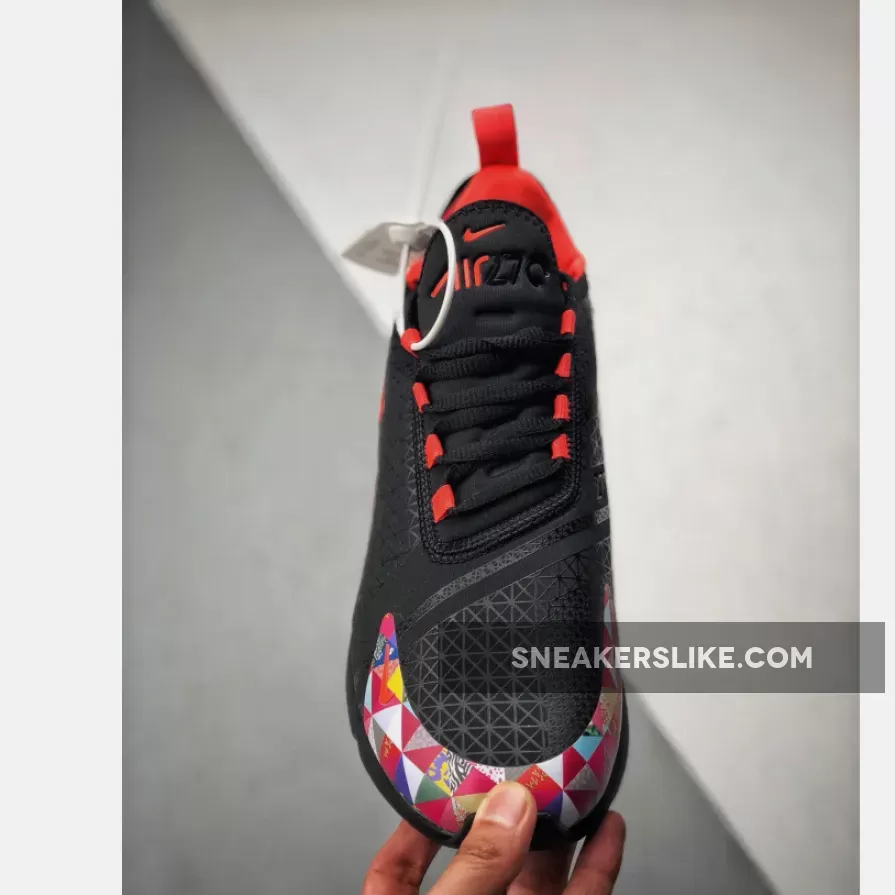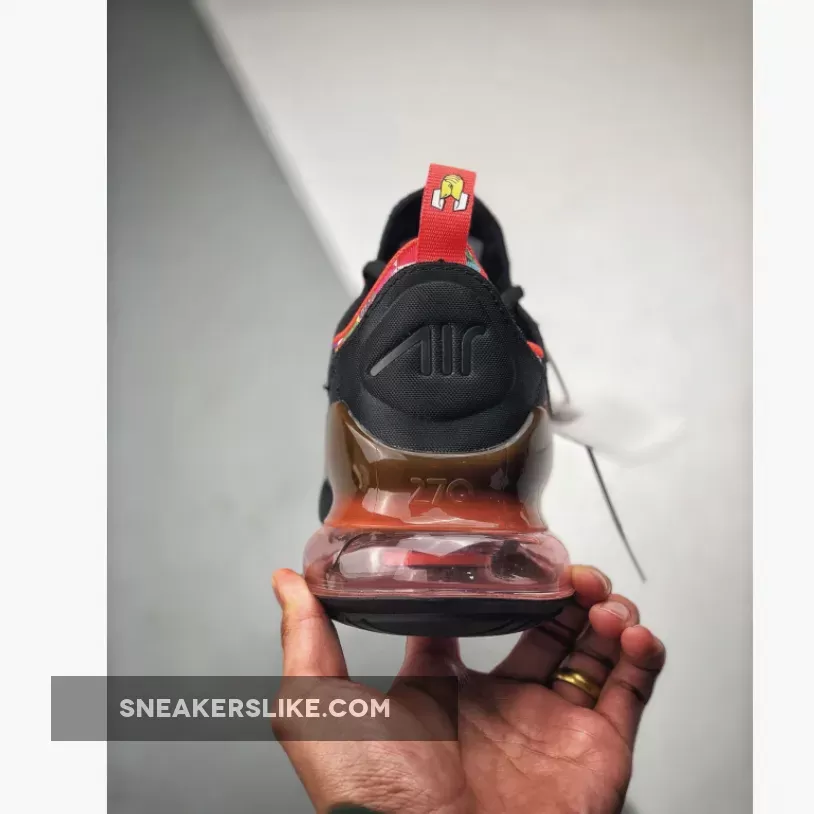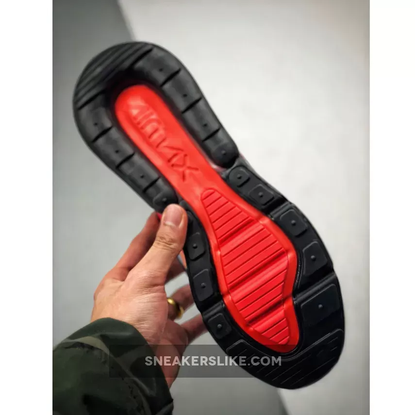 Dressed in a Black and University Red color scheme. This Nike Air Max 270 features a Black upper paired with Red accents on the Swoosh logos, lace loops, heel tab – that displays praying hands, and Max Air heel unit.
