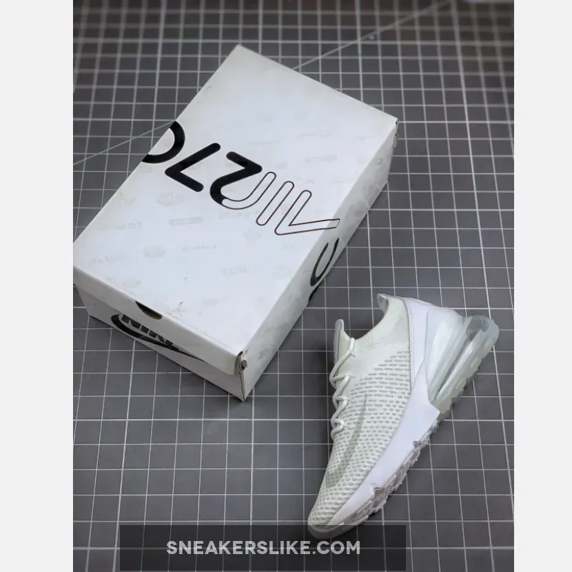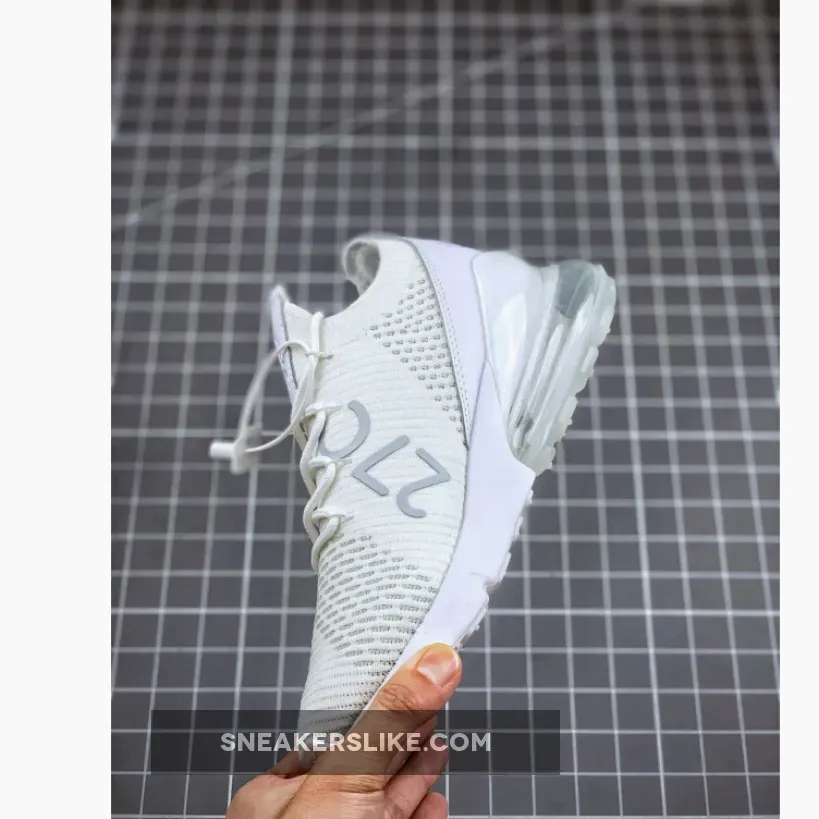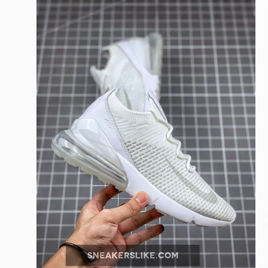 This Nike Air Max 270 features an all-White Flyknit upper that comes constructed with a sock-like collar and leather heels. Adding a bit of contrast are Light Grey tones on the Swoosh logo and “AIR” branding.