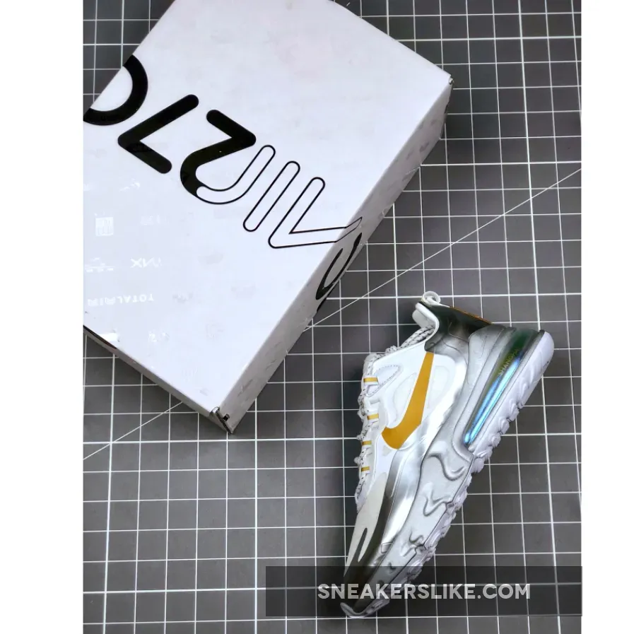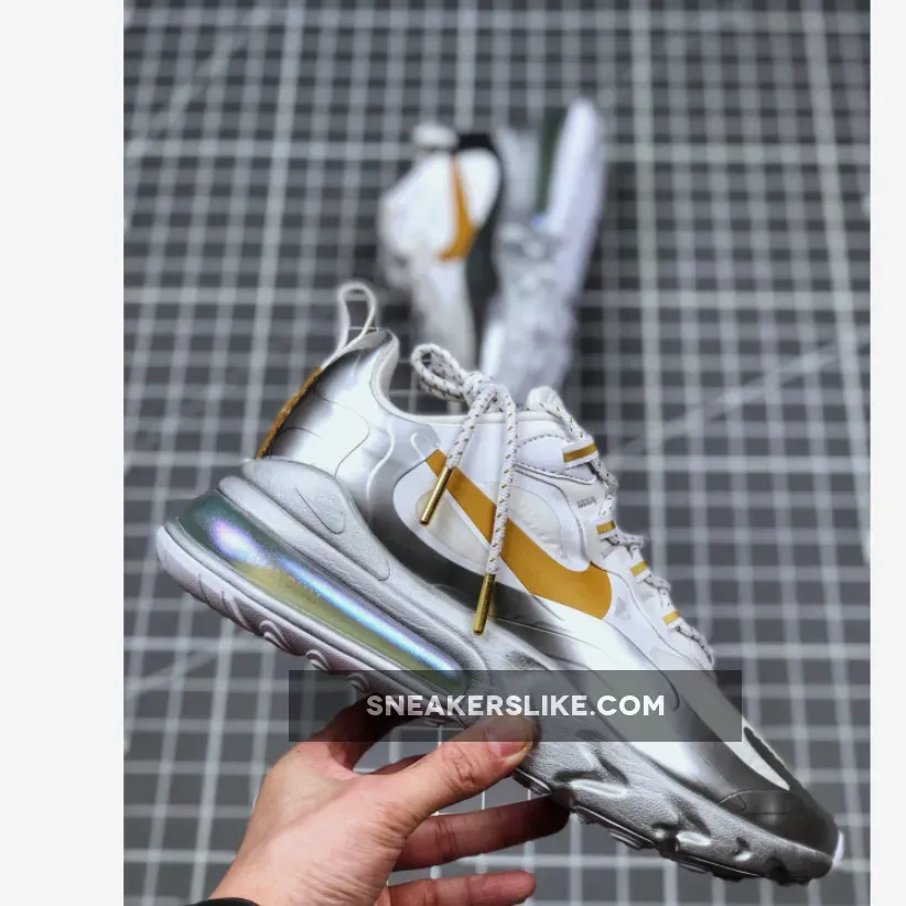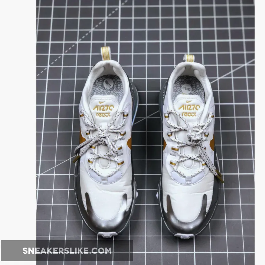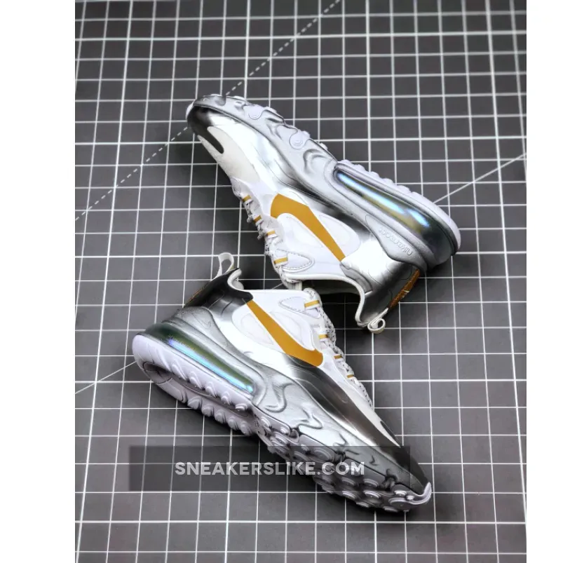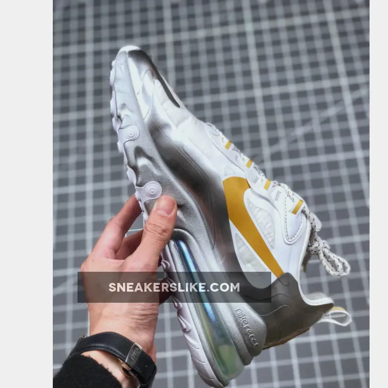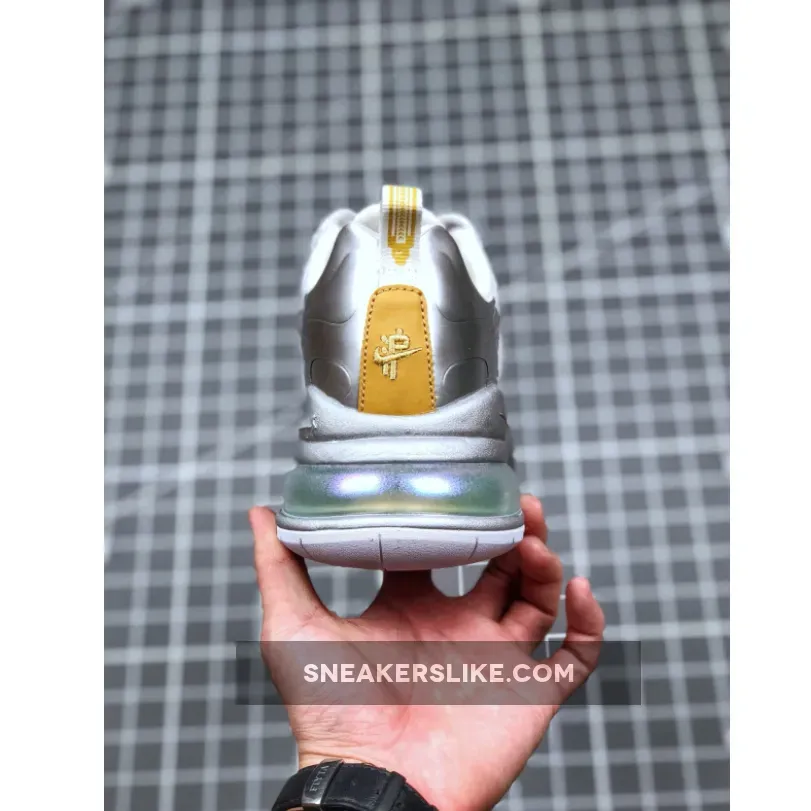 Utilizing both Gold and Silver, this Nike Air Max 270 React comes with imprints of ‘Shanghai’ and ‘City of Speed’ on both sides. Gold lands on the eyelets, Swoosh, tongue and pull tab while White lands on the upper. Finishing the look is Metallic Silver on the mudguard, toe and midsole.