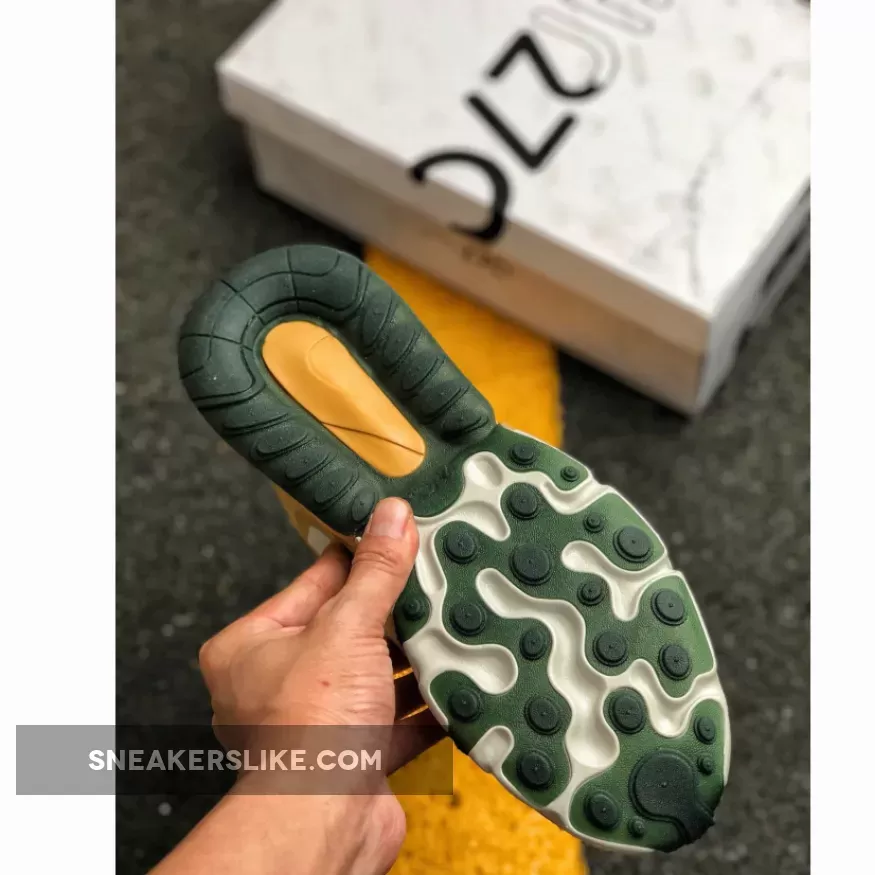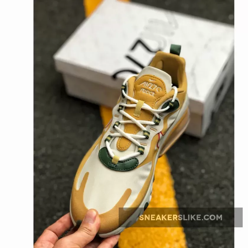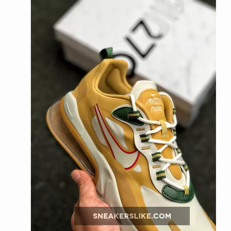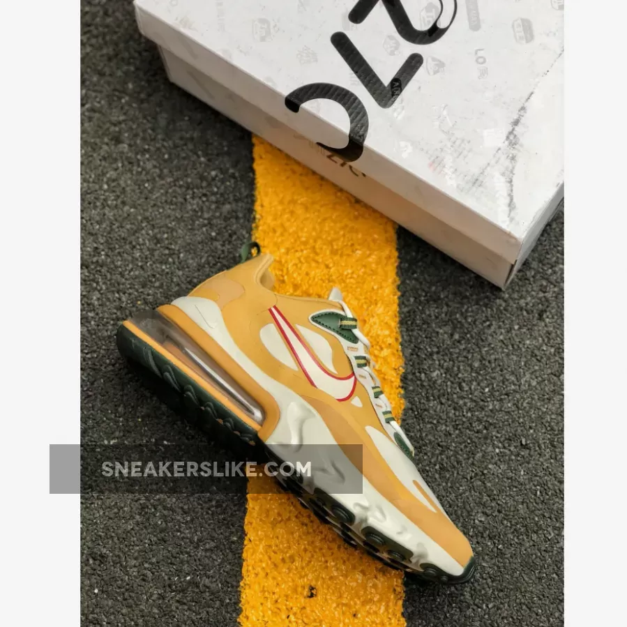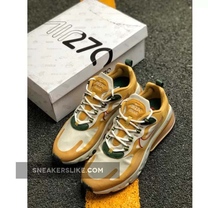 Painted in Gold, White, Red and Green colour combination is the brand new Air Max 270 React. This rendition of the sneaker is mirroring the transformation of leaves in the Fall time with the tones of Gold, Green and Red on the contemporary designs. The top of the sneaker features Synthetic material with suede overlays. Moreover, the sneaker includes Neoprene-mesh tongue with lace-up closure.
