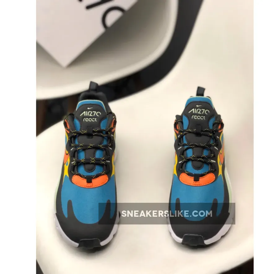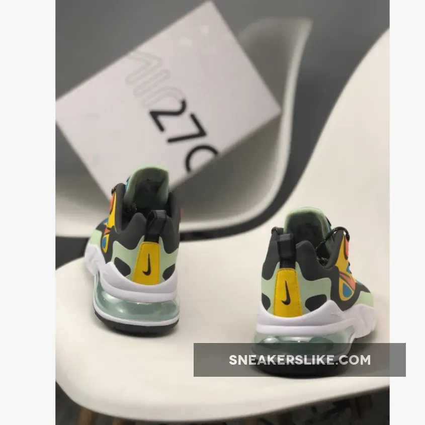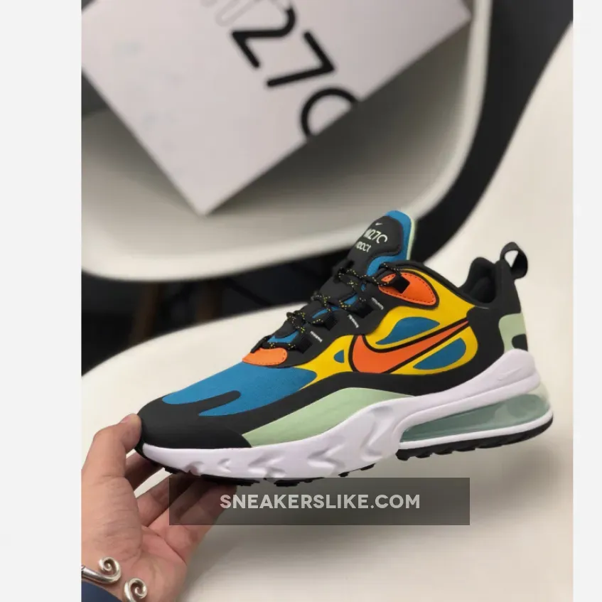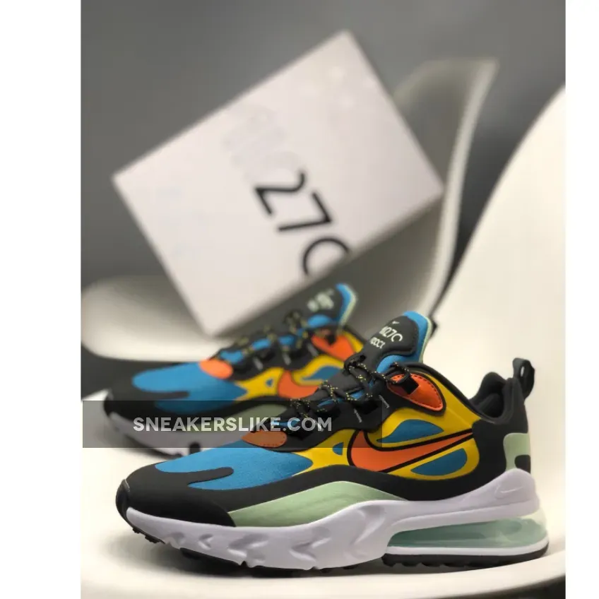 Dressed in a Green Abyss, Black, Laser Orange, and Starfish color scheme. This Nike Air Max 270 React features a Blue base with tones of Orange and Mint Green contrasting accents.