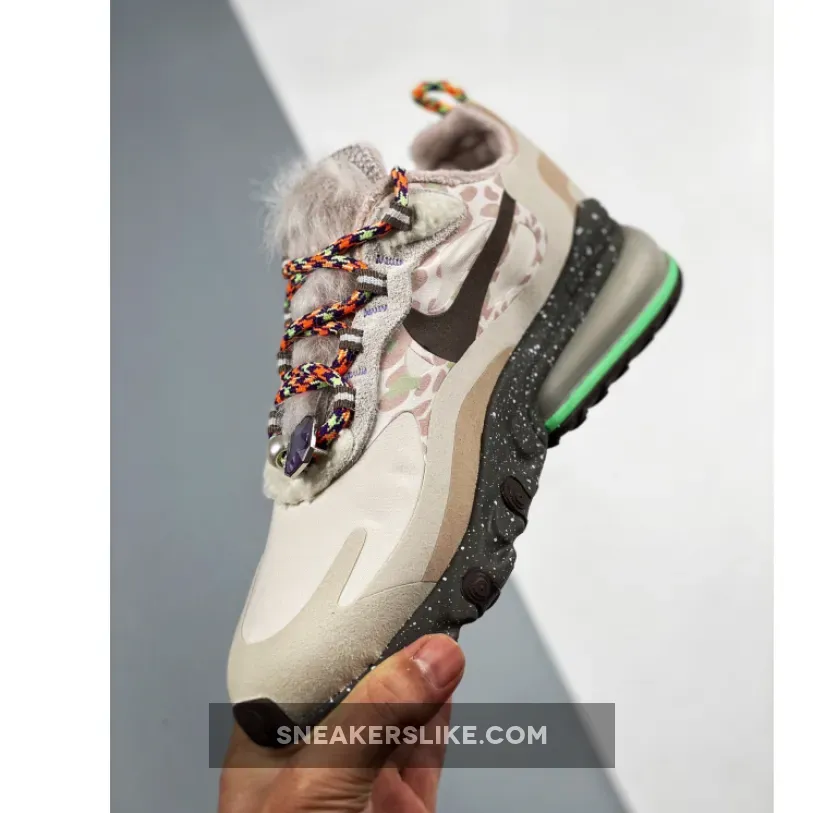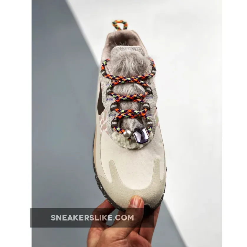 The most outstanding of the offering’s features would undoubtedly be the attached fur that outfits a large section of the instep. Its hairs are wrapped over top by colorful rope laces whose topmost loop is accessorized with a green carabiner and a complementing paracord keychain. What’s more, the vamp brings along the brand’s penchant for jewelry as gems of emerald, orange, and purple shades are used as if dubraes. A light tan then lies underneath in two fashions: one a more flat, unblemished finish and the other an eccentric mosaic of animal print. Speckled soles then draw just below, volt accents the model’s matted Air unit, and terry cloth warms from within.