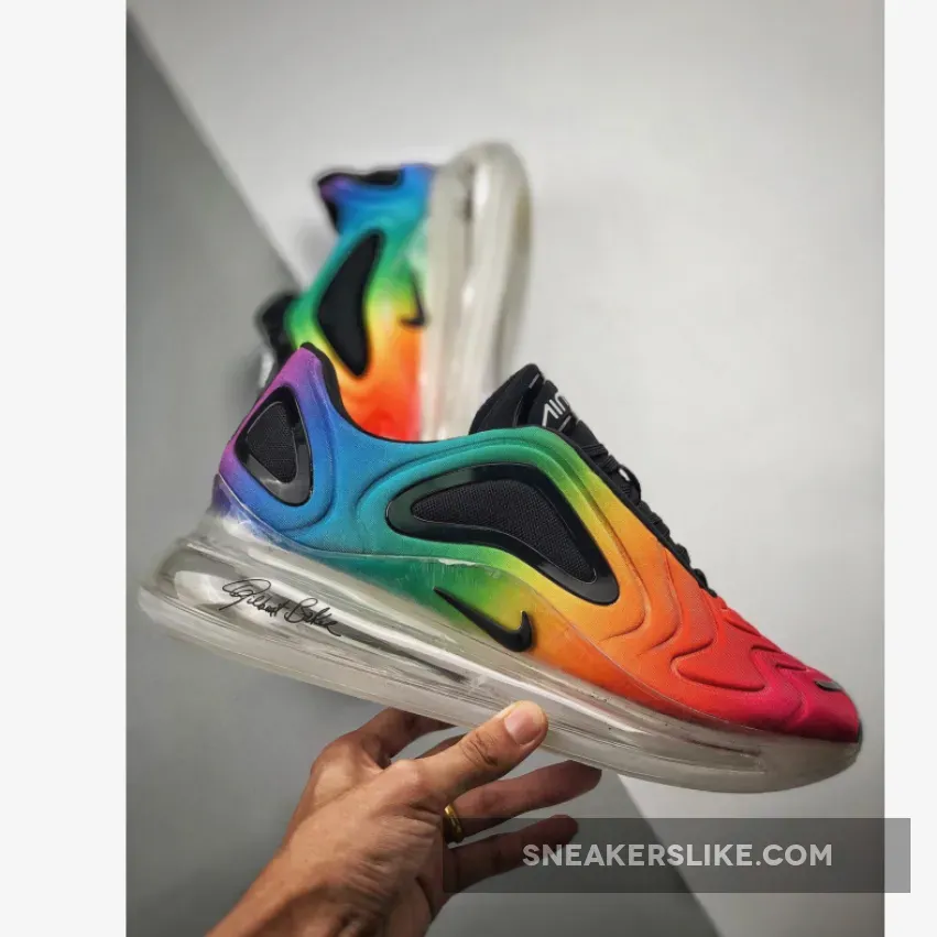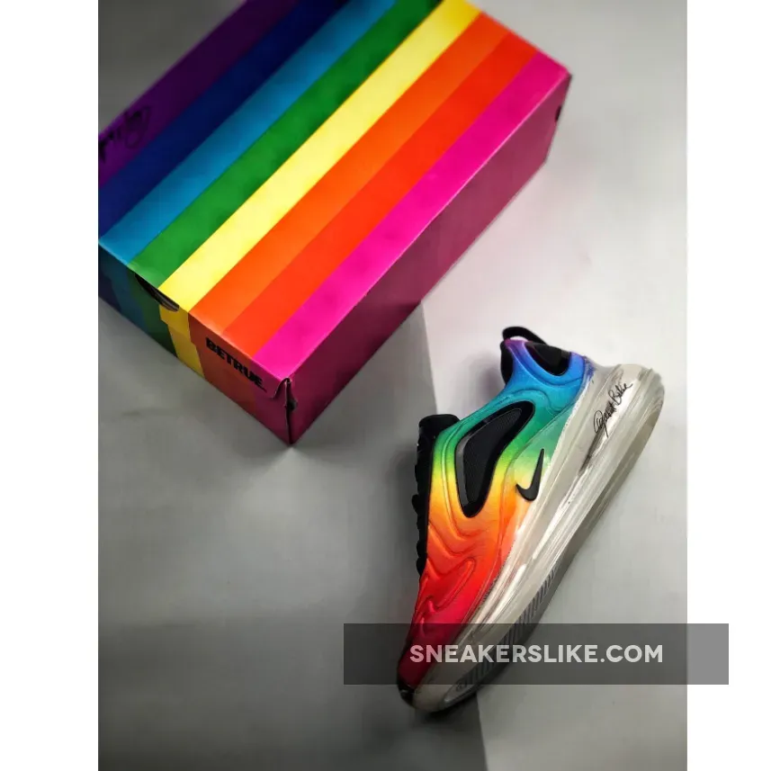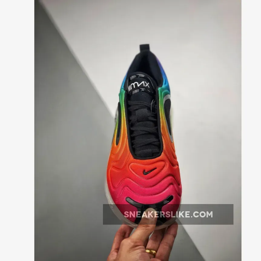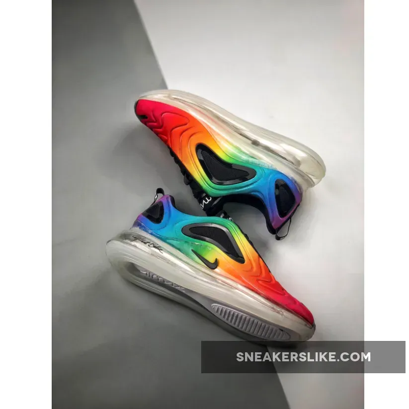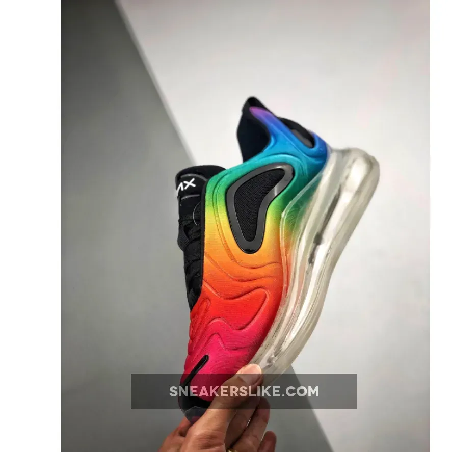 This offering of the Air Max 720 features a full rainbow gradient upper paired with Black detailing on the plastic overlays, trimming, tongues, and laces.