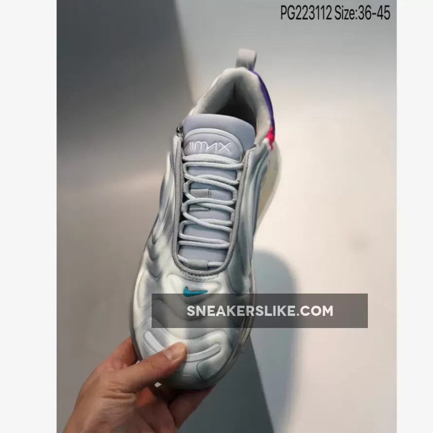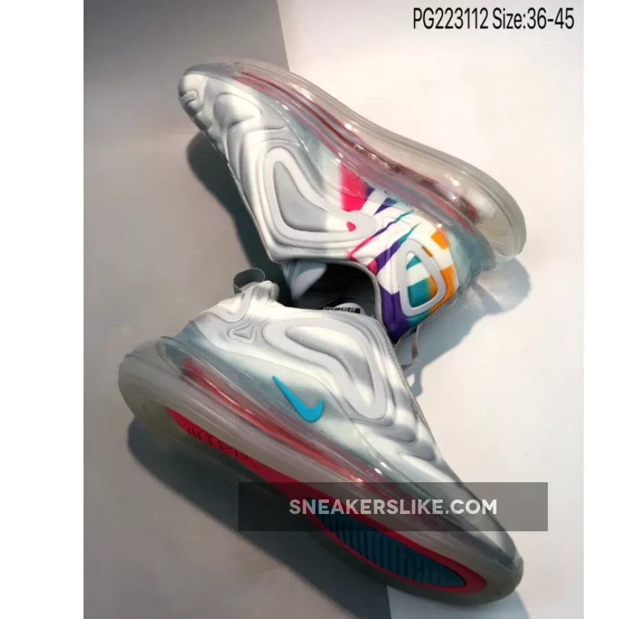 The Air Max 720, the brand’s prized new introduction into the lifestyle footwear market in 2019, is on a tear as an attractive new edition has revealed itself with a silver upper, colorful streaks on the medial side, and some retro-style detailing in the “Sportswear” tag by the tongue and the vintage Nike script hangtag. There’s even a huge AIR featured above the rainbow detail, while a bright crimson red Air unit can be seen through the translucent Air bag.