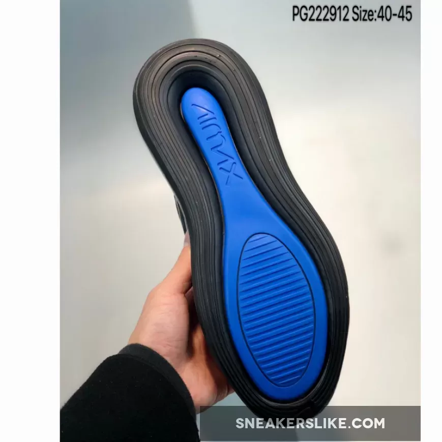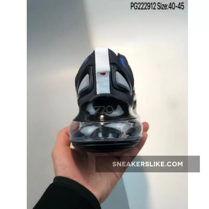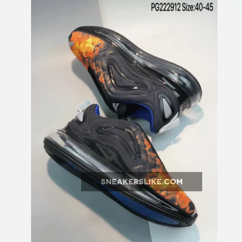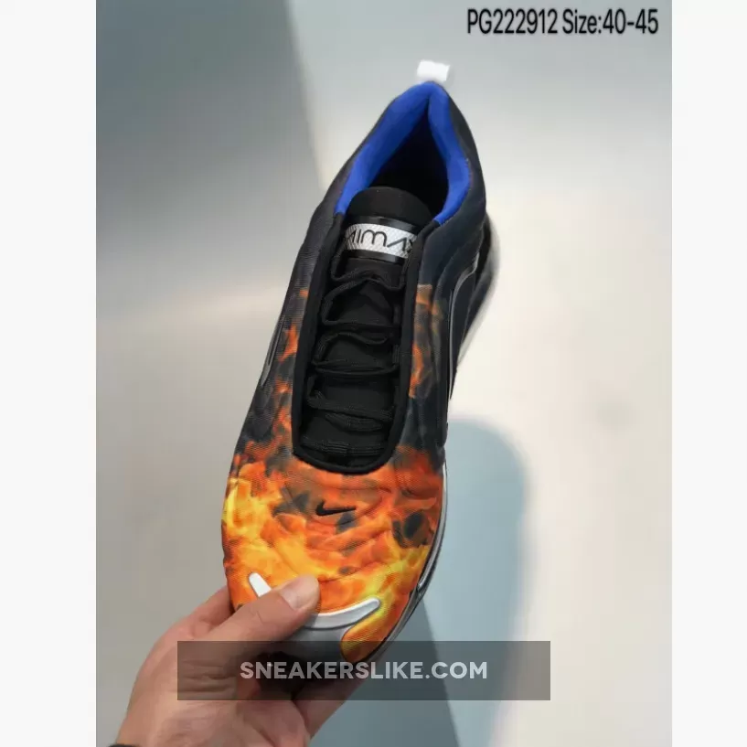 This “Gel” edition of the Nike Air Max 720 is highlighted with a flame graphic covering the toe area and up the tongue. Finishing off the design are dashes on the laces with Blue inner lining.