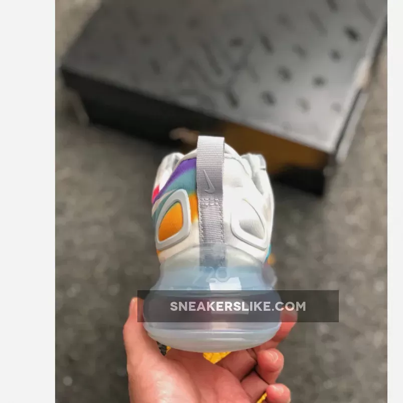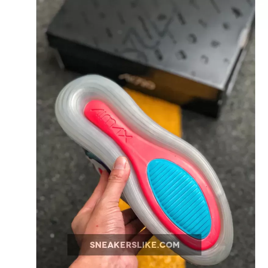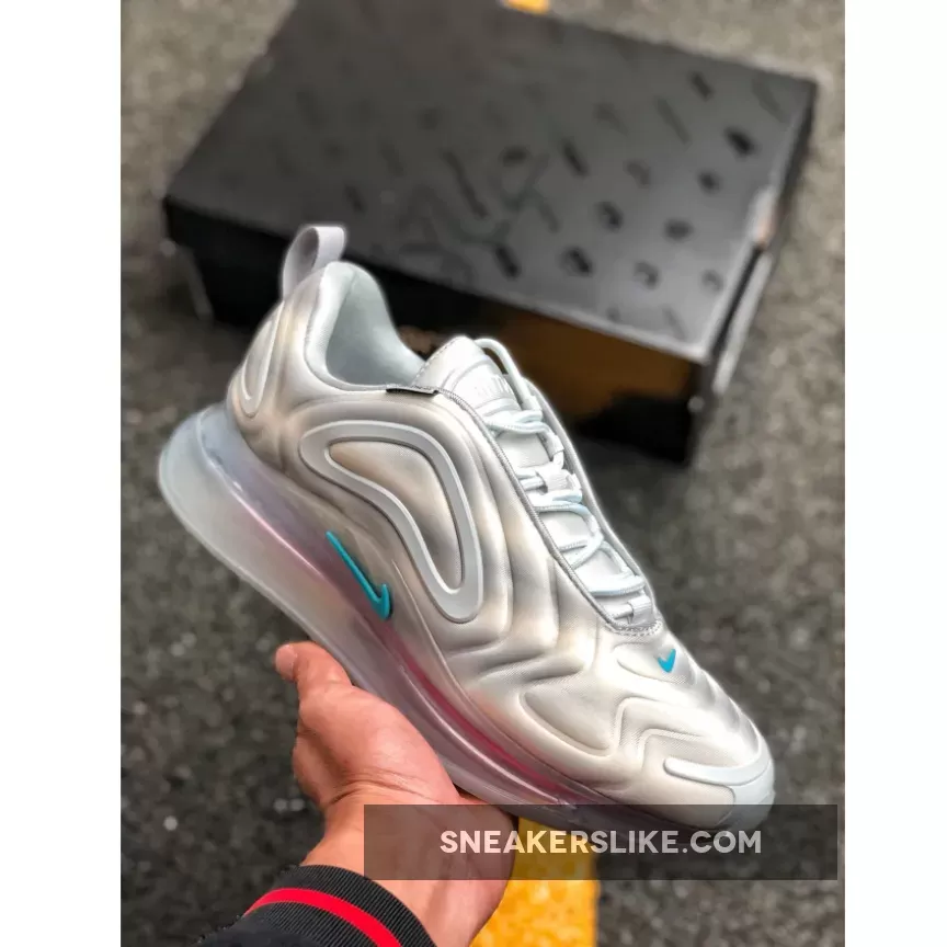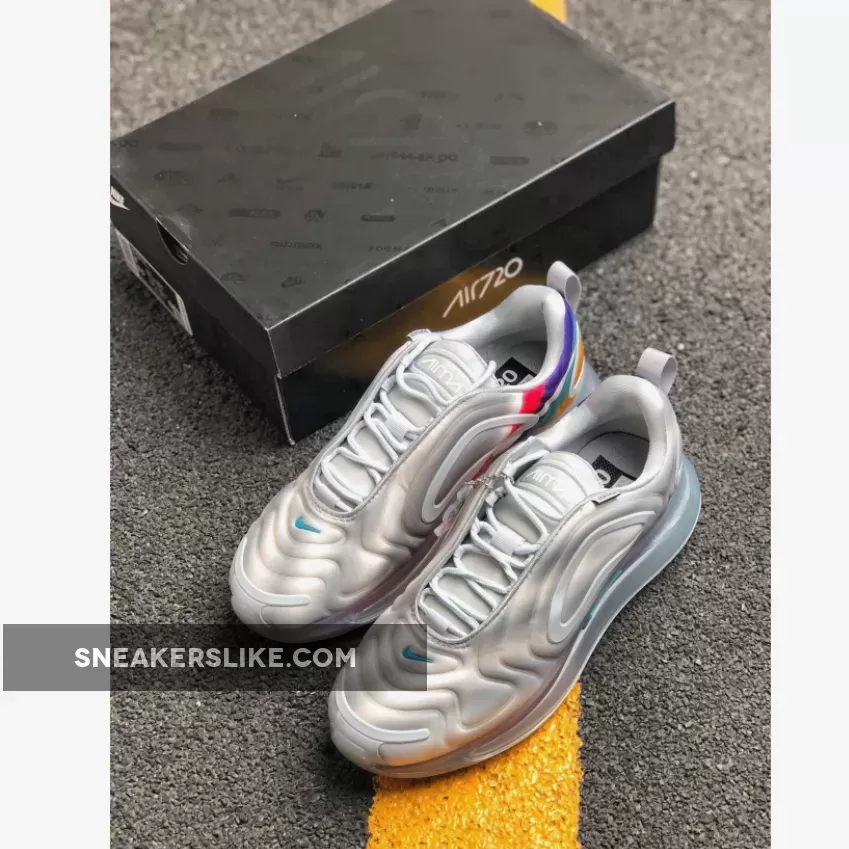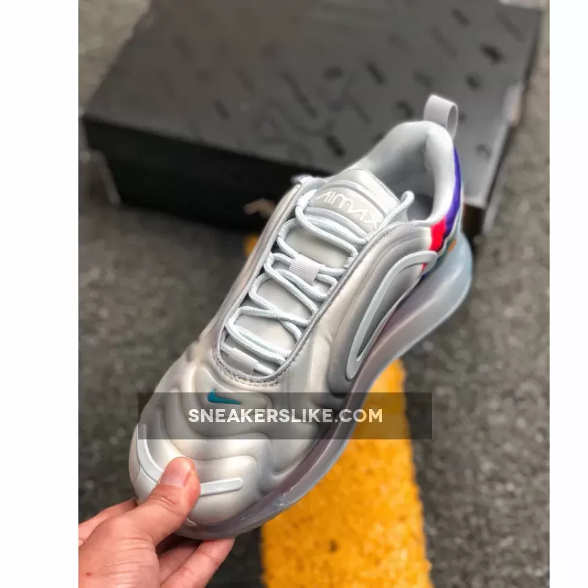 Dressed in a Wolf Grey, Red Orbit, White, and Teal Nebula color scheme. This Nike Air Max 720 features a Light Grey upper with a Light Blue Swoosh and Red detailing on the Air unit. Highlighting the shoe is its airbrushed stripes on the medial side.