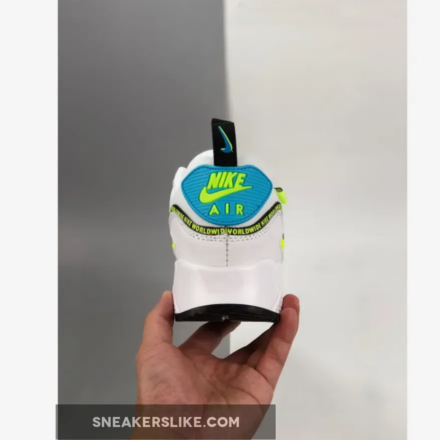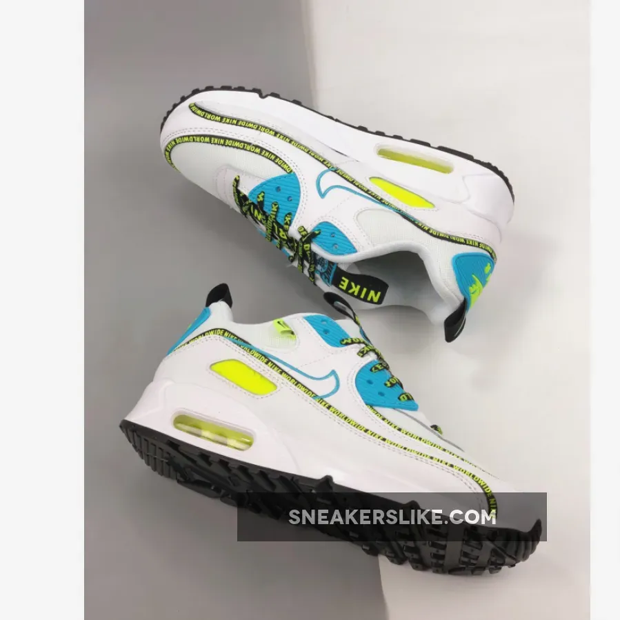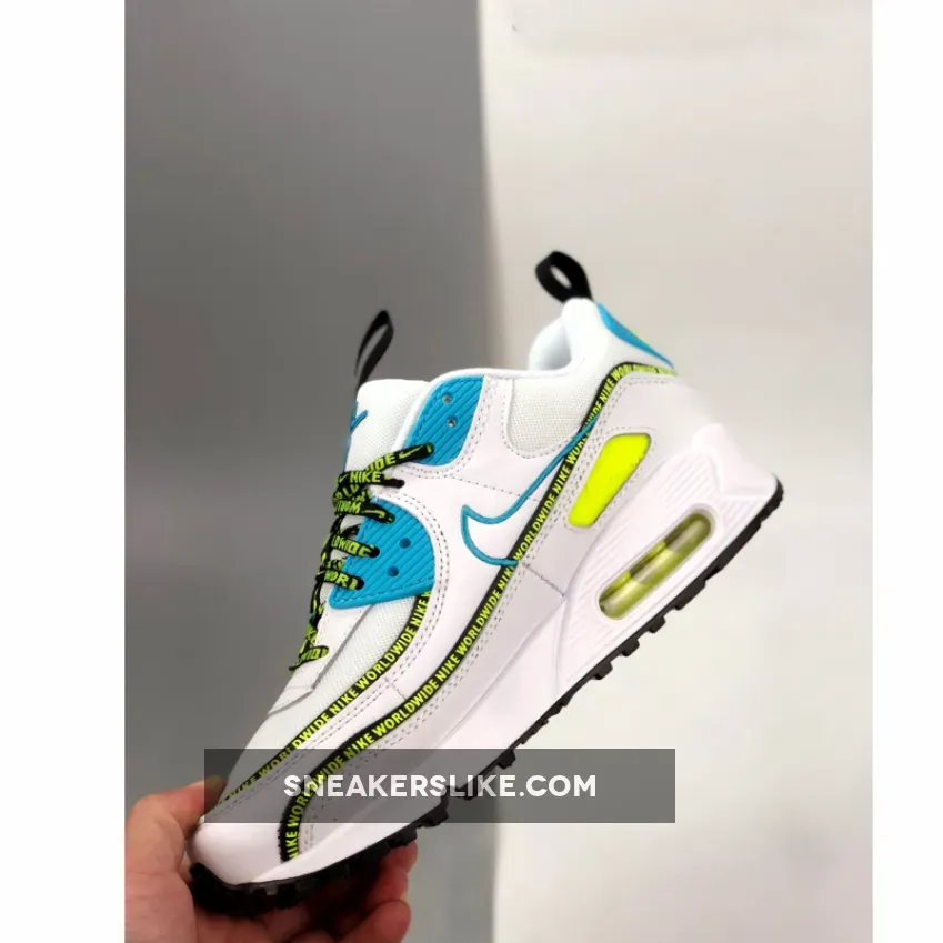Dressed in a White, Blue Fury, and Black color scheme. This Nike Air Max 90 features a White leather and mesh upper highlighted with Blue and Volt contrasting accents. The word “Nike Worldwide” is repeated along the taping, laces, and tongue pull tab with a Nike global logo on the tongues and lateral tag.