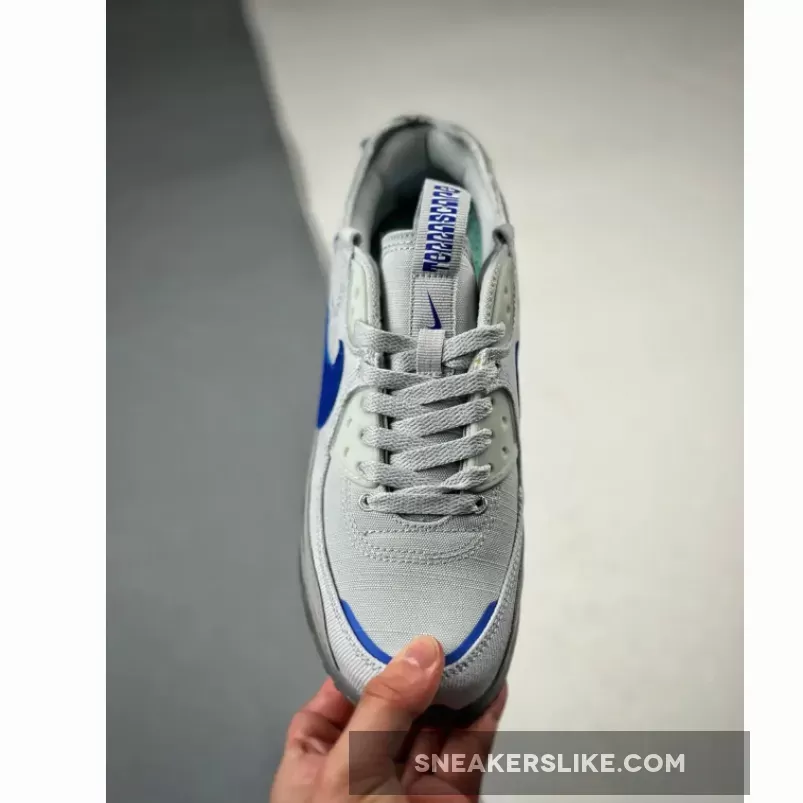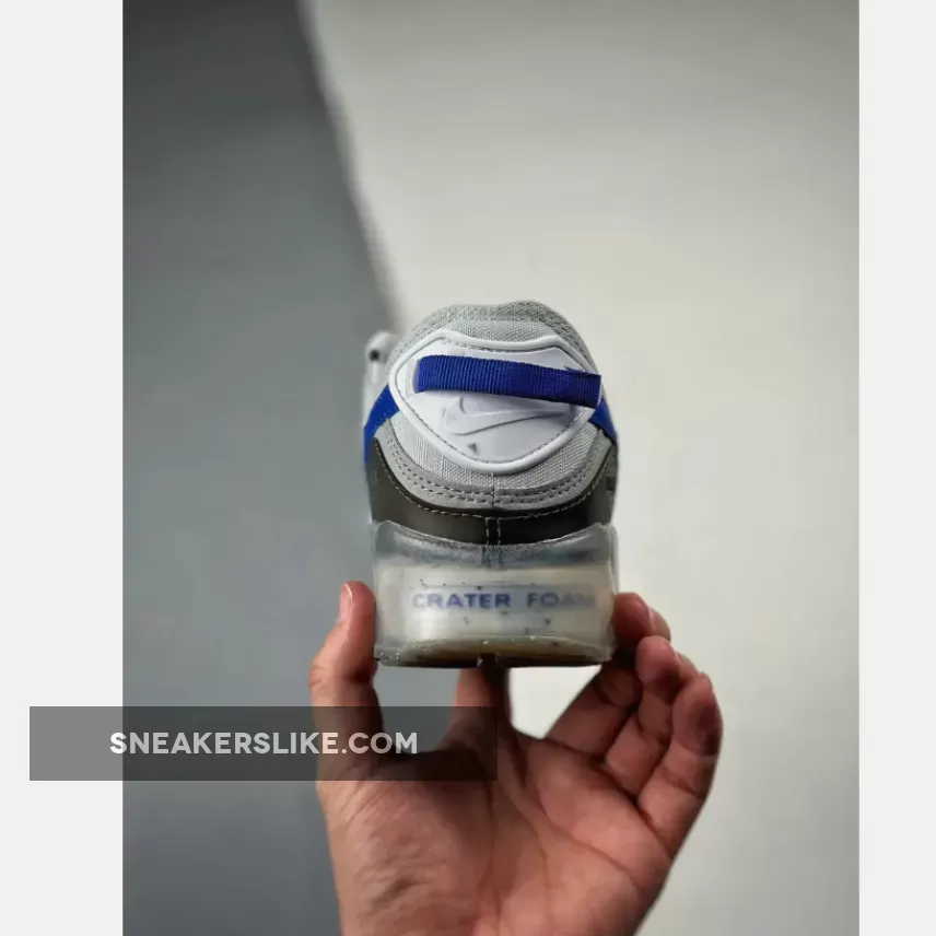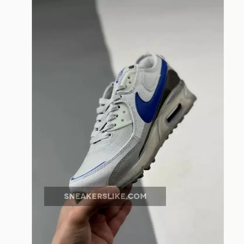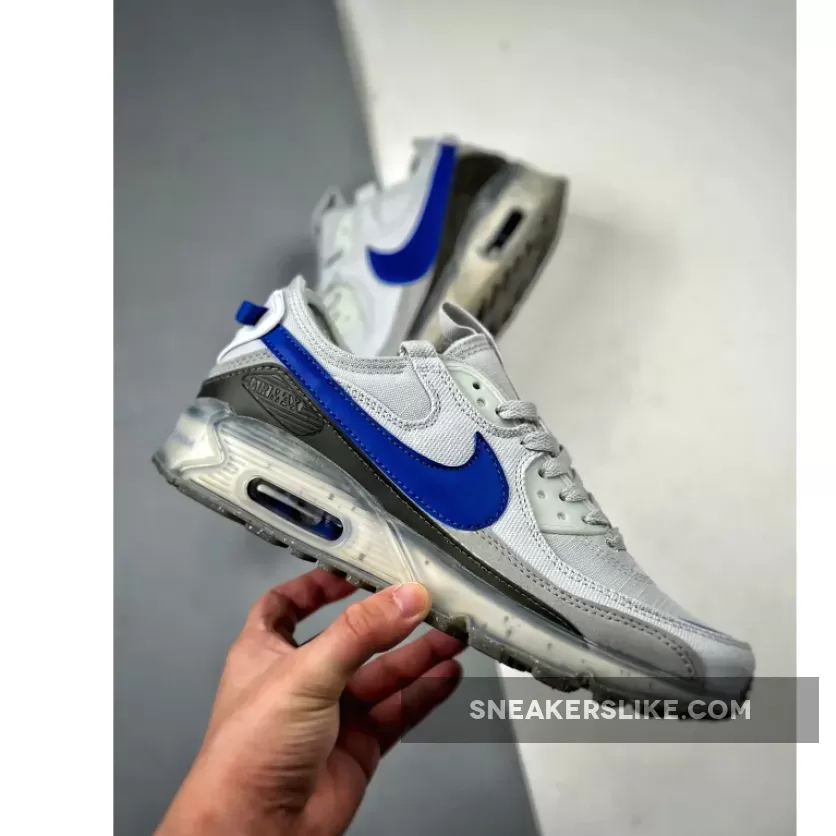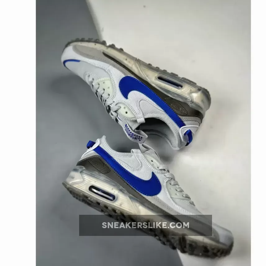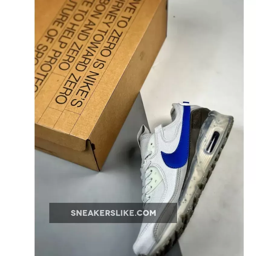 Nike’s Air Max 90 Terrascape Pure Platinum Hyper Royal looks to the future with its emphasis on recycled materials. The upper comes in panels of white canvas edged with royal-blue wrap-around Swooshes. Further hits of blue enter via the toe box and pull tabs which, essentially, are an extension of the Swooshes. The speckled heel overlays and outsoles provide visual hints at this pair’s eco-friendly ambition. Along similar lines, the translucent Crater Foam midsole—crafted with elements of Nike Grind Rubber which uses waste products like manufacturing scraps—furthers the sustainable theme. Meanwhile, the iconic Air unit shows through the medial outsole, ensuring perfect cushioning.