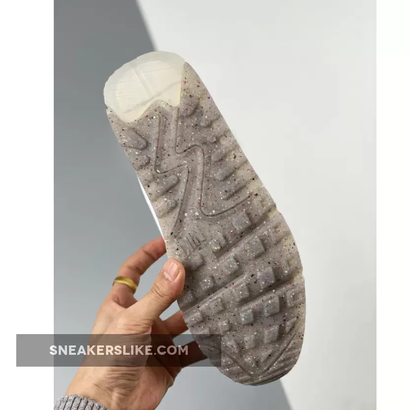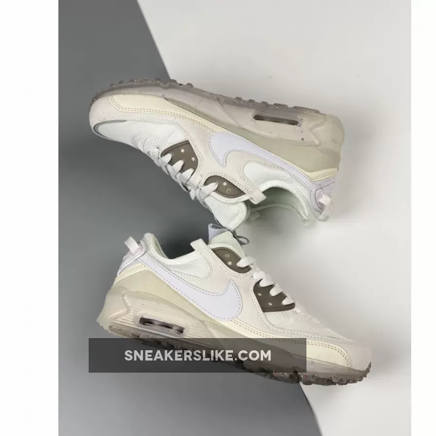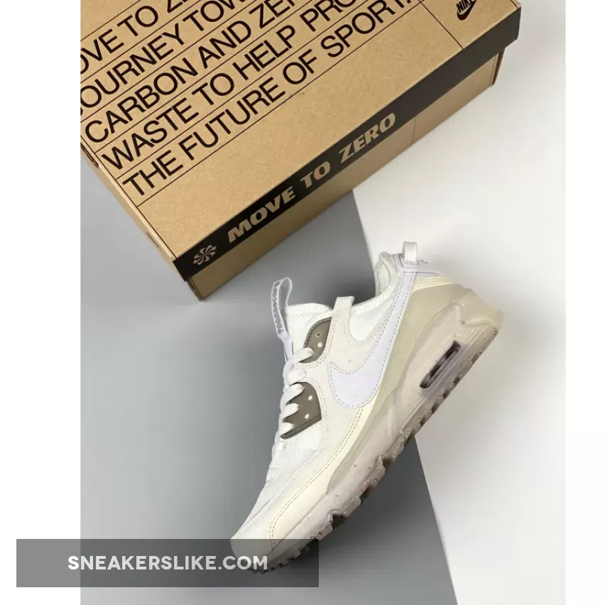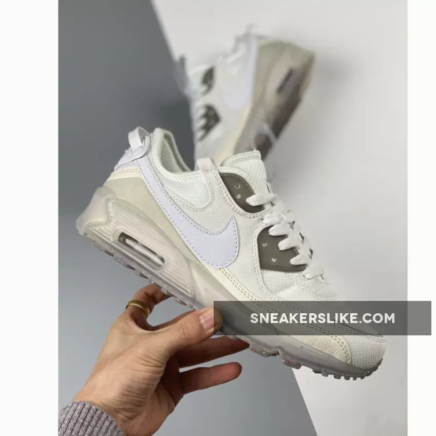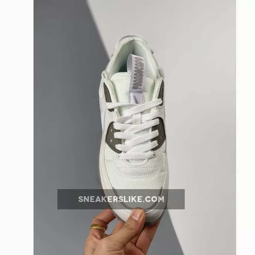 The sustainable Terrascape line of the Tinker Hatfield-designed Nike Air Max 90 has a fresh new release in cloud-like hues. Introducing the Nike Air Max 90 Terrascape White Grey. This Air Max 90’s base is white mesh, matching the laces and complemented by recycled material overlays in varying shades of white, including the signature profile Swooshes on the medial and lateral quarters. Nimbus cloud grey semi-translucent TPU eye stay accents and a lighter grey Air Max-stamped mudguard provide neutral contrasts. An icy translucent rubber casing reveals the shoe’s speckled Crater Foam midsoles.