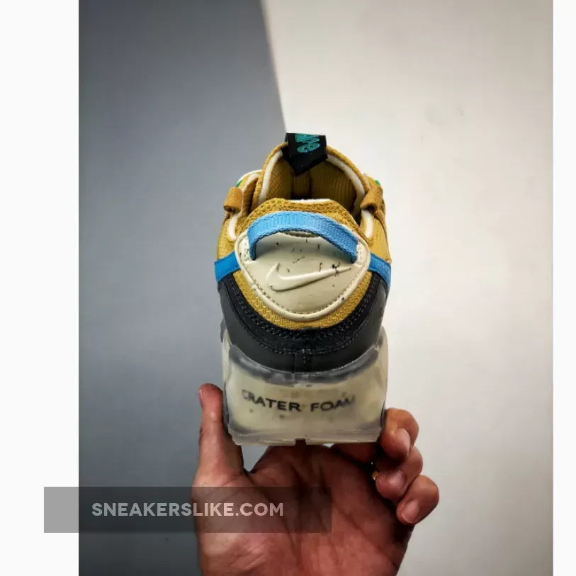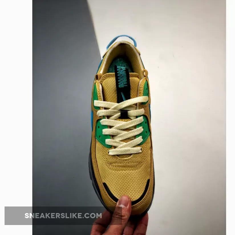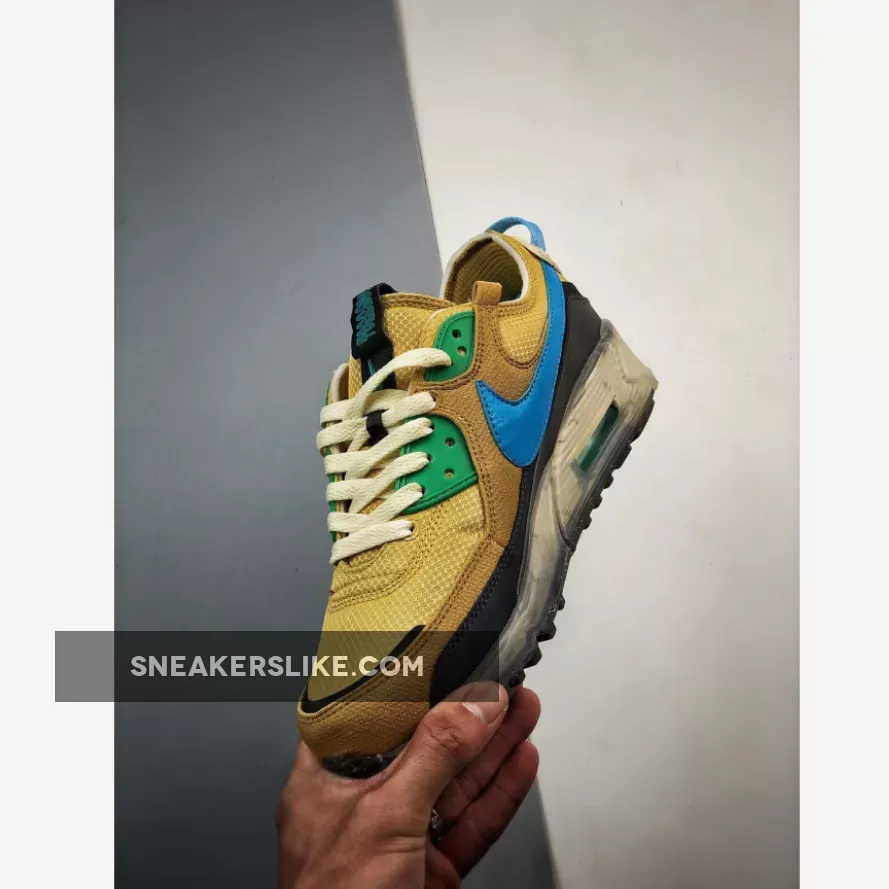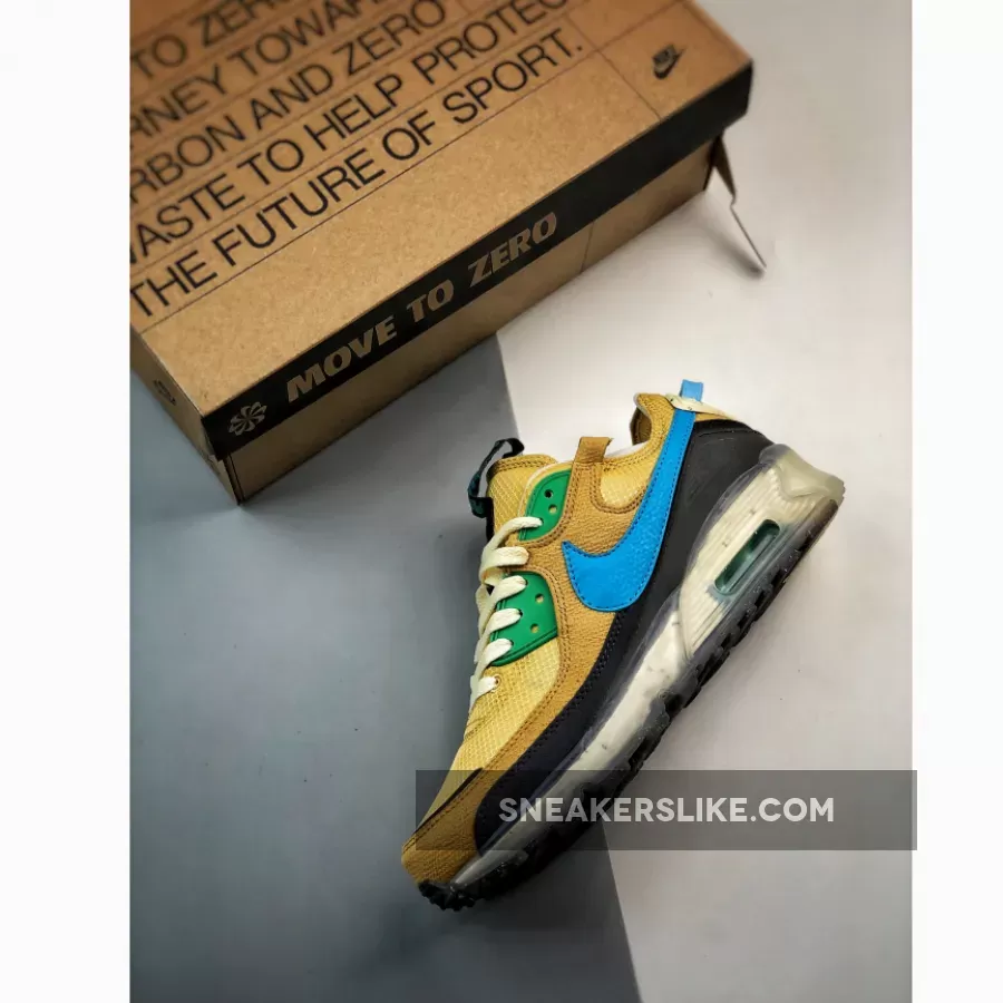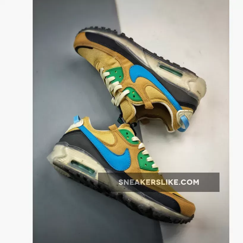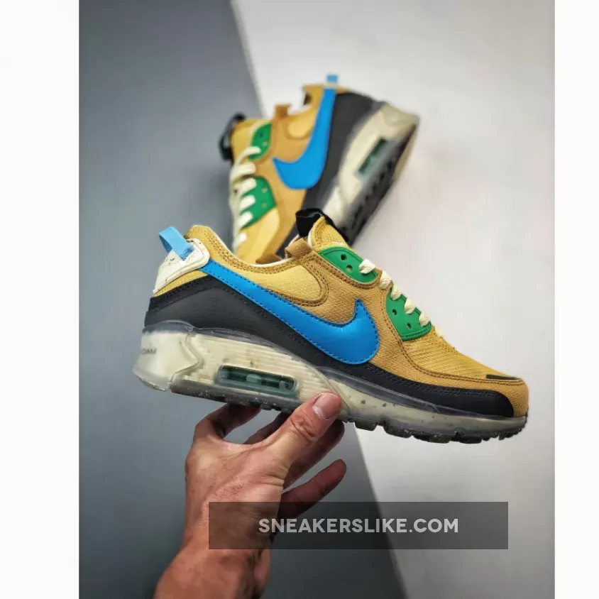 With its striking colourway and comfortable build, the Nike Air Max 90 Terrascape Wheat Gold Blue is easily a nice choice for anyone looking to brighten up their shoe collection. Like other Nike Air Max 90, it features a mesh base and a matching overlay which are both in a golden ochre yellow hue for this iteration. The green eyestays and blue Nike Swoosh add more colour to this model. Meanwhile, the mudguard is in black while the pull tab is branded with “Terrascape“. This piece finishes with a speckled black outsole, which suggests an eco-friendly construction.