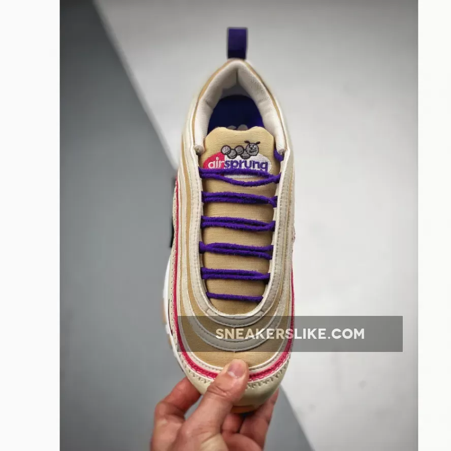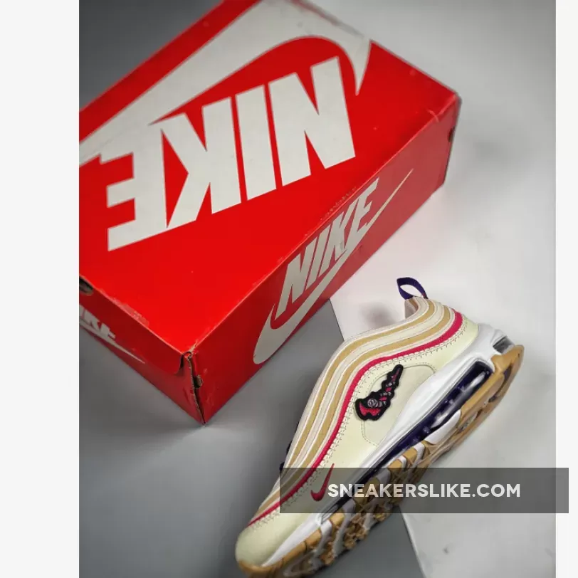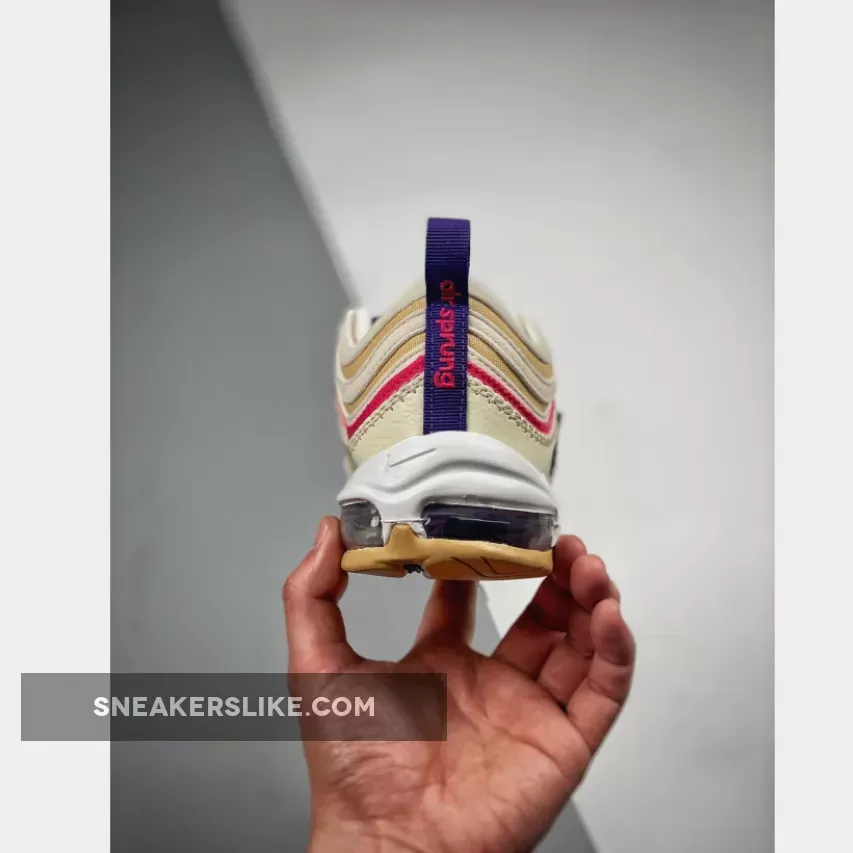 The Nike “Air Sprung” collection has just landed on the Nike Air Max 97. Beat the winter blues with the Nike Air Max 97 Air Sprung Beige Purple in spring hues. The first layer of the signature wavy upper is tumbled leather in the titular Beige. Riding atop this wave is a deep fuchsia followed by alternating layers of beige and tan. The midfoot window shows off a burlap-like material in beige and an adorable embroidered deep pink profile Swoosh with a light pink caterpillar wrapped around it on the lateral side. The medial side has an embroidered deep purple Swoosh matching the mini Swoosh on the mudguard on the lateral side. Deep purple accents continue on the laces and the grosgrain heel pull tab and the translucent full-length Air cassette on the midsole. A cute mushroom with a Swoosh for a smile can also be found on the outsole. Nike Air Sprung branding in purple and pink adorn the burlap-covered tongue.