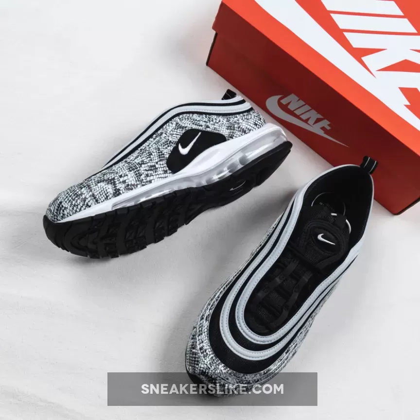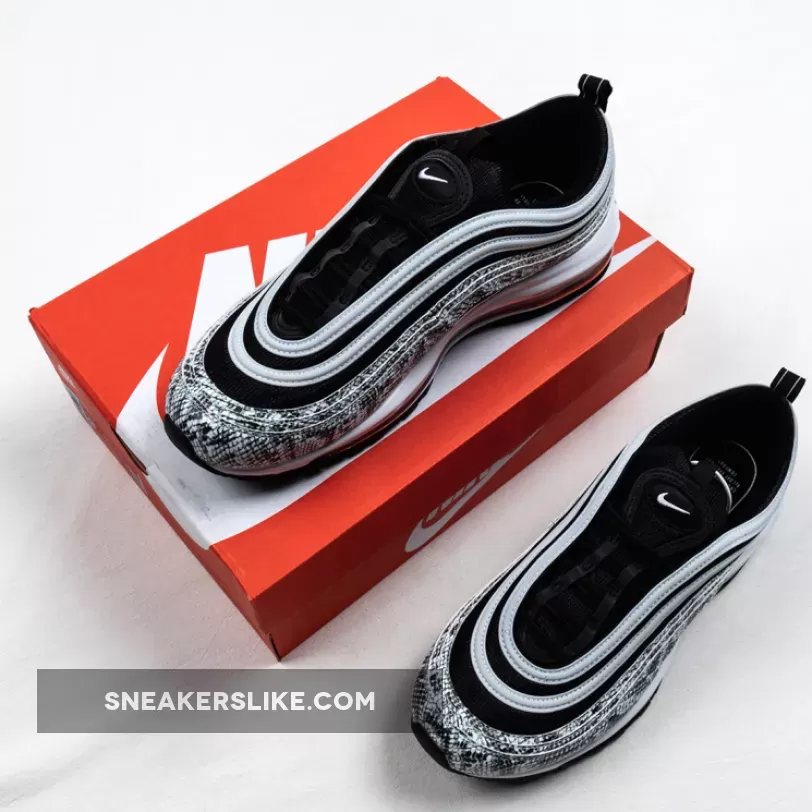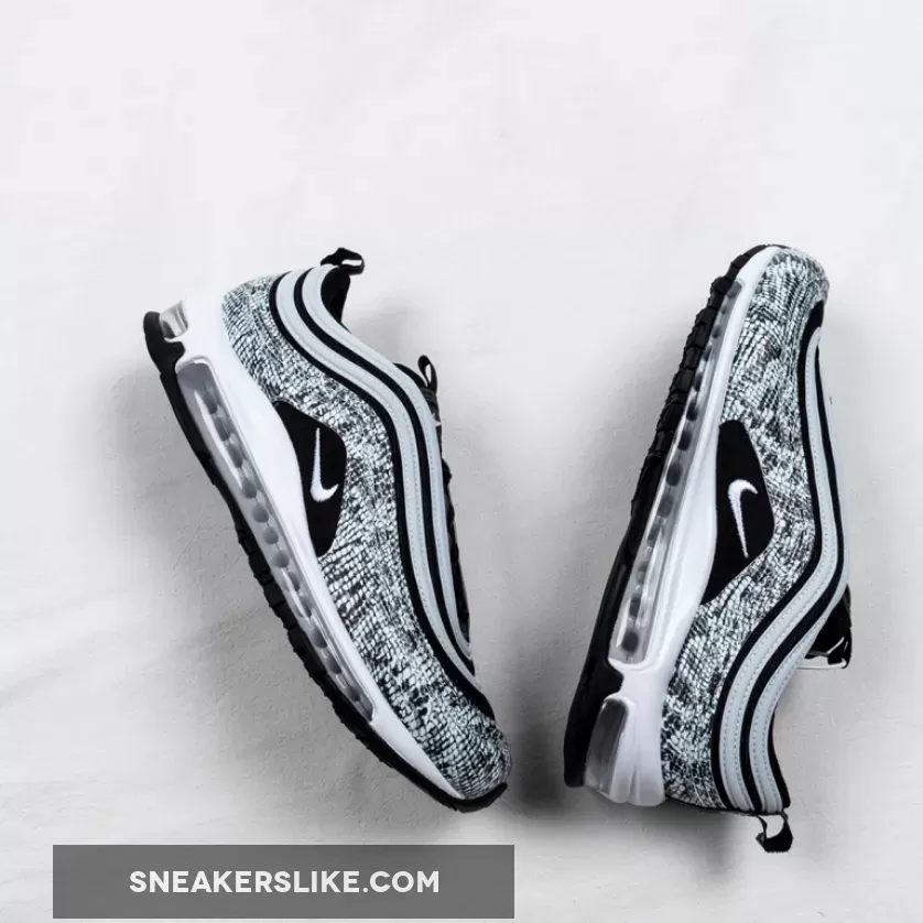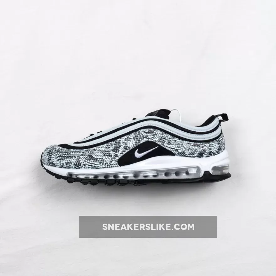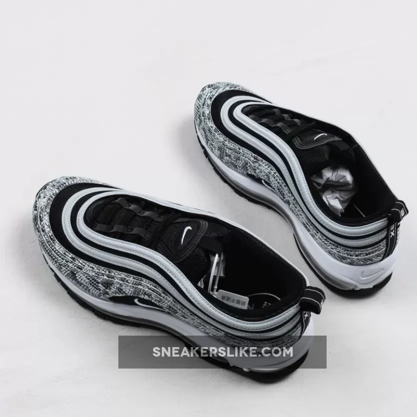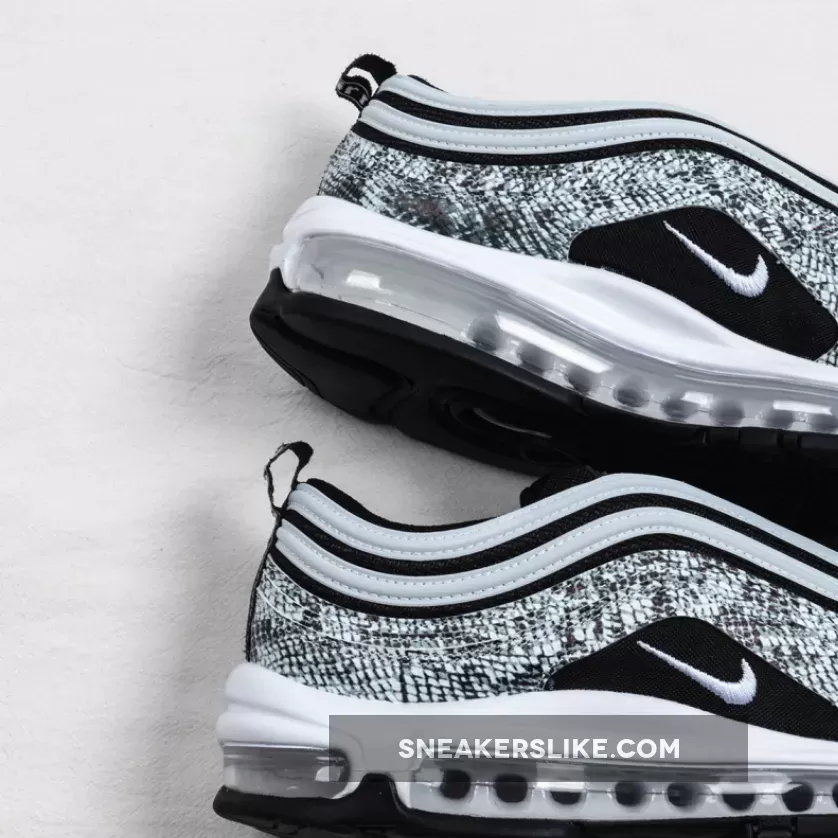 Nike’s Air Max 97 is set to keep its recent spate of wild colorways rolling right along with a reptilian style that seemingly nods to the classic Air Force 1 “Cocoa Snake.” Offering a classic black/white color scheme, the signature detailing on these Nike shoes is provided by a grayscale snakeskin print that slithers across the mudguard and bottom overlays. The upper’s bullet-train inspired racing stripes are dressed in crisp white, while a tightly-woven black mesh base holds the look together both literally and figuratively.