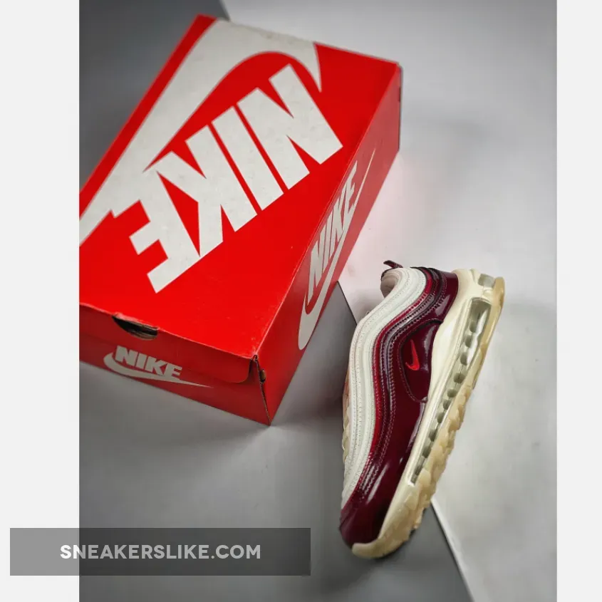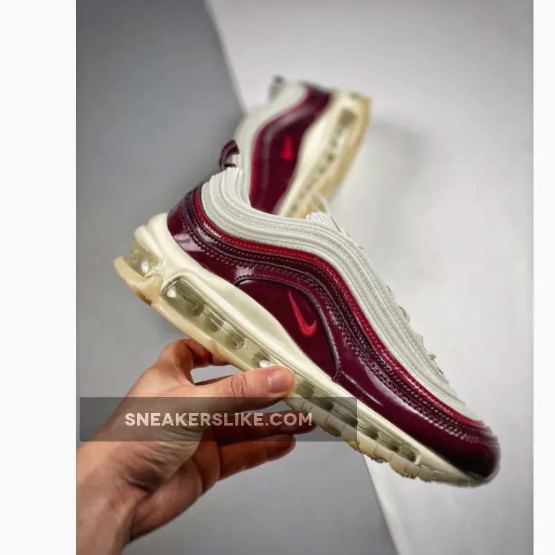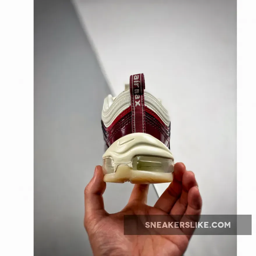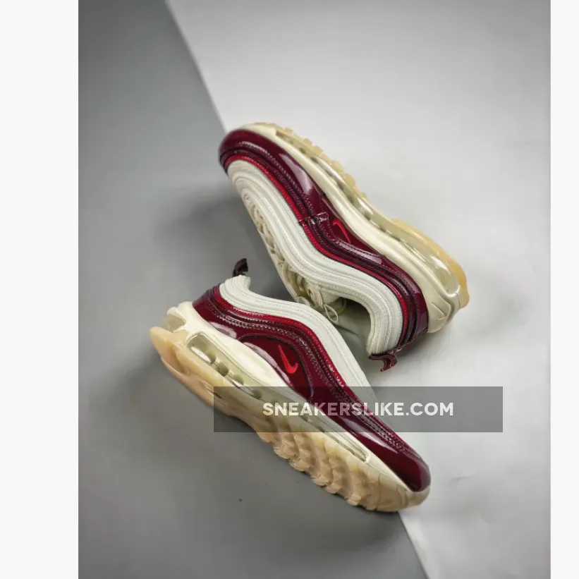 This offering of the Nike Air Max 97 features a Coconut Milk upper constructed in mesh and leather detailed with Burgundy and Red patent leather overlays.