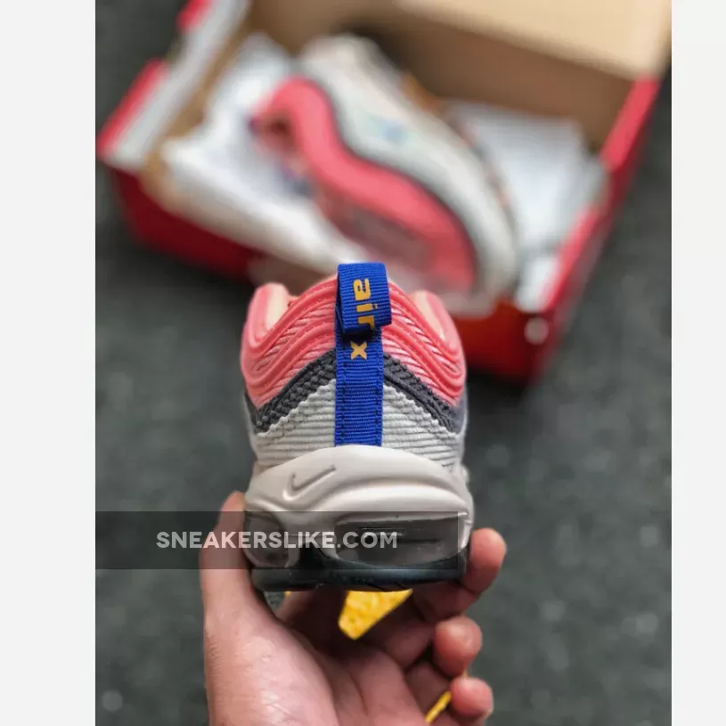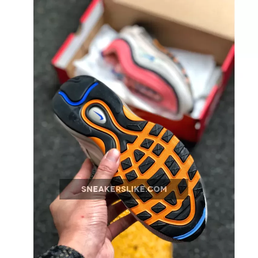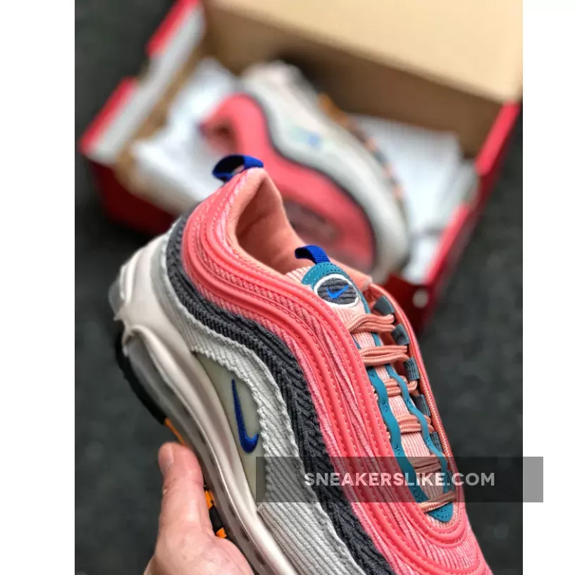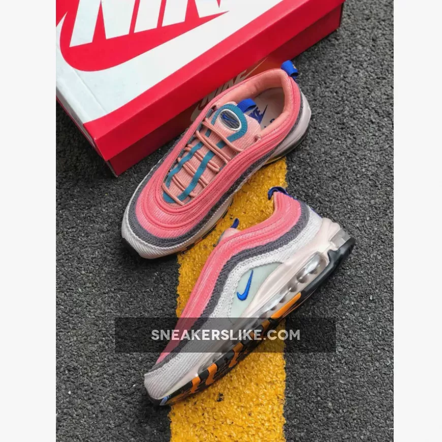 Both Air Max 97s sport a combination of Pastel Blue, Charcoal, Beige, Pink, and Orange hues.