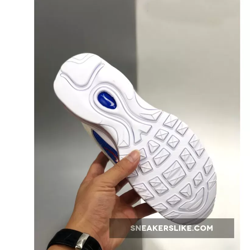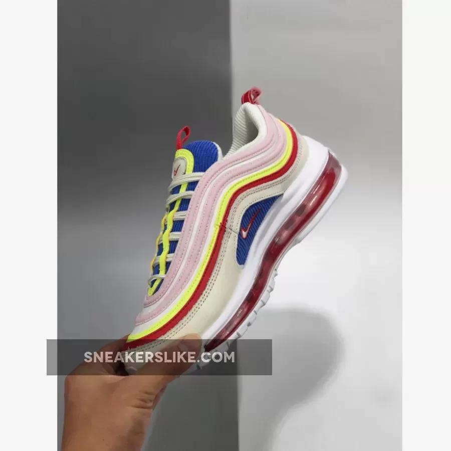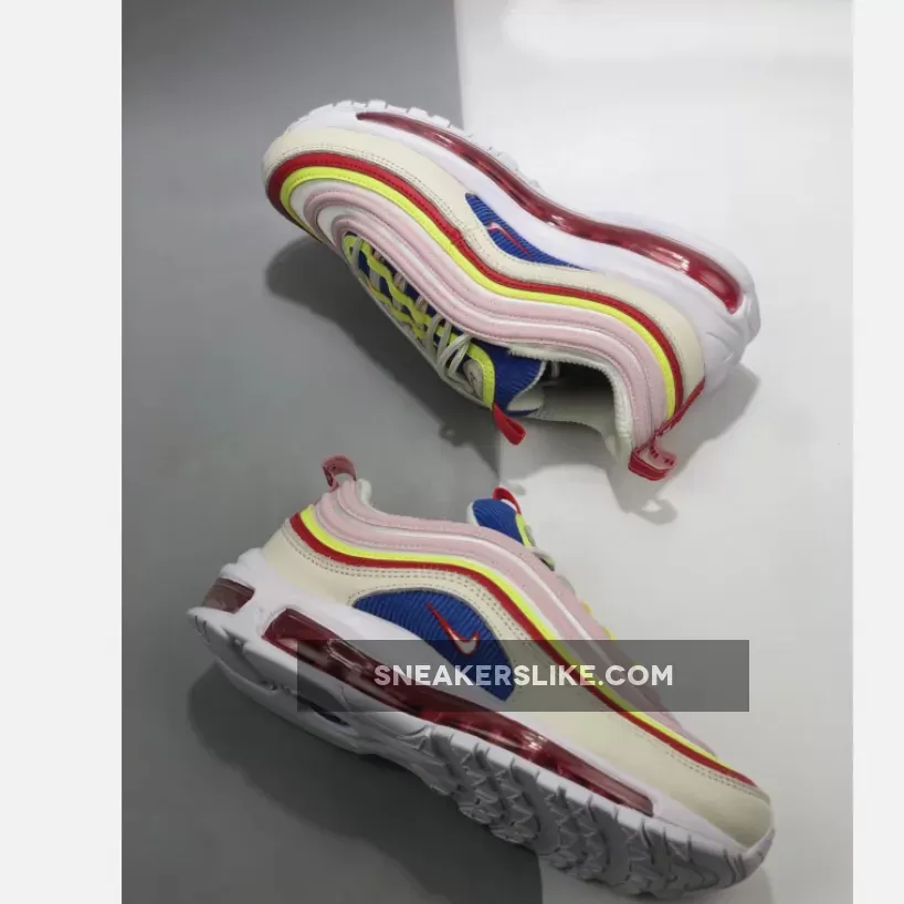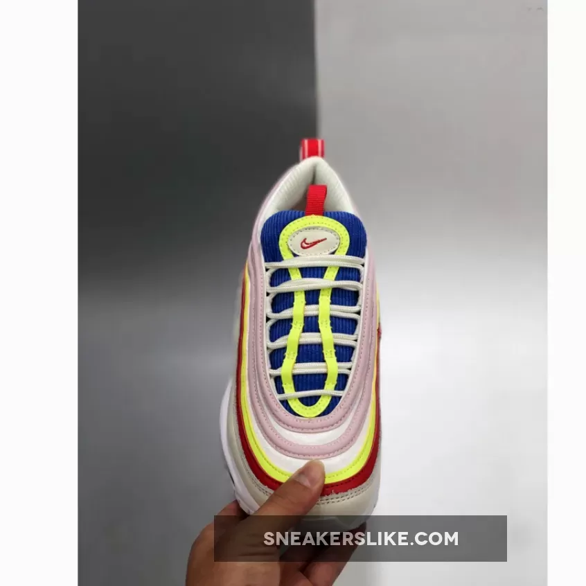 the Air Max 97, with a versatile corduroy material. A slightly more playful aesthetic is apparent on this iteration of the usually futuristic-looking sneaker as the upper’s swooping lines feature soft pink, neon yellow, and red. A white leather mudguard provides contrast, and the aforementioned corduroy arrives in a bright blue on the tongue and midfoot while also appearing in white on the inner lining. A red Air Max unit handles the cushioning, and mis-matched red/blue insoles and lace tips complete the shoe’s eccentric look.