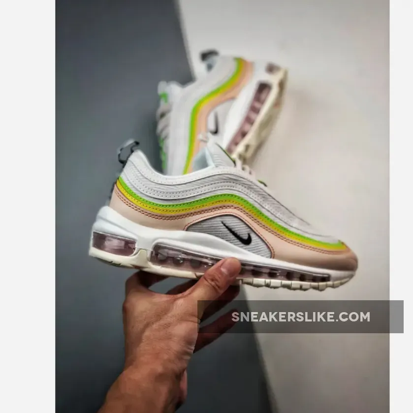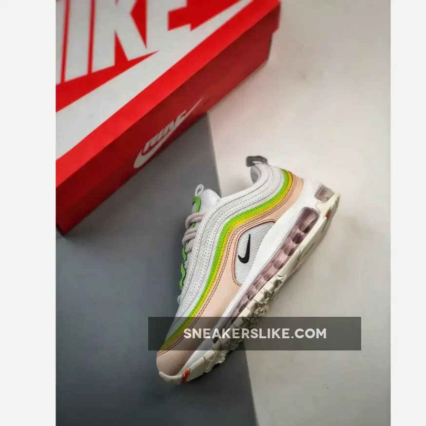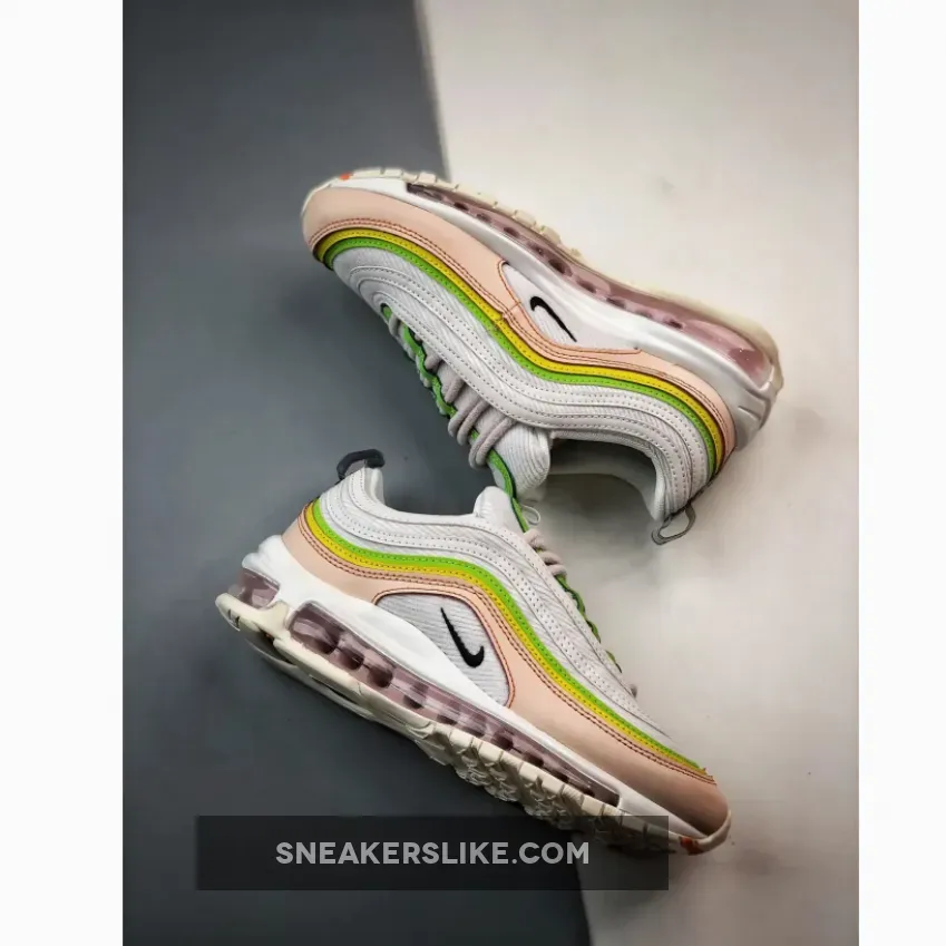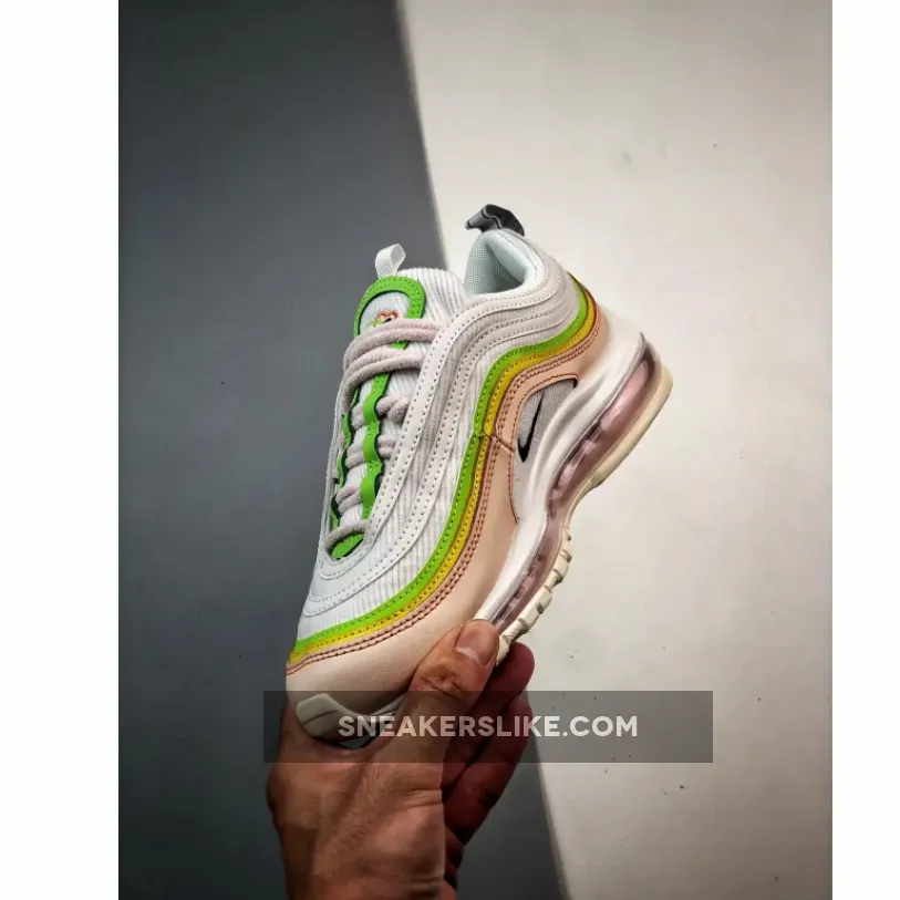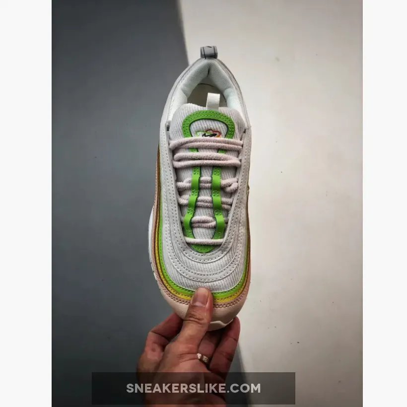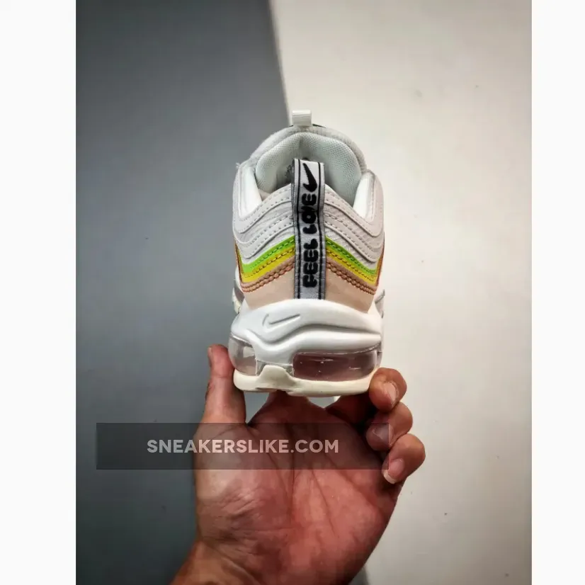 Celebrating its 25th year, Nike’s Christian Tresser-designed performance running silhouette, the Air Max 97, has a new love-themed release with vibrant, positive colours. Meet the Nike Air Max 97 Feel Love. This AM97 has a “White / Black / Pearl Pink / Action Green / Opti Yellow / Sail” colour scheme. The upper swaps out the usual mesh with a unique White corduroy. The wraparound wave design features bright White, Action Green and Opti Yellow, some of the panels with 3M reflective finish, while the bottom-most mudguard layer is subtle Pearl Pink. To emphasise the “Feel Love” theme, interlocking green, yellow and peach hearts can be found on the tongue tab and the insoles.