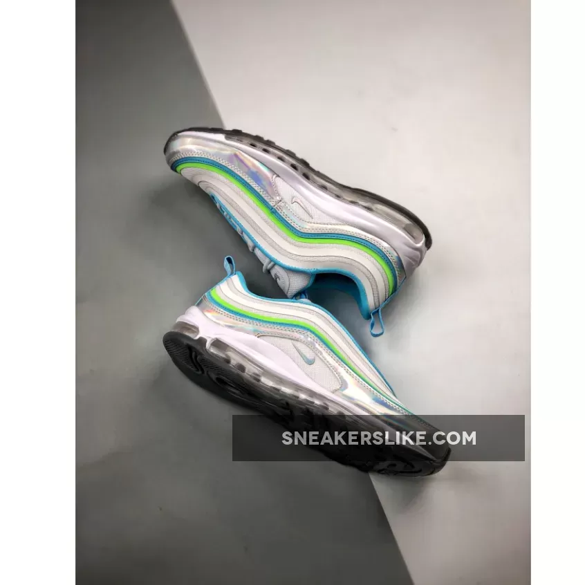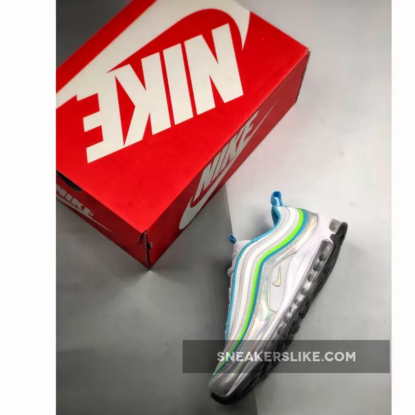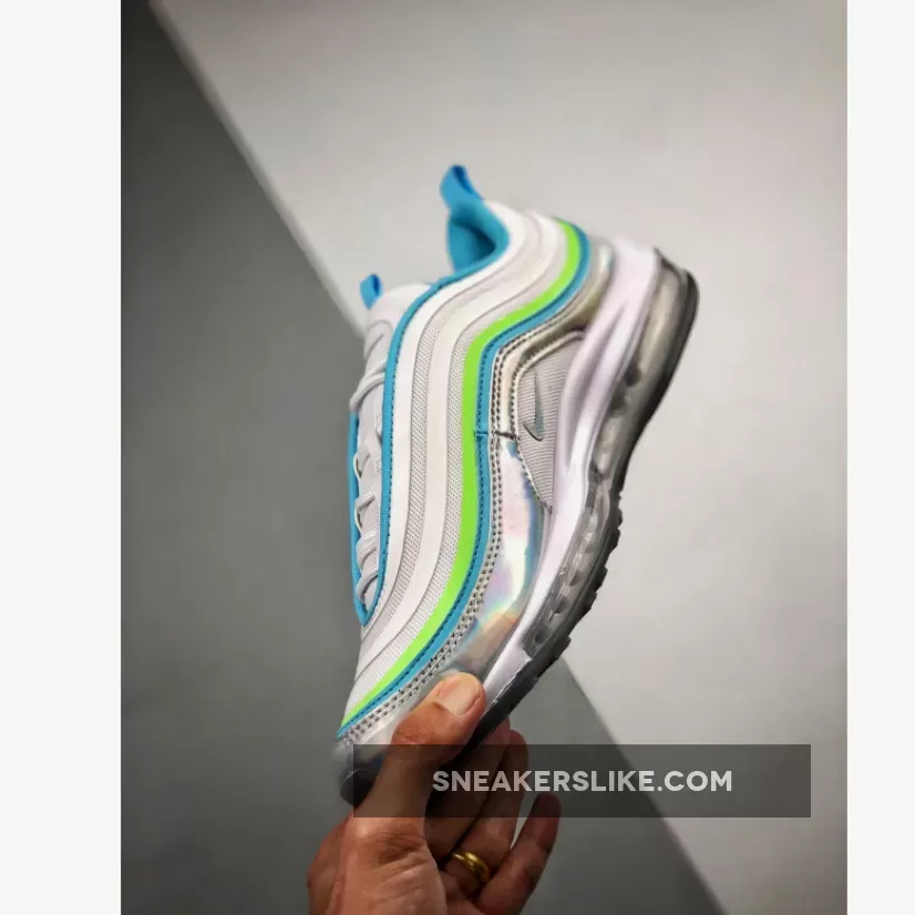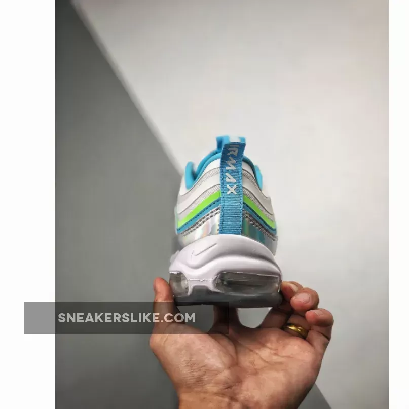 As you can see this Nike Air Max 97 features a shimmering iridescent across the mudguard which displays various shades. We also have White across the upper, Blue and Light Green.