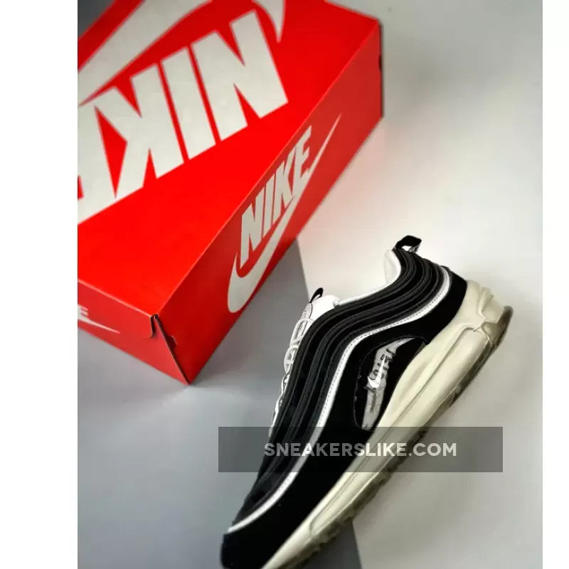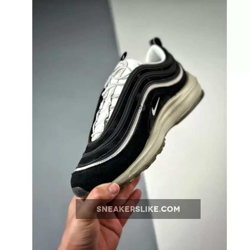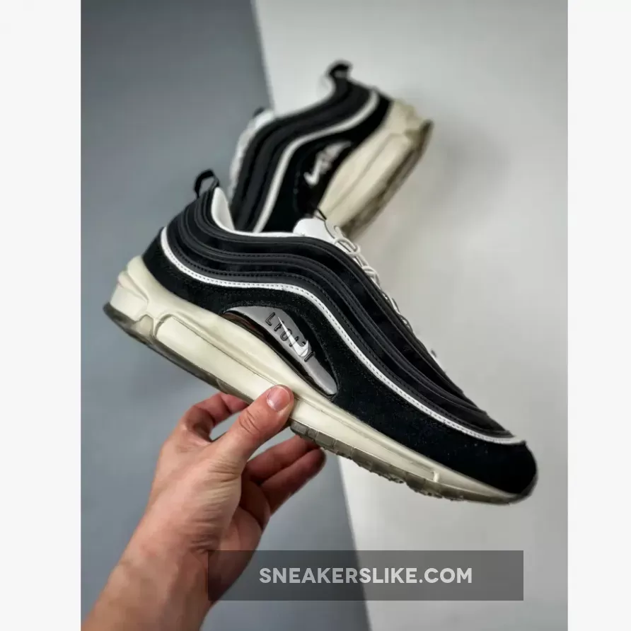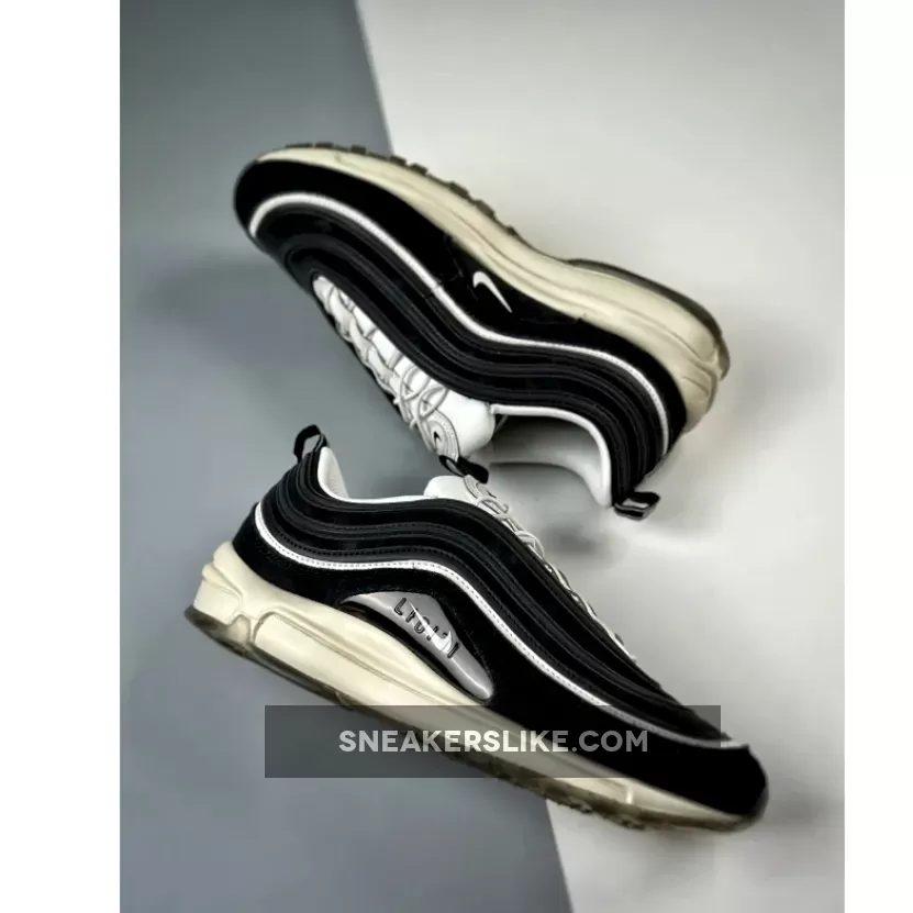 this Nike Air Max 97, laces toggles play support to a number of more interesting details, from the premium materials to the concealed Air Units. The palette itself, however, is comparatively understated, with vintage tones separating this pair from your average inline colorway. These creams are used mainly across the lace unit and midsole, the latter of which features blocked out Air Units from wall to wall. Above, the construction — which consists of various suede and leather layers — is much more standard save for the lack of mesh along the base; instead, said fixture is replaced with what appears to be a patterned fabric, whose black finish complements both the paneling and branding adjacent.