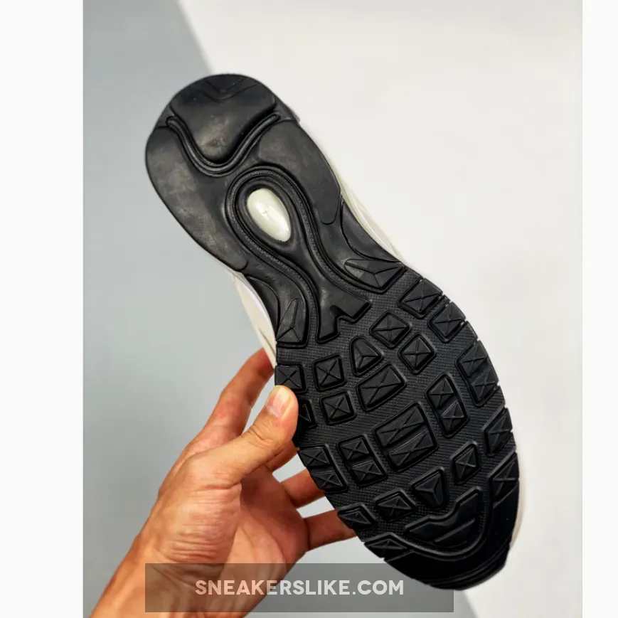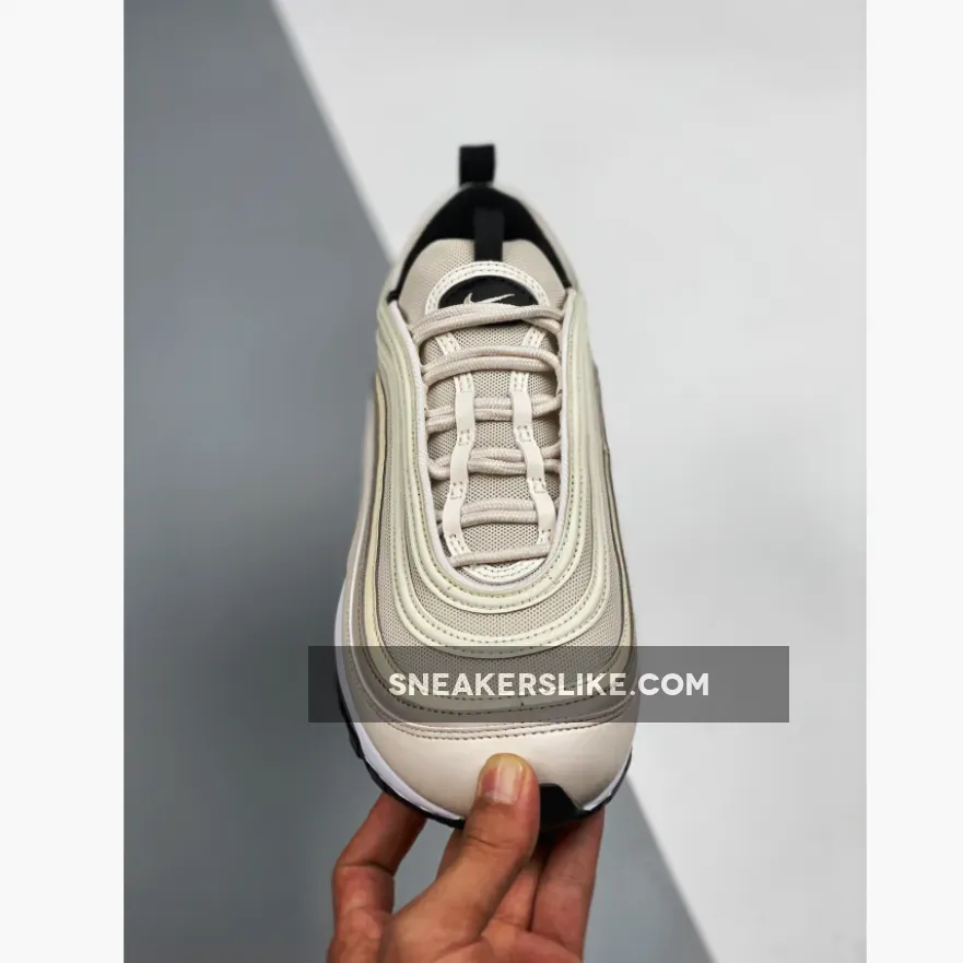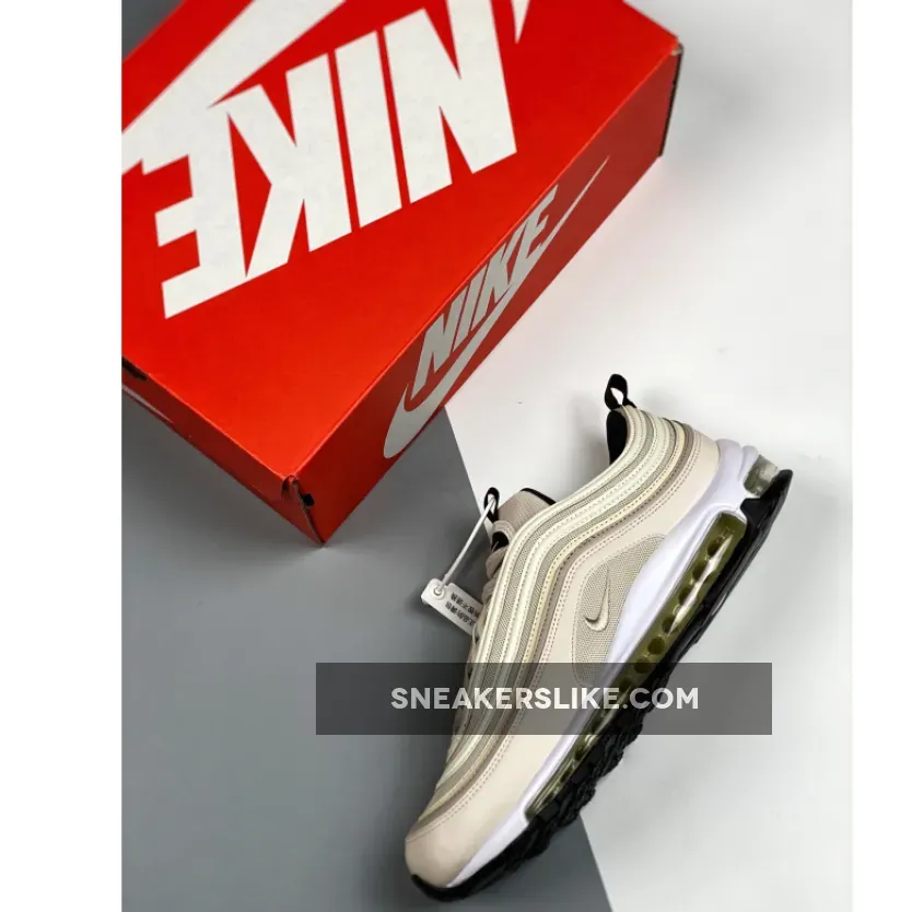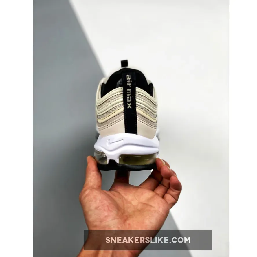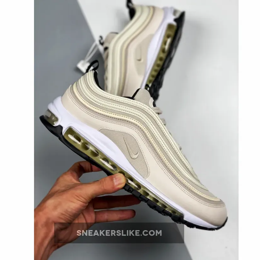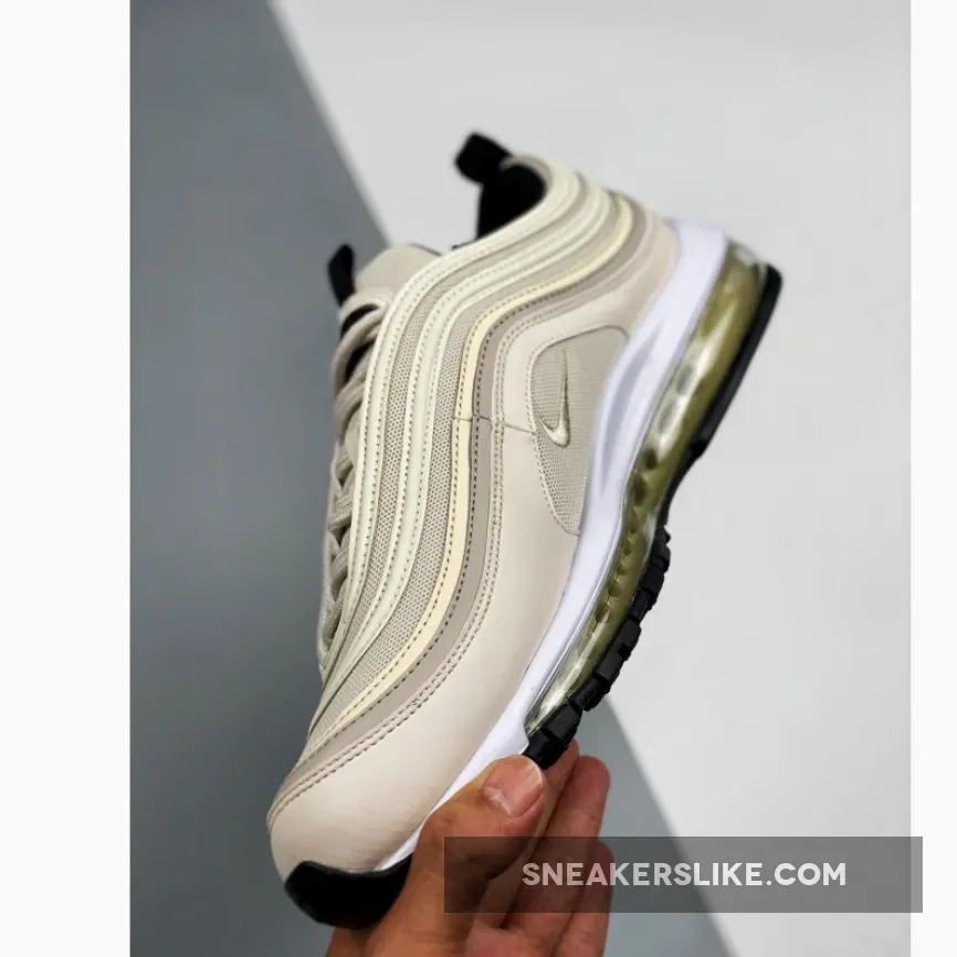 Dressed in Phantom, Desert Sand, Black, and Beach color scheme. This Nike Air Max 97 sports an Off-White upper with Sandy Tan accents contrasted with Black detailing on the tongue, heel, and rubber outsole.