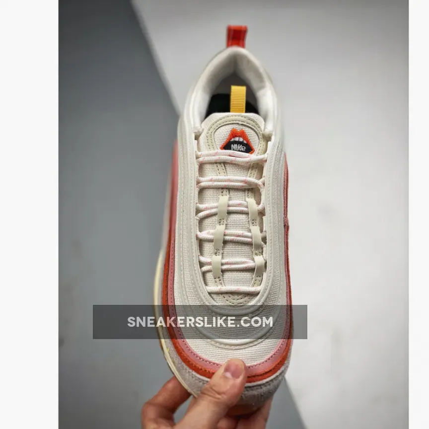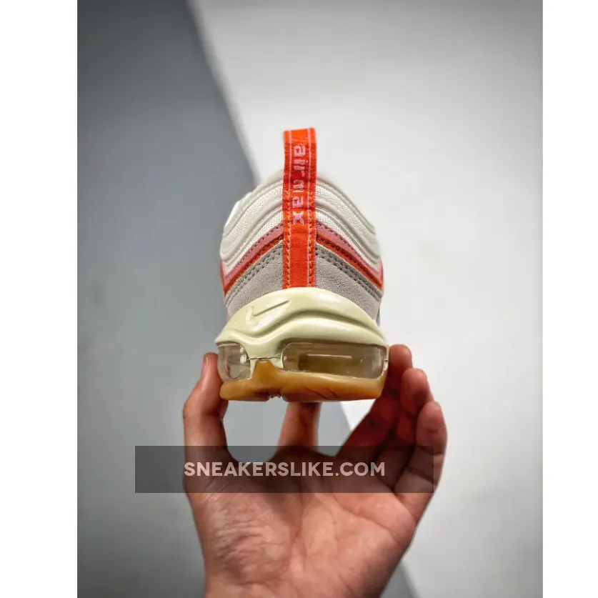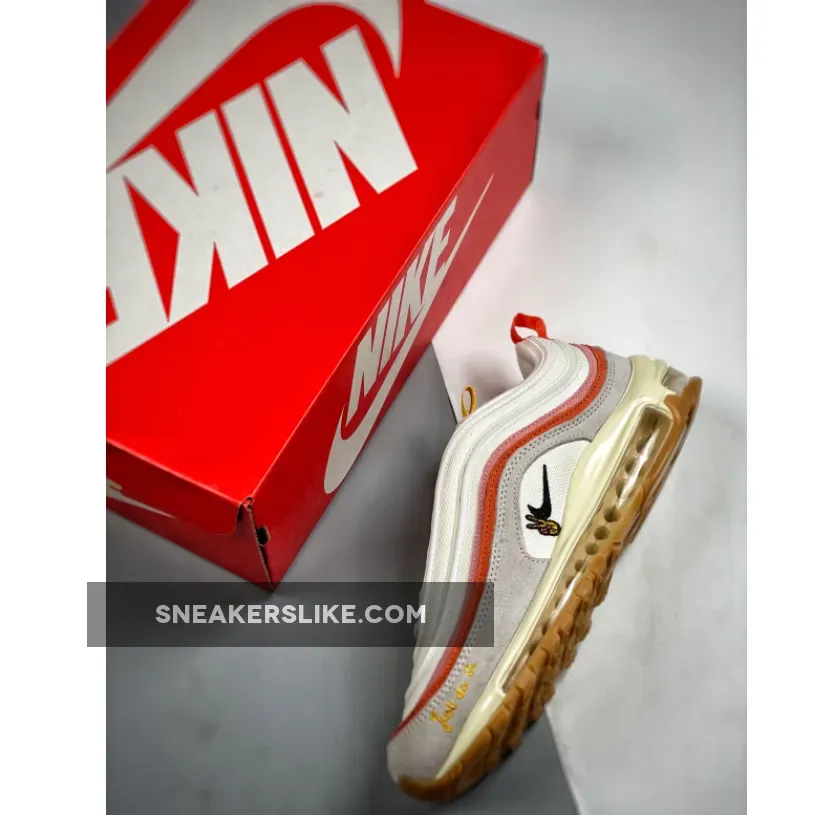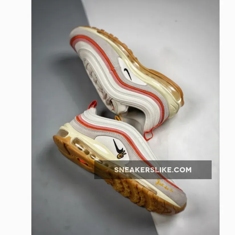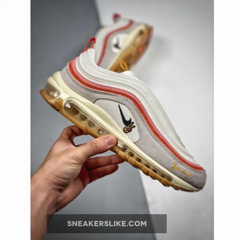 Like the AF1, the Air Max 97 is dressed in a soft, Spring-appropriate palette. “Sail” is used heavily across both suede and mesh, amplifying the custom details added atop. This is why you instantly notice the embroideries along the side, which proffer not just a blacked out Swoosh but also a peace-signing hand and elegant “Just do it” text. Adjacent, the pink and reddish orange panels stand out similarly, the latter of which complements the heel tab as well as the lipstick-covered mouth that outfits the tongue/insole.