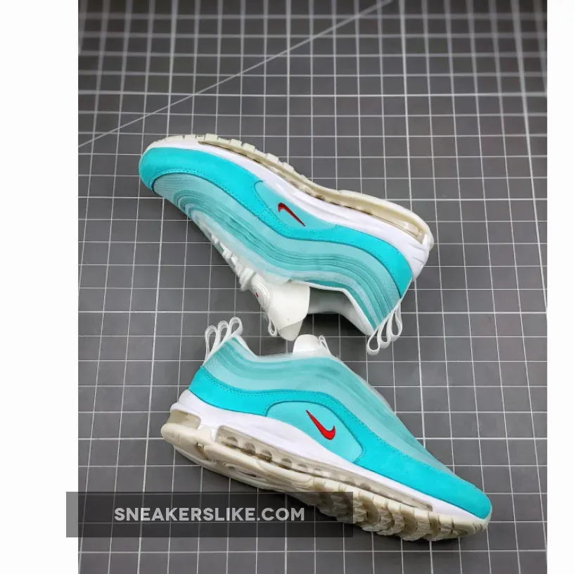 this Nike Air Max 97 features multi-layered upper which is paired with a Blue translucent upper, suede on the mudguard and White accents. In addition we have Red branding on the tongue and panel. Following we have multiple tongue and heel pull tabs, White placed within the Air Max unit and three Swoosh logos on the insoles.