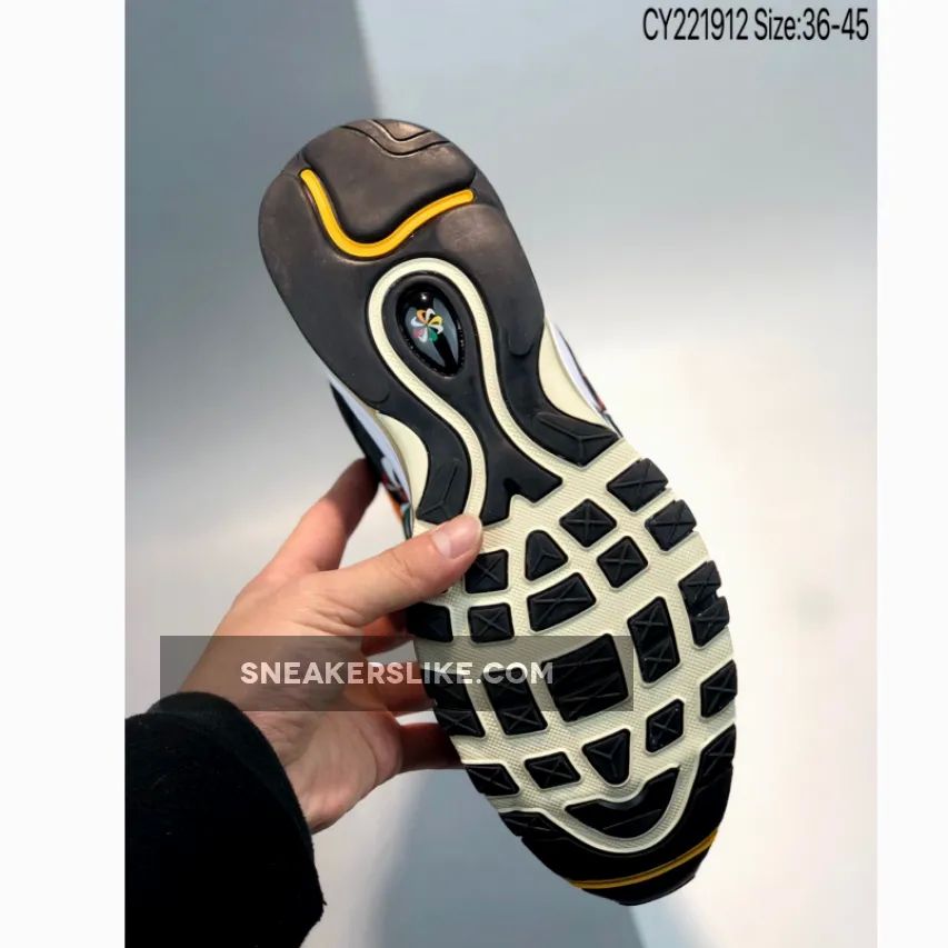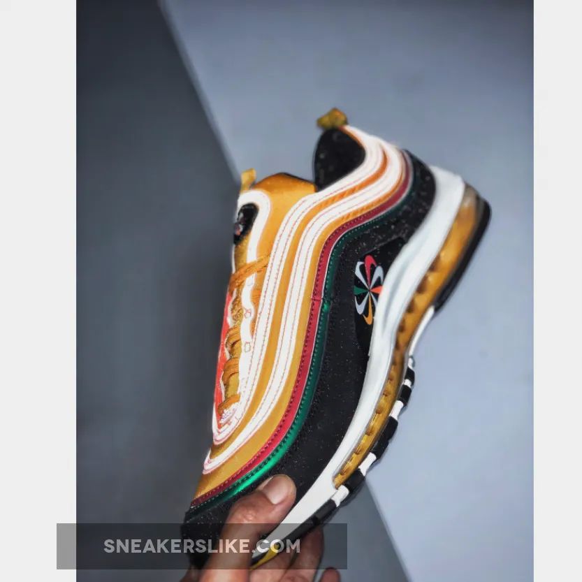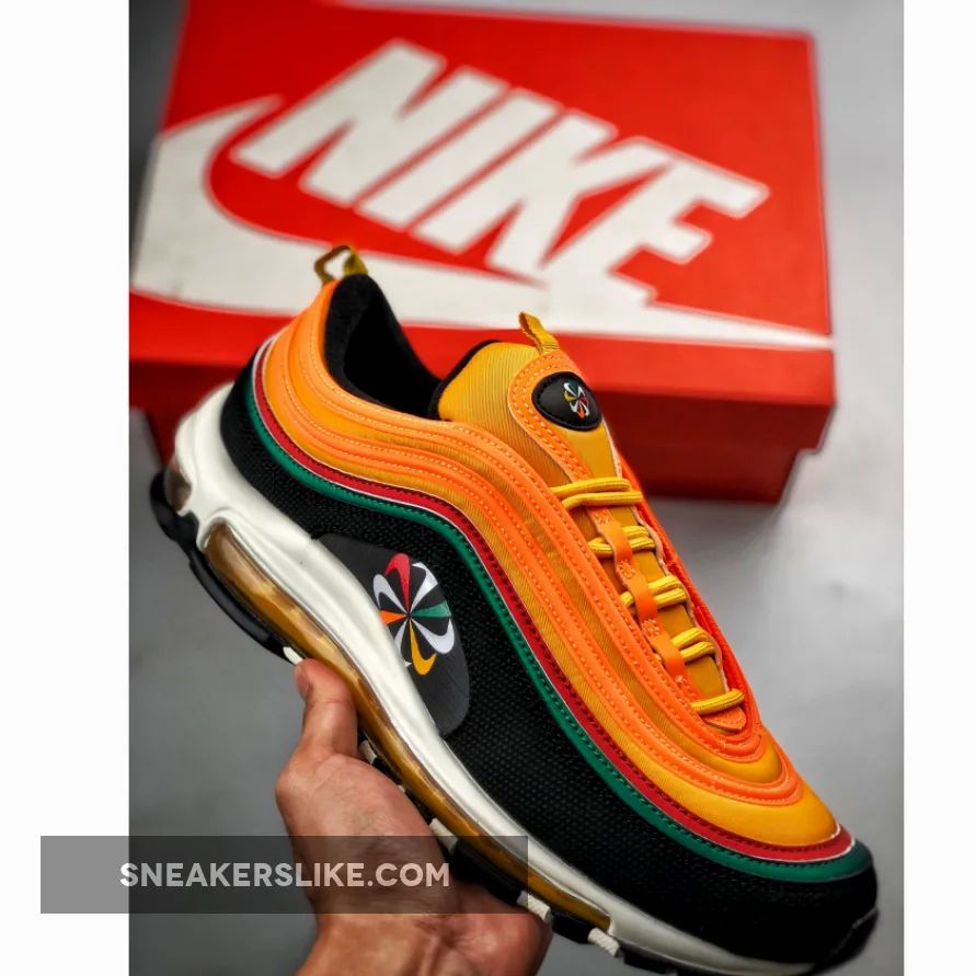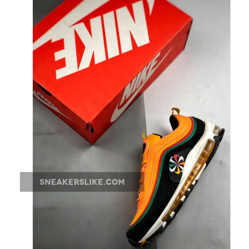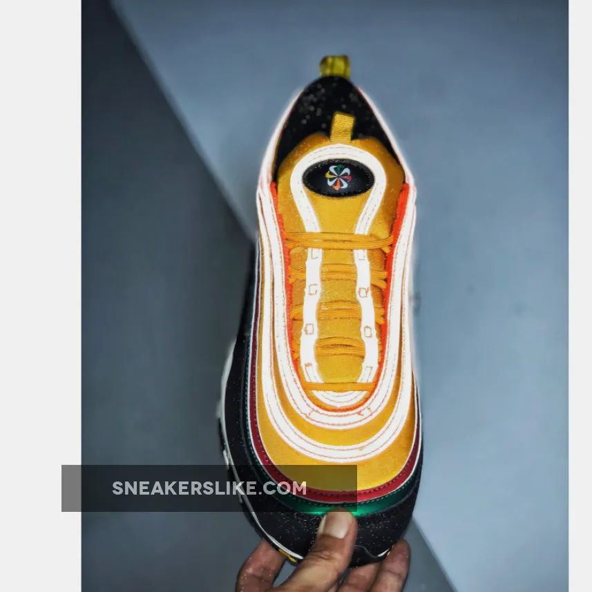 The circular nature of the design allowed for club names to be arched over it — a regular conceit in collegiate and sportswear graphics of the era. The Sunburst Pack places this logo on the Nike Air Force 1, Air Max 97, Air Max Plus and React Element 55.