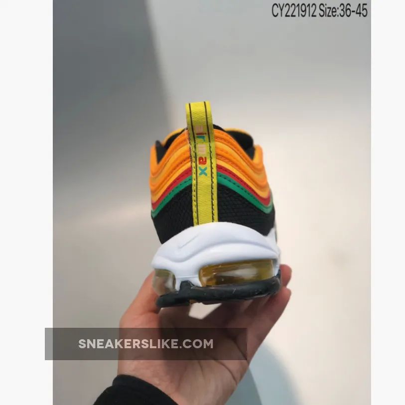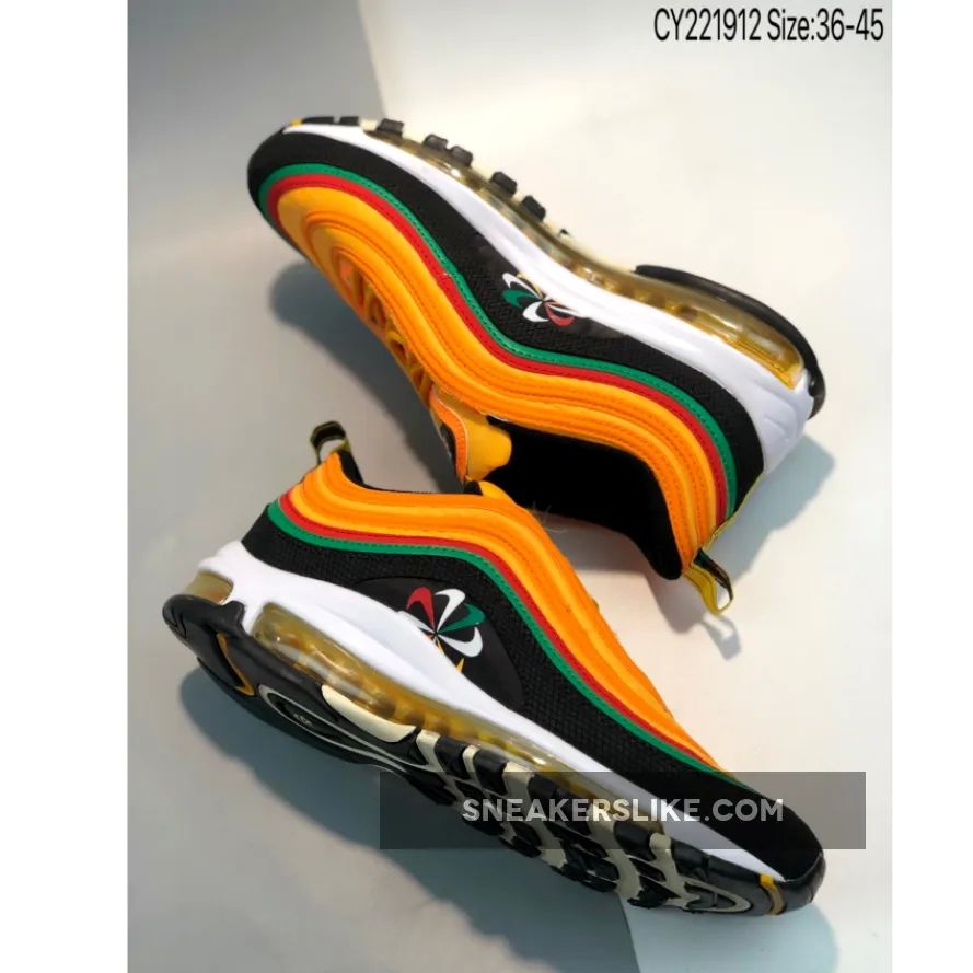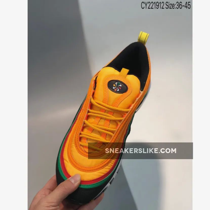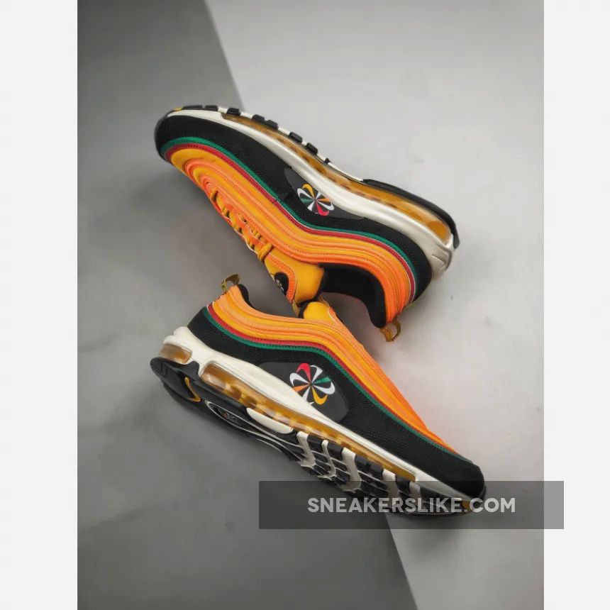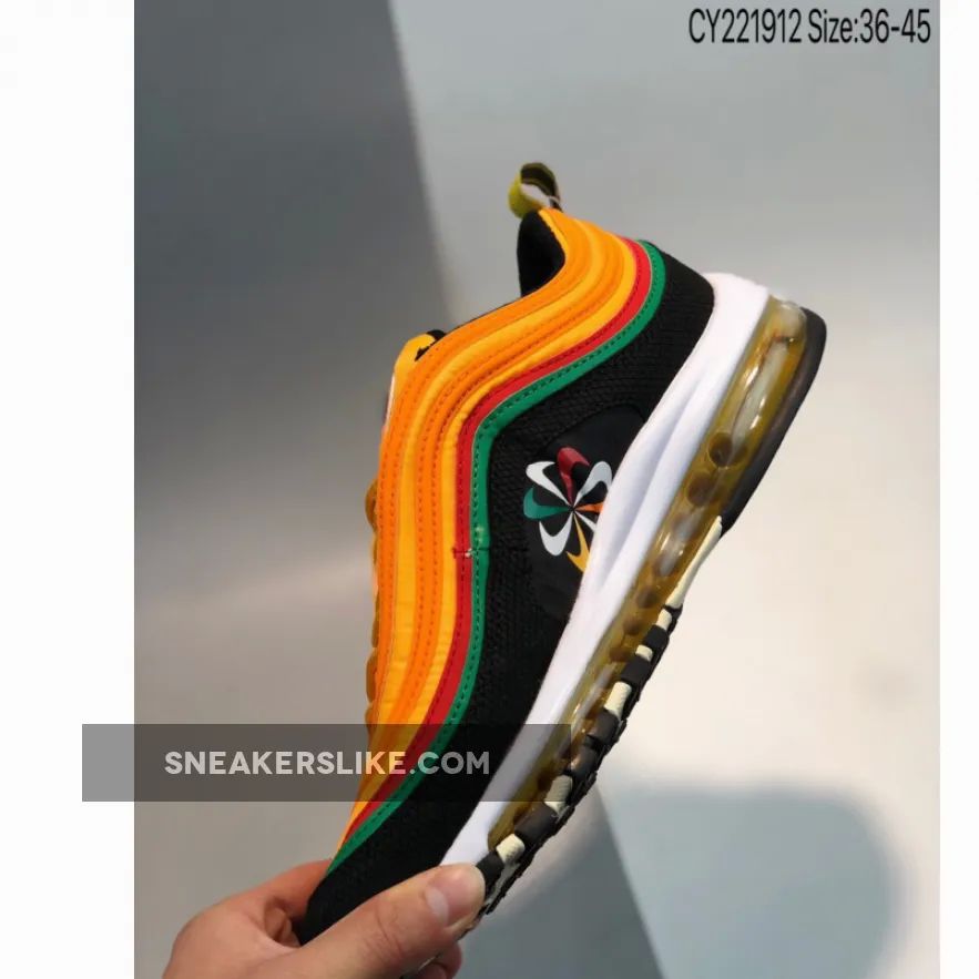 The circular nature of the design allowed for club names to be arched over it — a regular conceit in collegiate and sportswear graphics of the era. The Sunburst Pack places this logo on the Nike Air Force 1, Air Max 97, Air Max Plus and React Element 55.