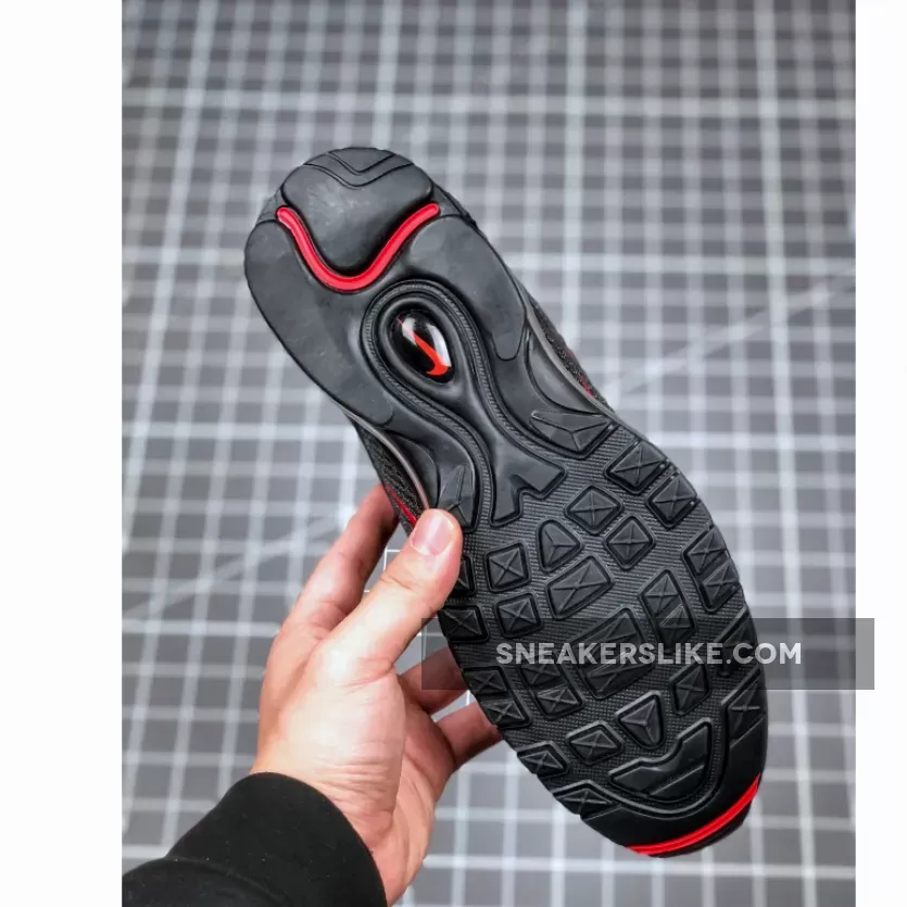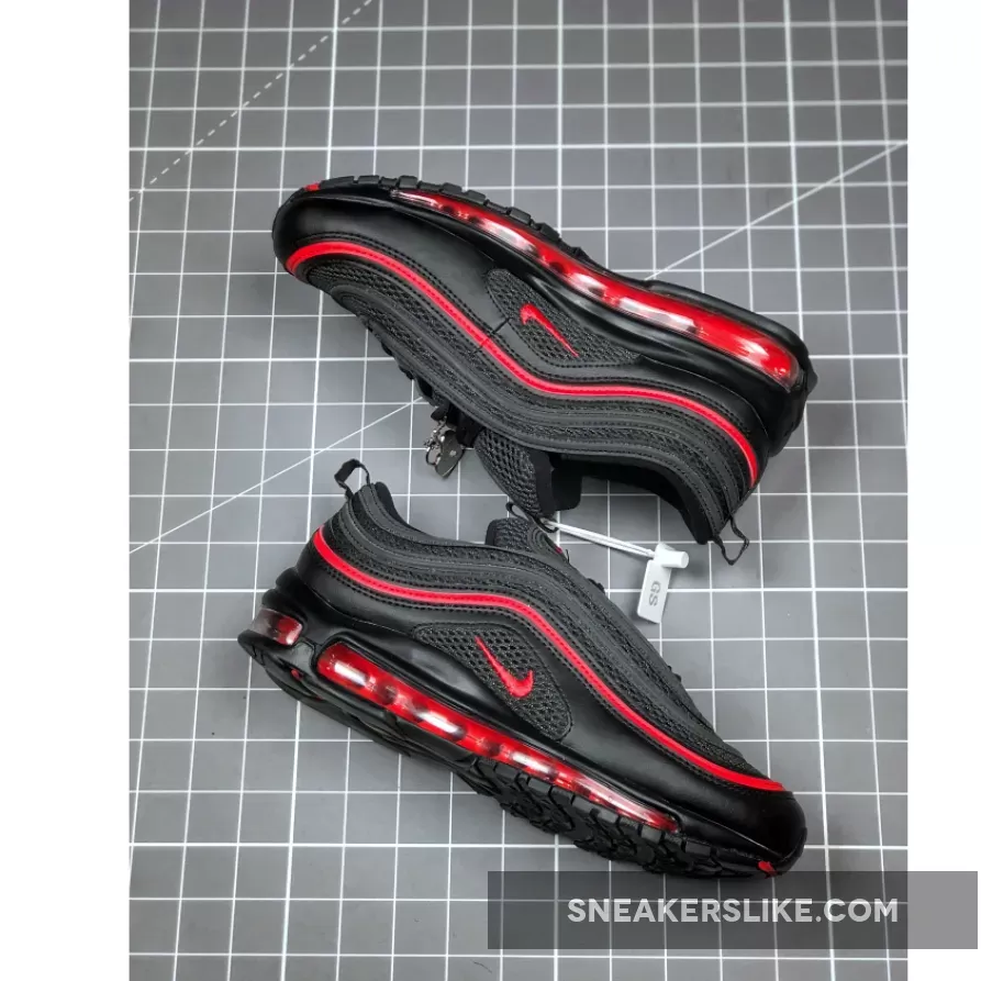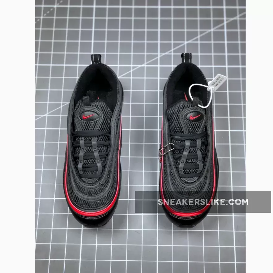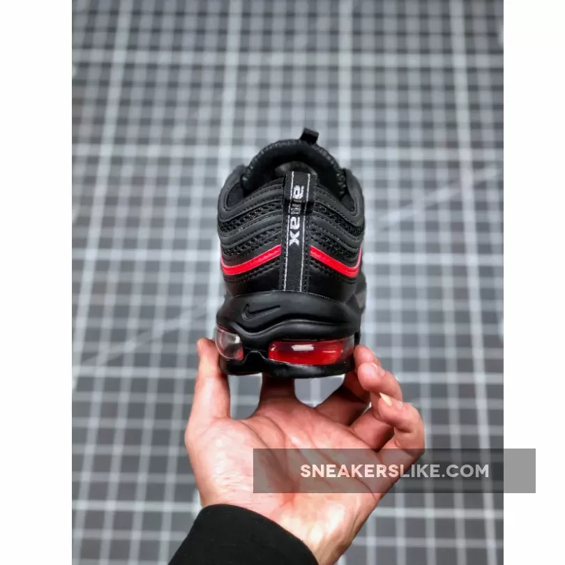 This offering of the Nike Air Max 97 features a Black open-mesh upper with Black leather overlays on the mudguard. Red contrasting accents gives off that V-Day vibe along with 3M reflective detailing. Highlighting the shoe is a love heart locket hangtag as a nod to the beloved holiday.