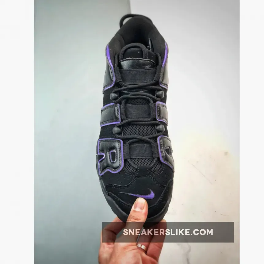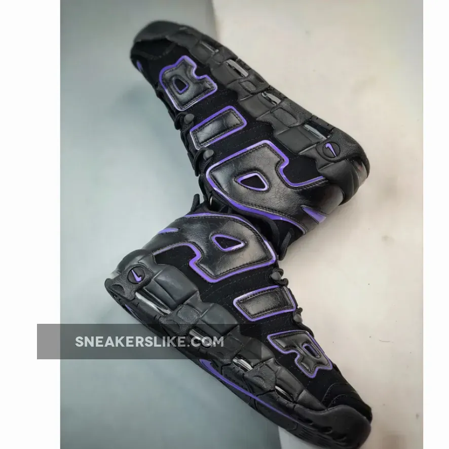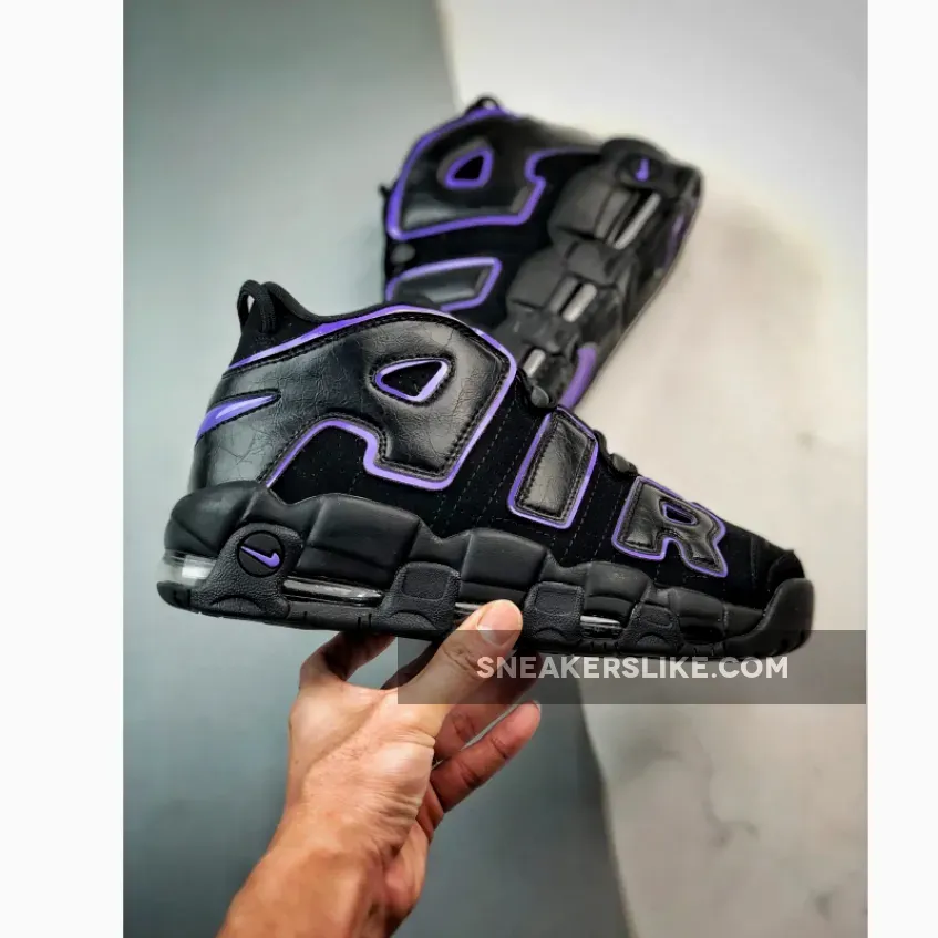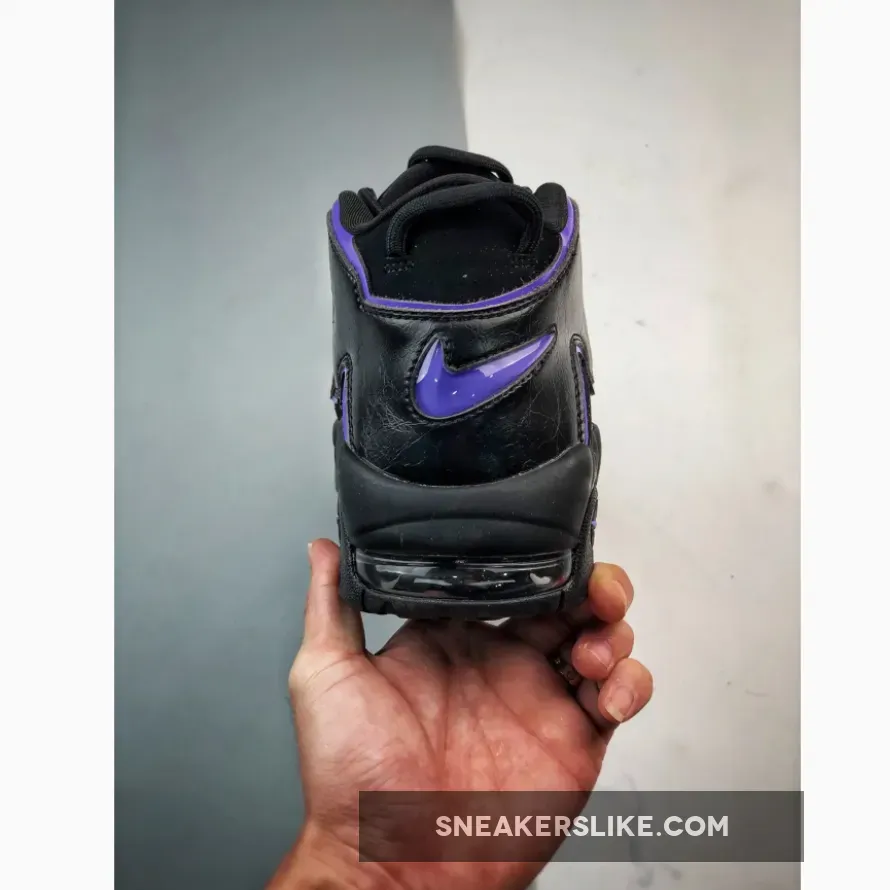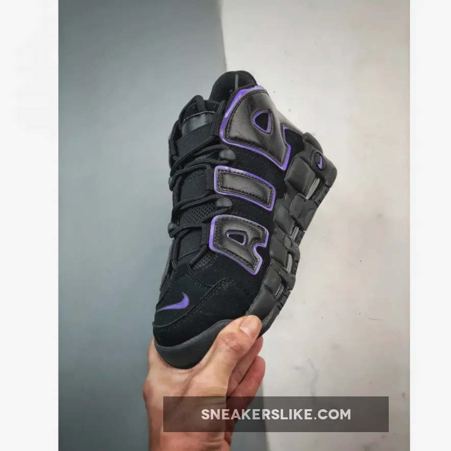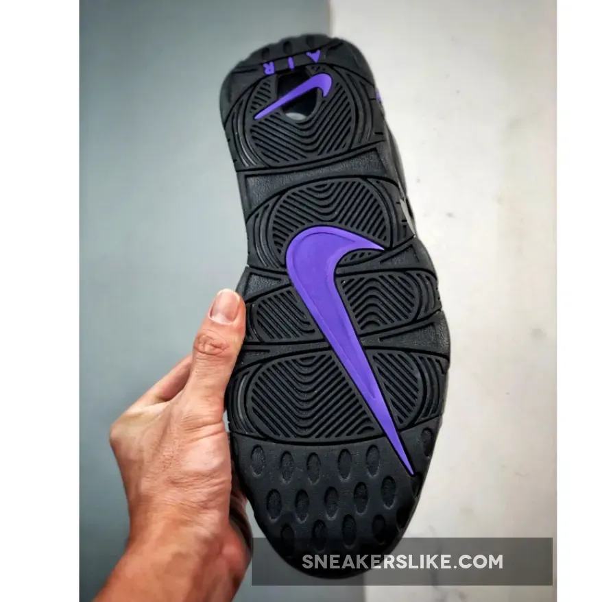 Dressed in a Black, Action Grape, White, and Metallic Gold color scheme. This offering of the Nike Air More Uptempo features a Black nubuck base with mesh tongues and cracked leather overlays. The underlays of the sewn-on “AIR” patches are in high-contrast Action Grape. Mini encircled Swooshes in purple adorn the lateral heels. An all-black sole unit with exposed Air bags and purple accents on the tread caps off the design of this sneaker.
