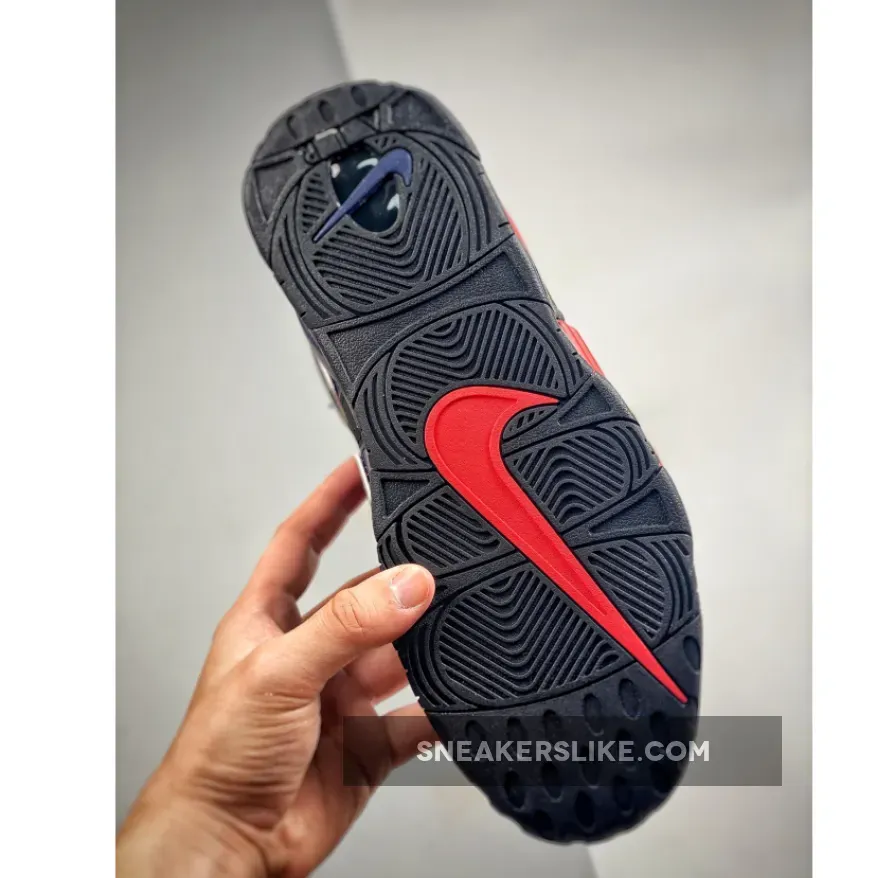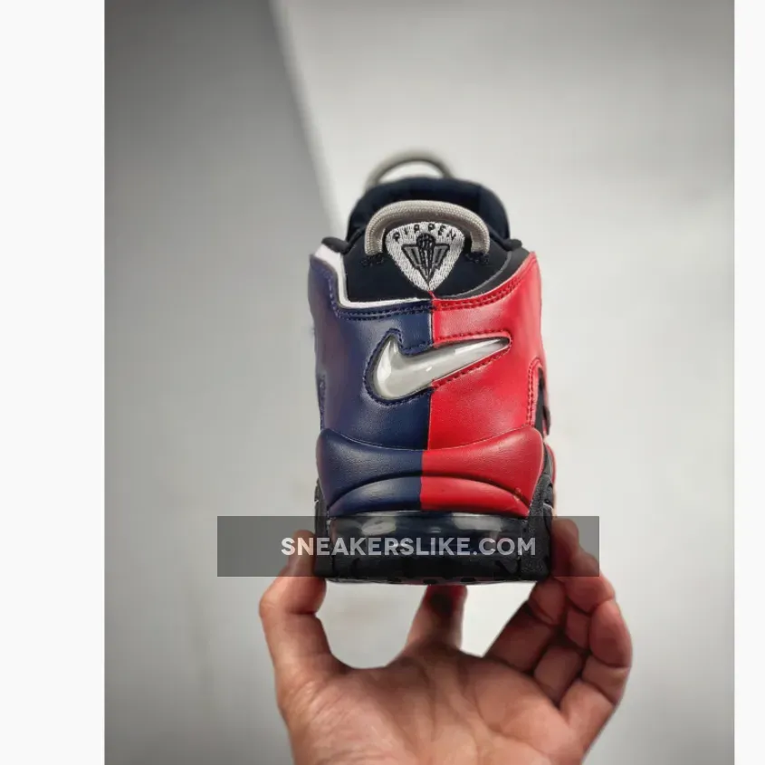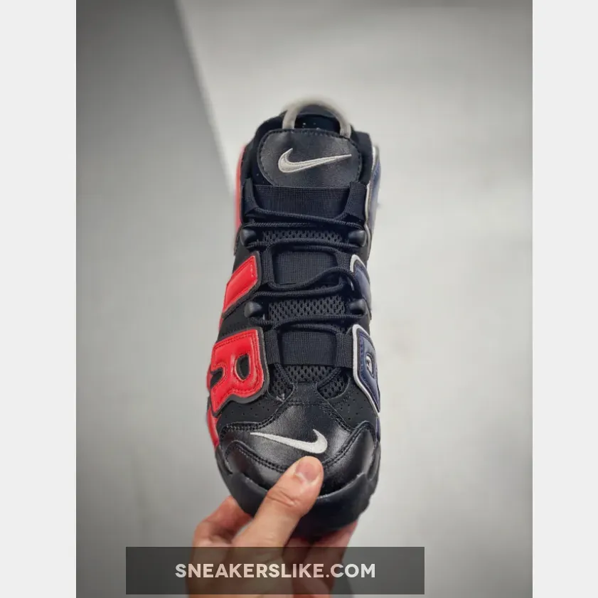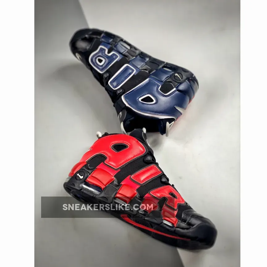 The Nike Air More Uptempo has always had playful design opportunities with its oversized “AIR” branding inspired by ‘90s graffiti and pop art. The new Nike Air More Uptempo Black Navy Red is the latest iteration of this exciting line.The base of the upper is perforated suede in black with smooth leather overlays on the toe also in matching black. This dark composition makes the perfect backdrop for the zany “AIR” appliques covering the entire quarter and wrapping around the heel. On the lateral side, the “AIR” appliques are in vivid red with black outlines. The red extends further, coating the black midsole. On the medial side, the “AIR” appliques are in navy with a white border. Similar to the treatment on the lateral side, the blue hue extends onto the midsole. White Swooshes can be seen on the toe box and the midsoles while a jelly-like Swoosh adorns the heel. A tribute to basketball legend Scottie Pippen in black, grey and white can be seen on the heel, right below the grey cord heel pull.