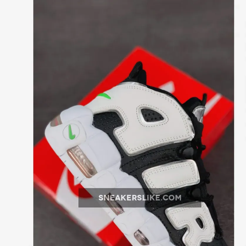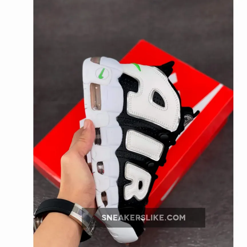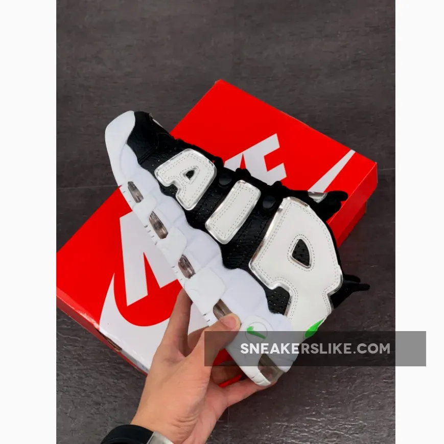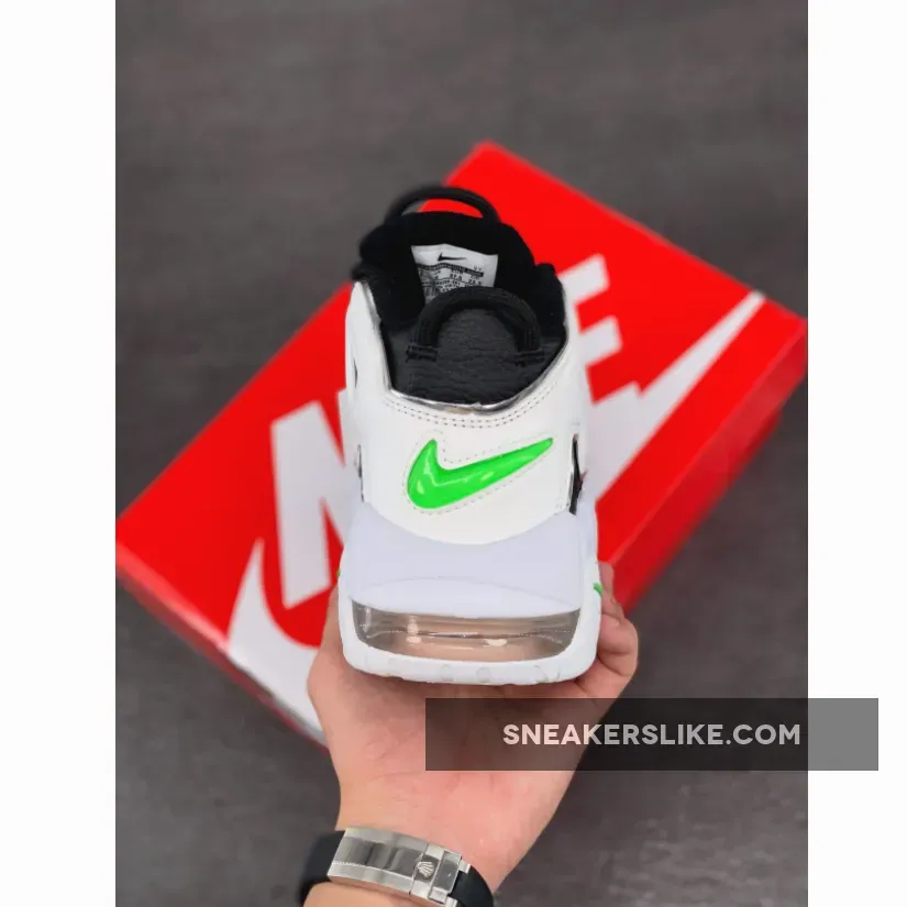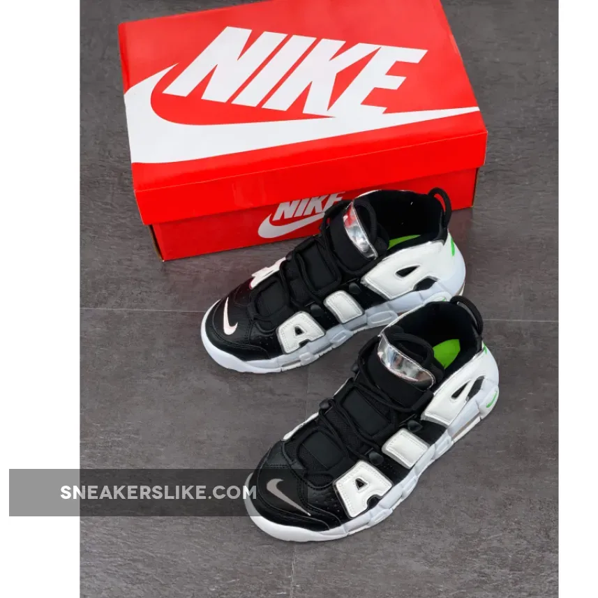 The Nike Air More Uptempo Black Metallic Silver sees bold hues of green splashed across the Nike branding, including the mini-Swoosh at the back of the Uptempo and the translucent ticks on the heel of this bold trainer. The Uptempo has a high ankle collar, meaning there is support and comfort in every step, whilst the instantly recognisable silver Air panelling across the body of the kick extends all the way up. Nike can never go overboard with the Swooshes, so for good measure, there is another embroidered in silver on the toe box over the smooth leather overlay. The black lacing system appears a bit different to other Nike trainers, however it is functional and stylish at the same time. To cop the Nike Air More Uptempo Black Silver Green, use the links on this page and make sure to tag Our Store Supplier in your IG pics for the chance to be reposted.