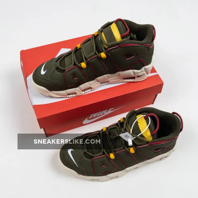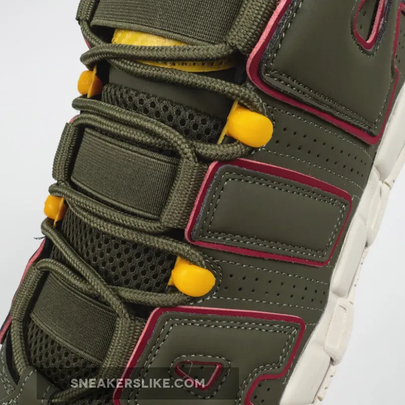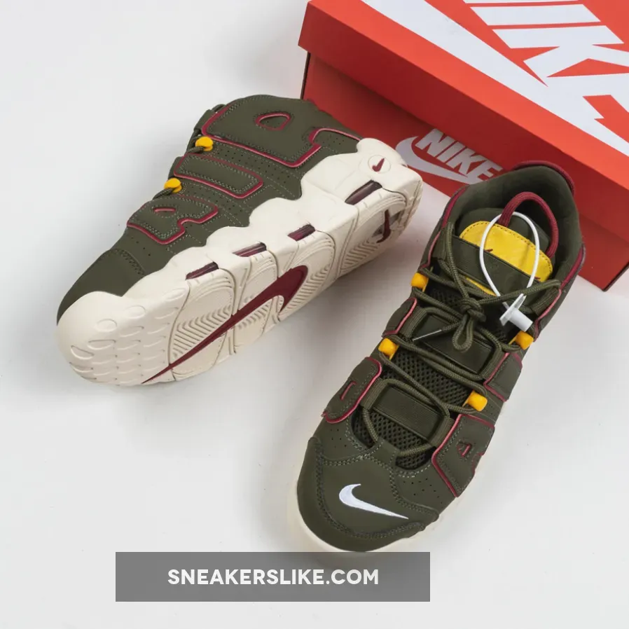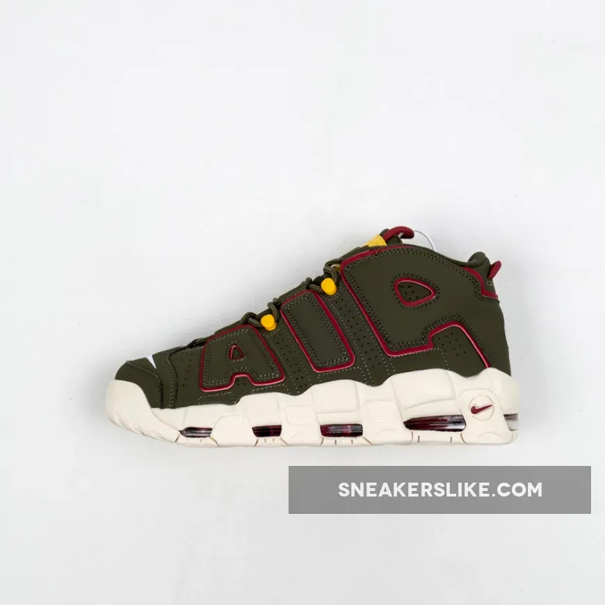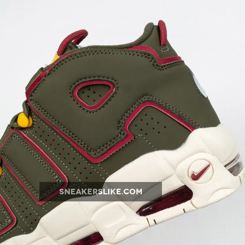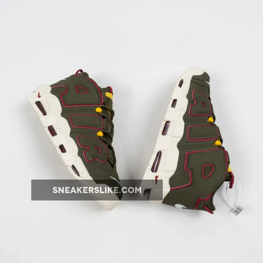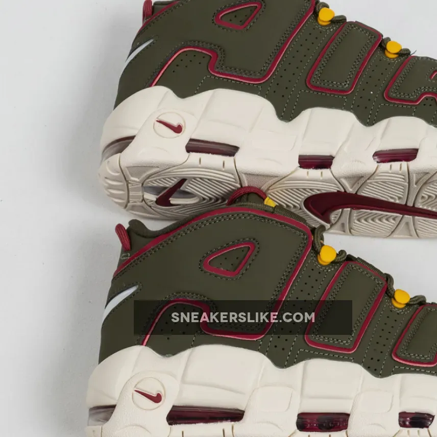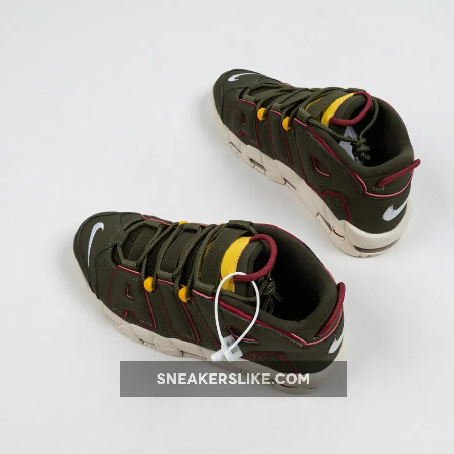 this Nike Air More Uptempo comes with Cargo Khaki across the upper along with Red which is applied to tongue and heel loops, outlining the large ‘AIR’ on the panels and placed within the Air Max unit.