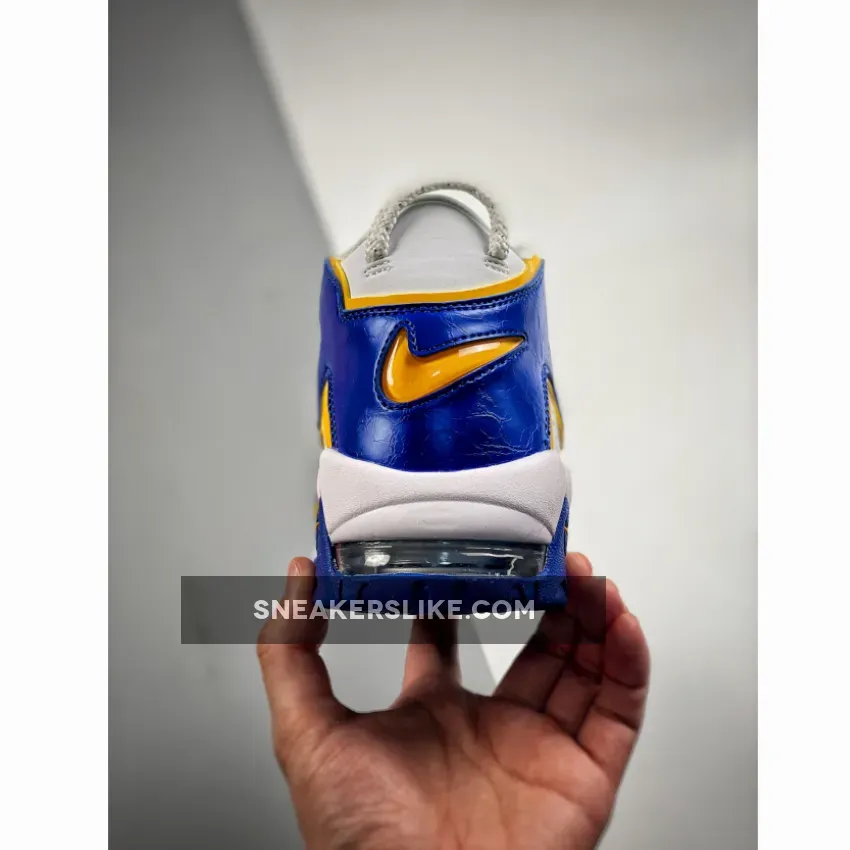 Nike’s big and bold performance basketball silhouette, the Air Uptempo, has just released a tribute to San Francisco’s professional basketball team, the Golden State Warriors. This smaller-sized Air More Uptempo has a “White/ Yellow Ochre/ Game Royal/ Black” colour palette. The base and overlays of this shoe are basic white, both on the sidewalls and the toe cap. This makes the oversized “AIR” patches on the medial and lateral mid-panels stand out in Game Royal and Yellow Ochre, the Golden State’s team colours. This colour scheme repeats on the tongue and the jelly Swoosh-adorned heel panels. An embroidered Yellow Ochre mini Swoosh also sits on the toe boxes.