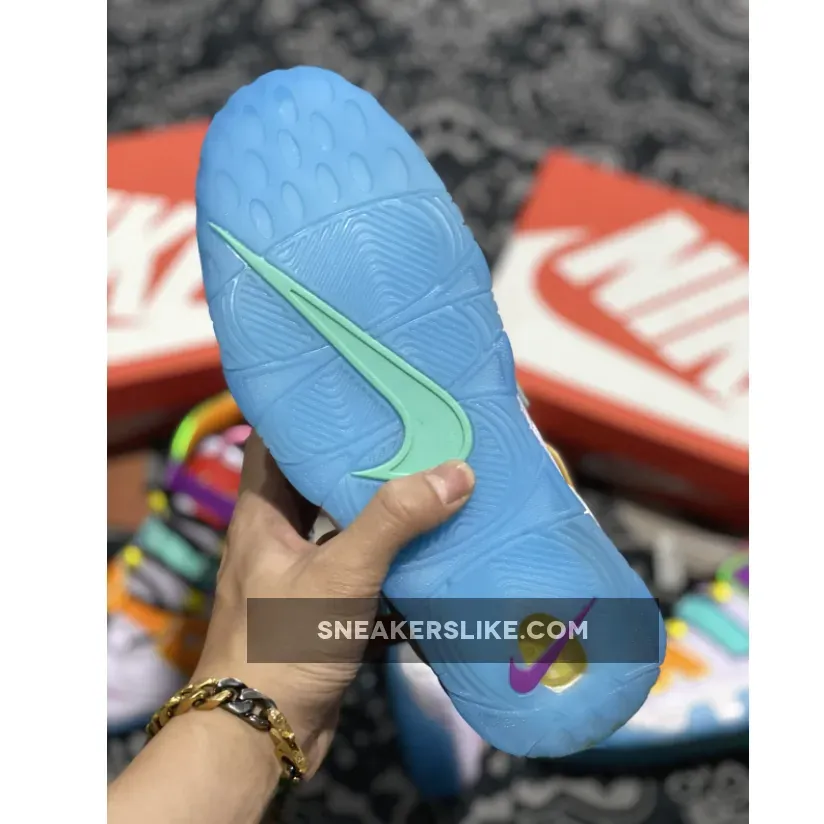 While mismatched from foot to foot, both start out on a Barely Grape canvas base and rest atop white midsoles and the aforementioned icy outsoles. It’s gold-branded red tongue tags, black laces and grape liners are the last consistencies before the displacement begins. Letter overlays arrive in aqua, orange, purple, each with contrast stitching and alternate underlays of blue, yellow, and green. Pulls are either pink or yellow (to alternate with their respective eyelet plastics), whilst liners opt for orange and lavender. Air supports, too, change colors between feet, with the left settling on red, and the right on yellow — each of which is matched in color on the lateral Swoosh branding. The pair is then complete with a set of rear jewel Swooshes in yellow and aqua respectively.