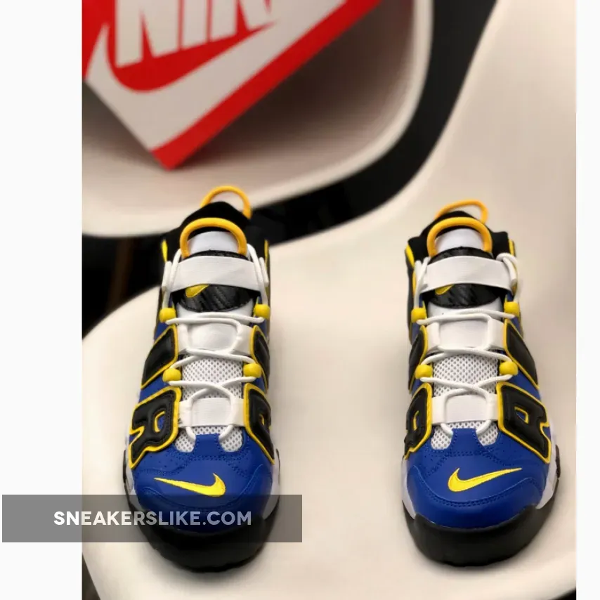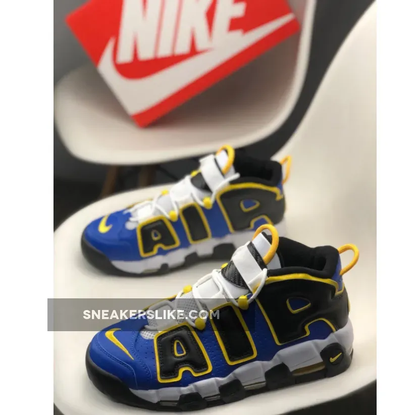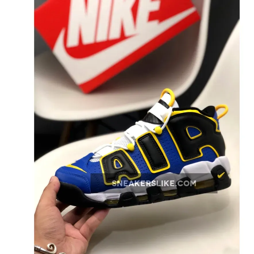 This Nike Air More Uptempo features a Game Royal, Black, White, and Speed Yellow color combination. Blue leather covers the base while the large ‘AIR’ branding is done in Black and outlined in Yellow. Additionally, more Yellow is seen on the Swoosh logos and eyelets while carbon fiber lands on the tongue label. Meanwhile, White hits the tongue, laces, midsole, and Black covers the outsole. Lastly, we have a peace sign and basketball on the insoles.