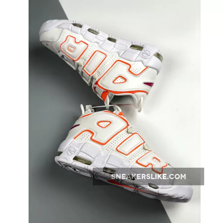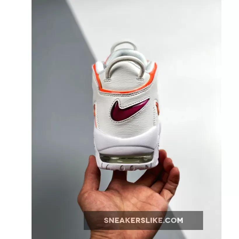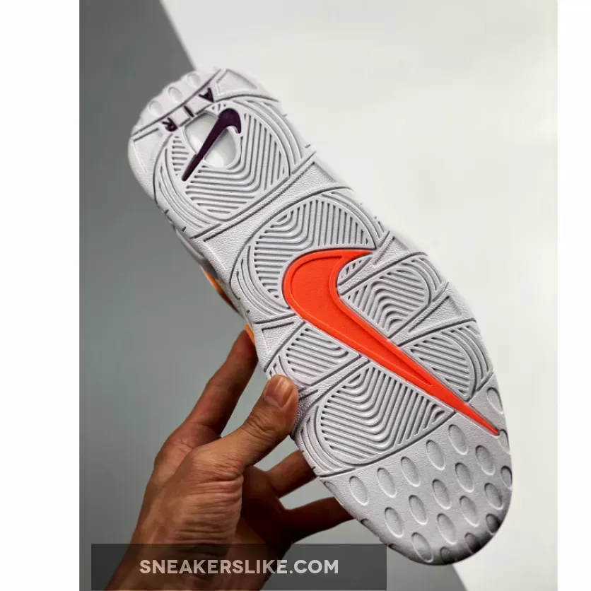 This latest offering of the Nike Air More Uptempo features an all-White leather upper with signature perforations on the sides with an embroidered Swoosh on the toe and mesh tongues. Highlighting the shoe is an Orange hue outlining the oversized “AIR” lettering paired with Purple detailing on the tongues, heels, mismatched insoles and outsole.